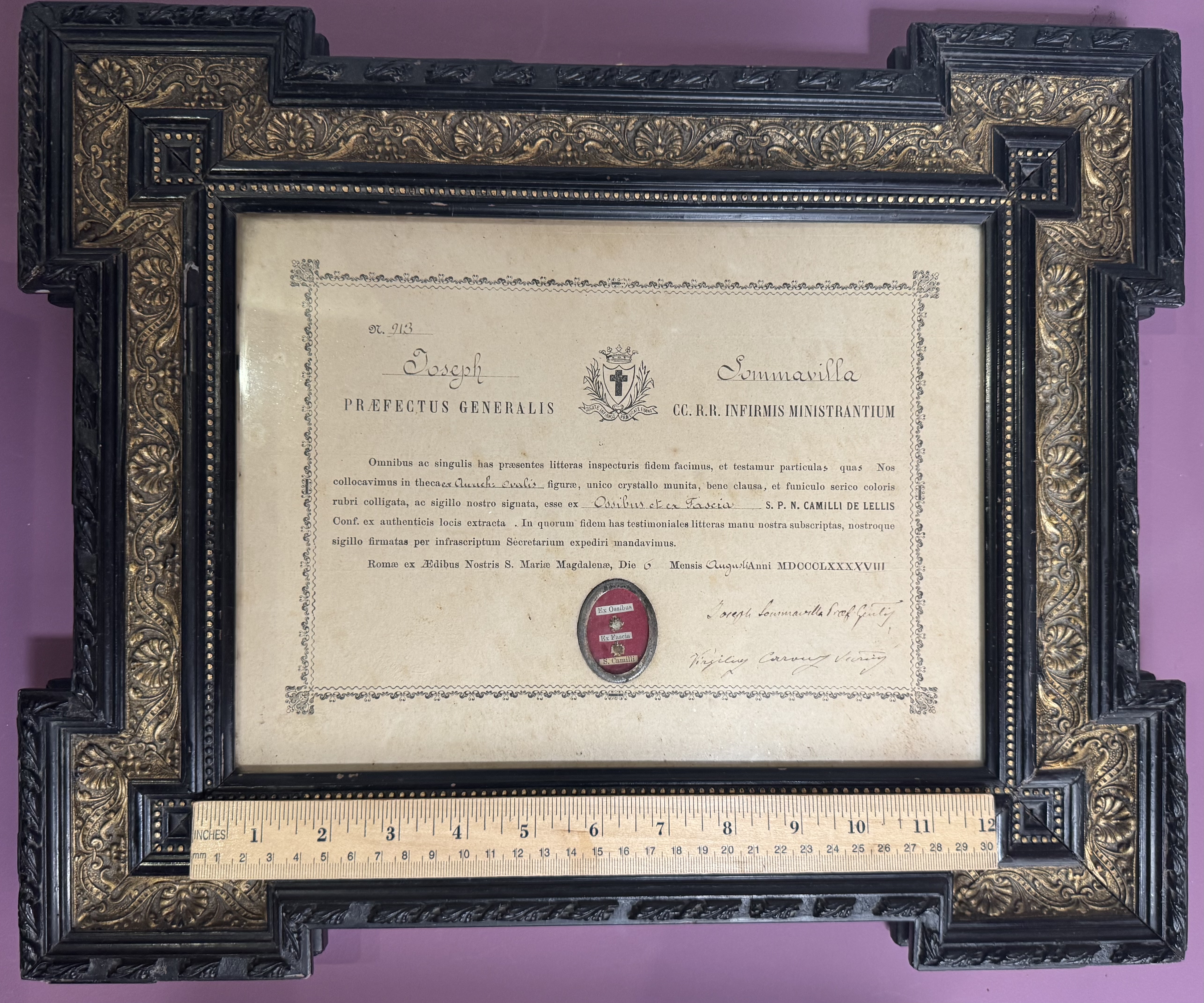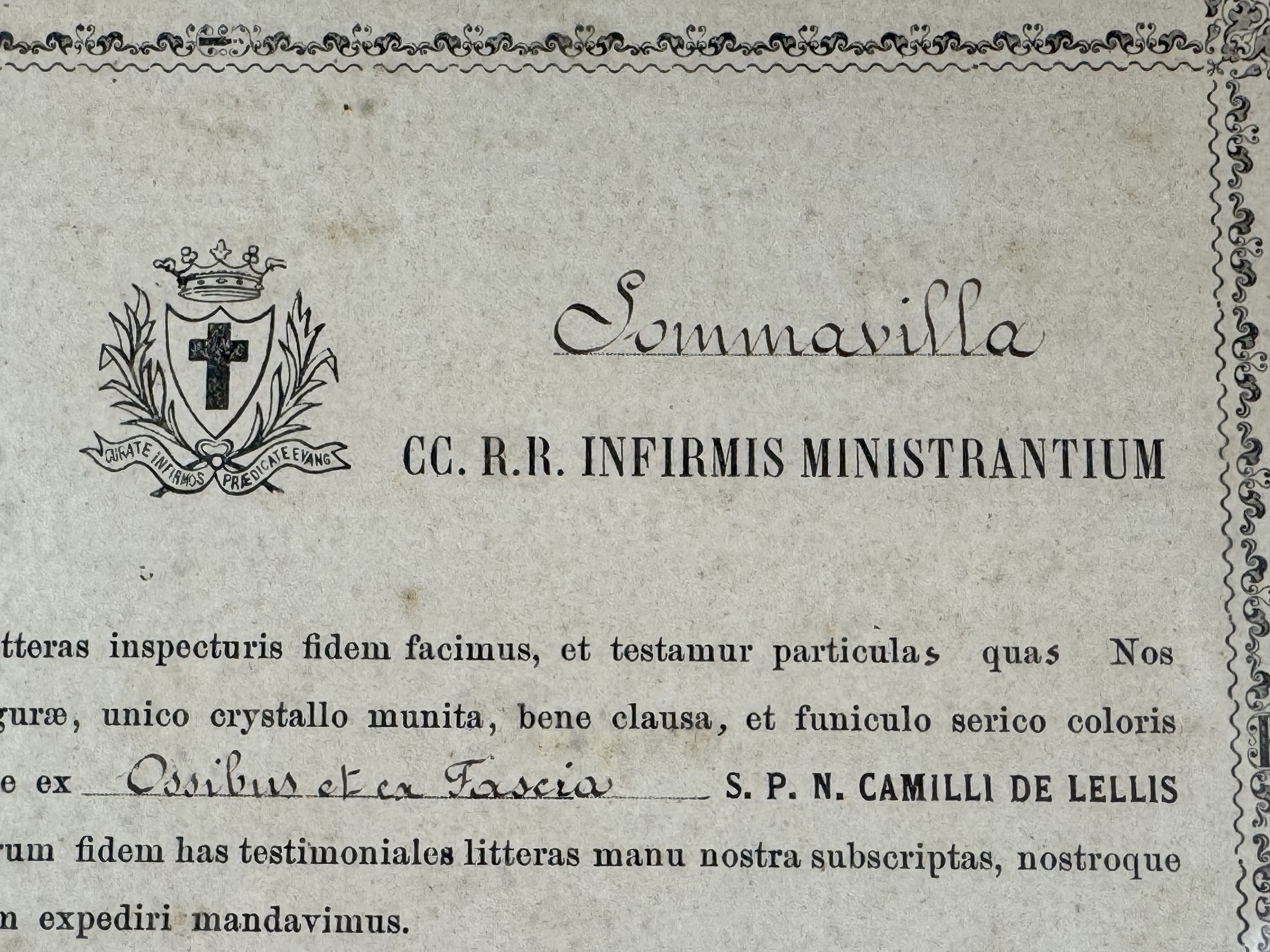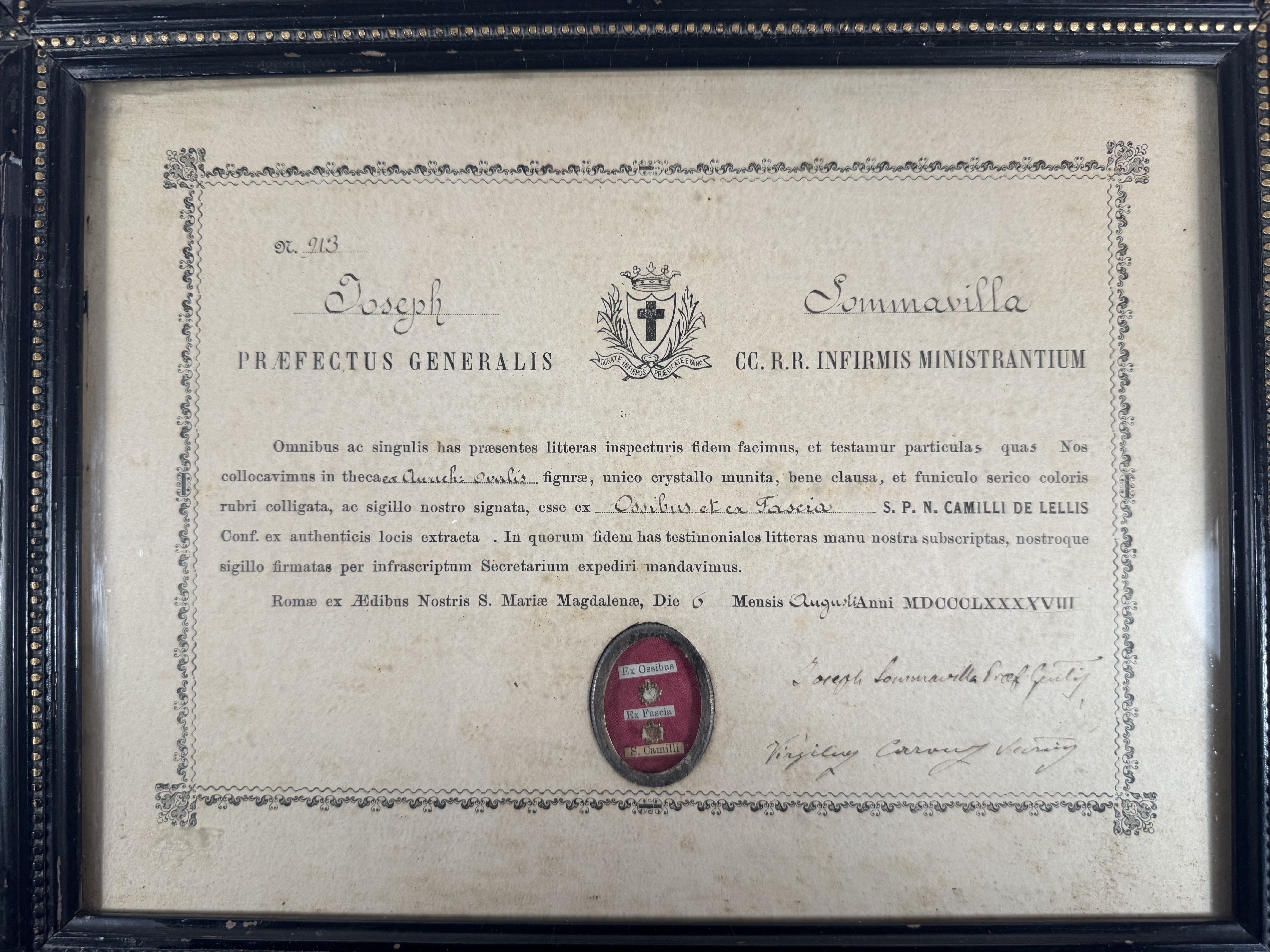 Oval silver glass-fronted reliquary housing ex ossibus (of the bone) and ex fascia (of the bandage) relics of Saint Camillus de Lellis. The relics are affixed to a silk ground and identified in Latin on a manuscript cedula label as Ex Ossibus // Ex Fascia // S. Camilli (of the bone and of the bandage of Saint Camillus [de Lellis]). The reliquary is accompanied by the original matching authentics document issued in 1898 by Joseph Sommavilla, Prefect General of the Order of Clerks Regular, Ministers of the Infirm at the Church of St. Mary Magdalene in Rome, where Saint's mortal remains are located. The reliquary is framed in an attractive period glass-fronted frame.