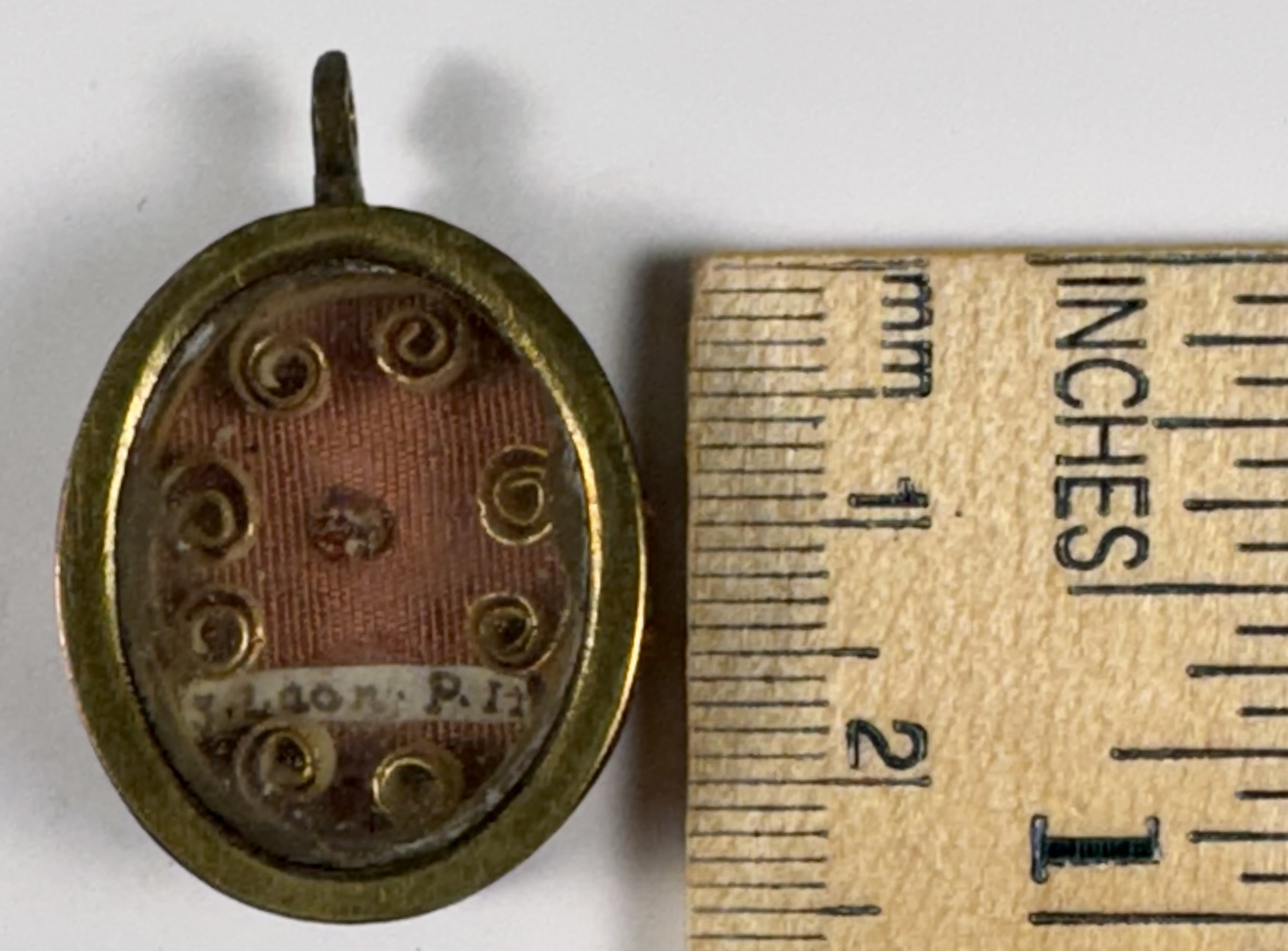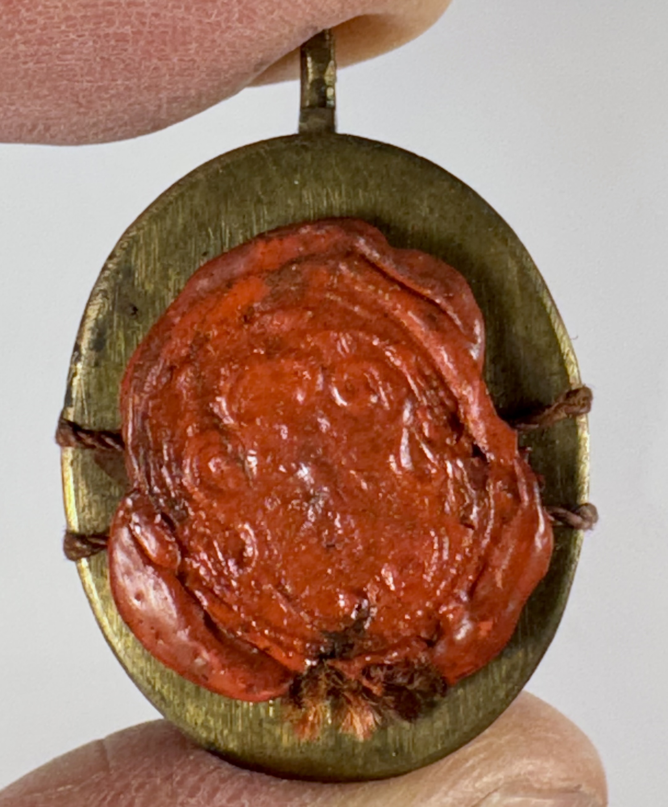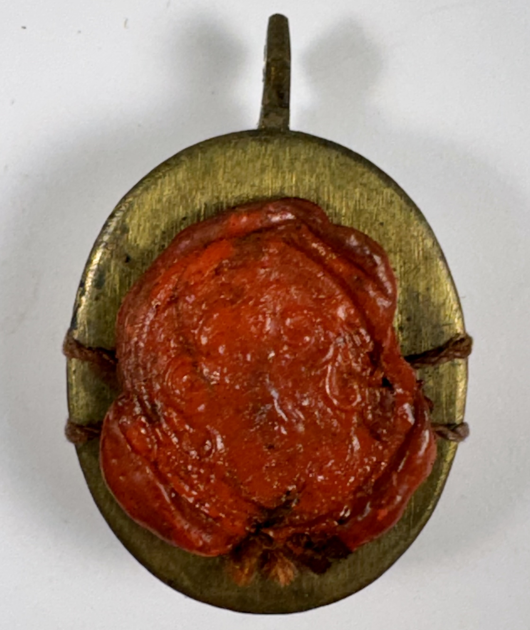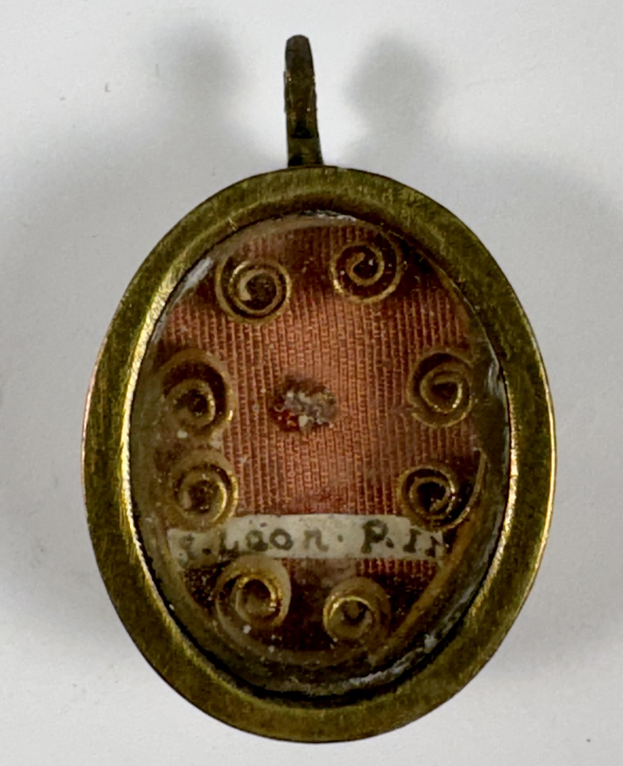 Oval glass-fronted brass pendant reliquary theca housing first-class ex ossibus (of the bone) relic of Saint Leonard of Port Maurice. The relic is affixed to a red silk ground, surrounded by gilt paperolle ornamentation, and identified in Latin on a manuscript cedula label as S. Leon. P. M. (Saint Leonard of Port Maurice). On the back, the theca is secured with a perfectly preserved seal of red Spanish wax bearing an imprint of a coat of Fr. Antonio Cantoni (†1781), Bishop of Faenza, Italy (1742–1767) and Archbishop of Ravenna, Italy (1767–1781).