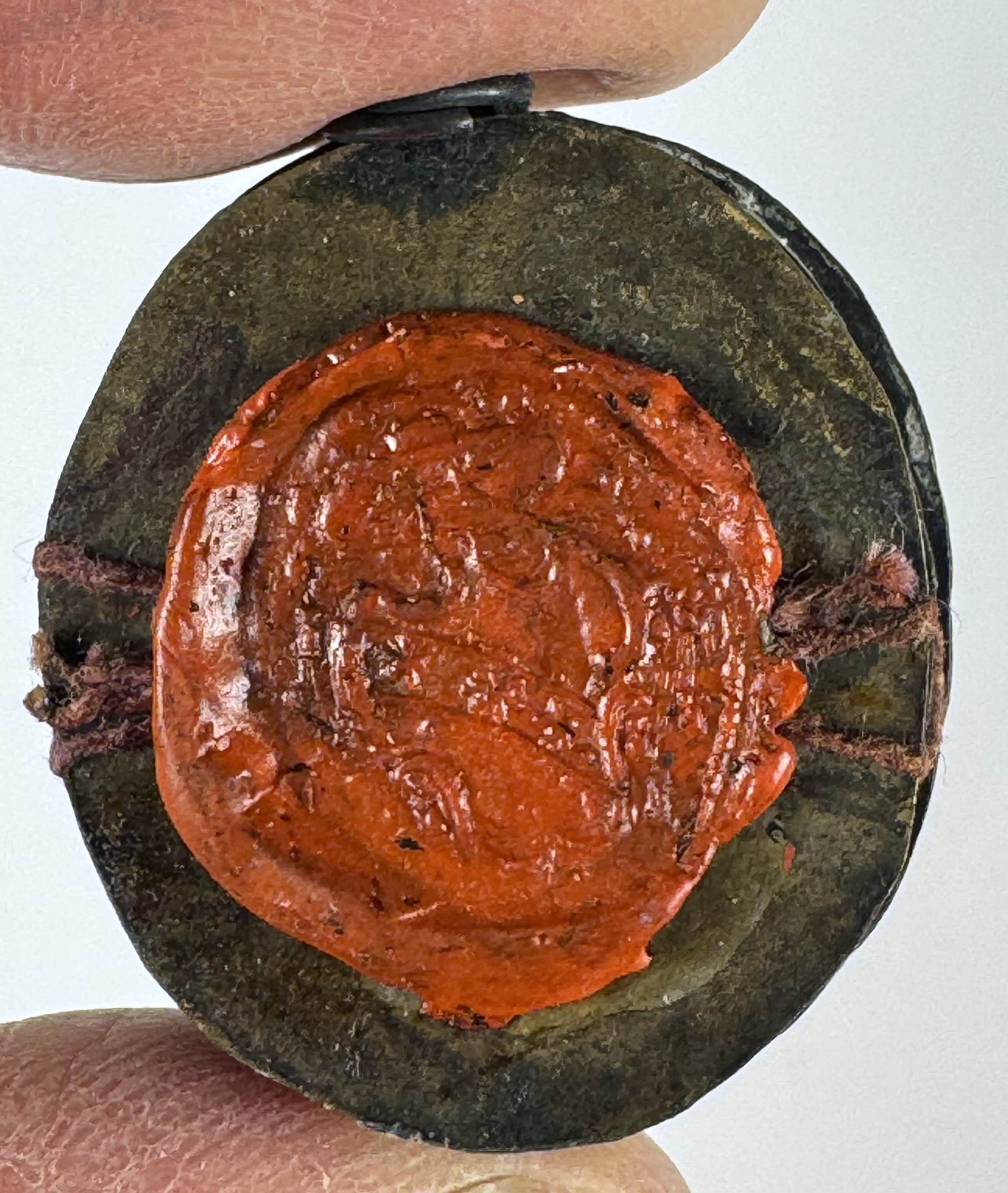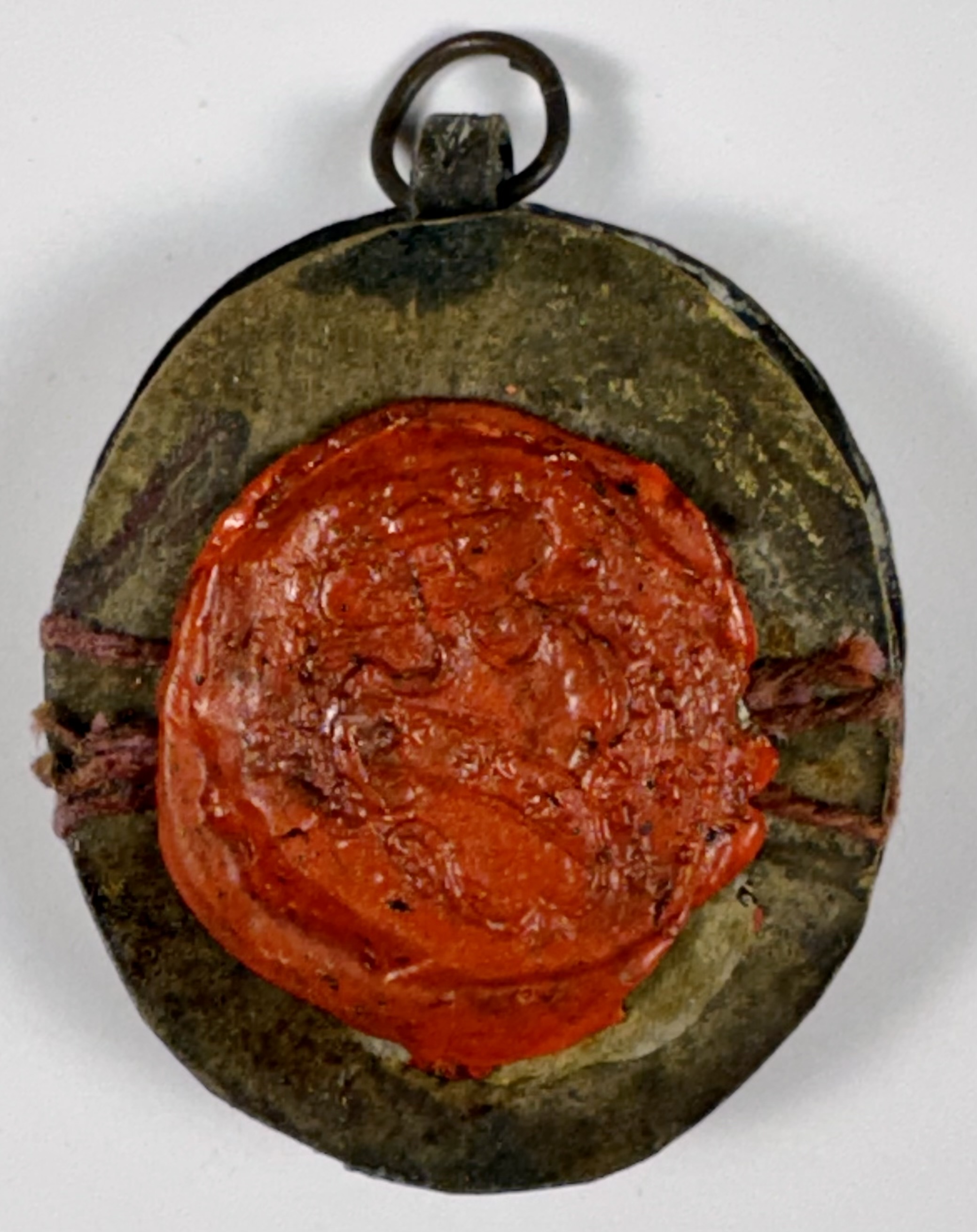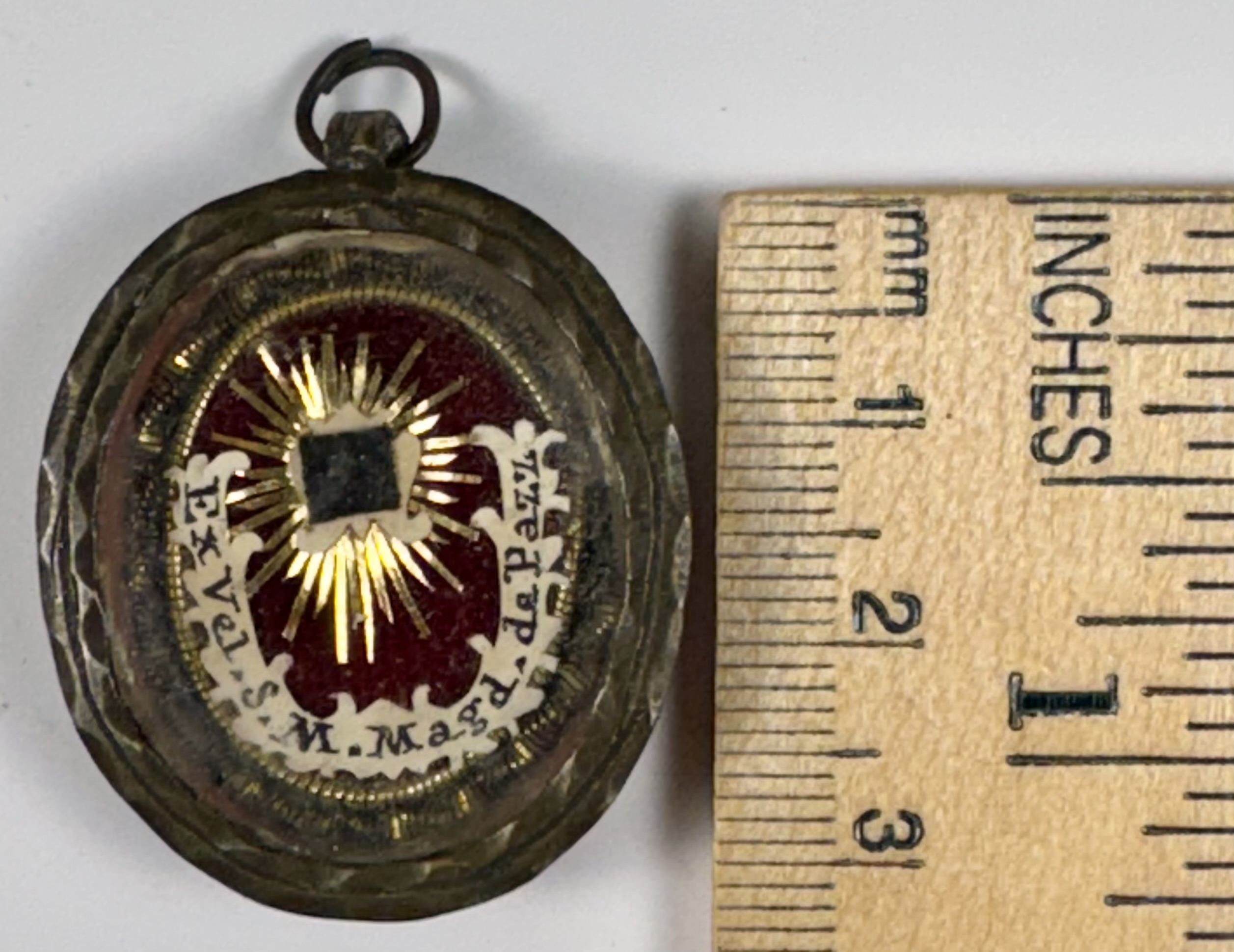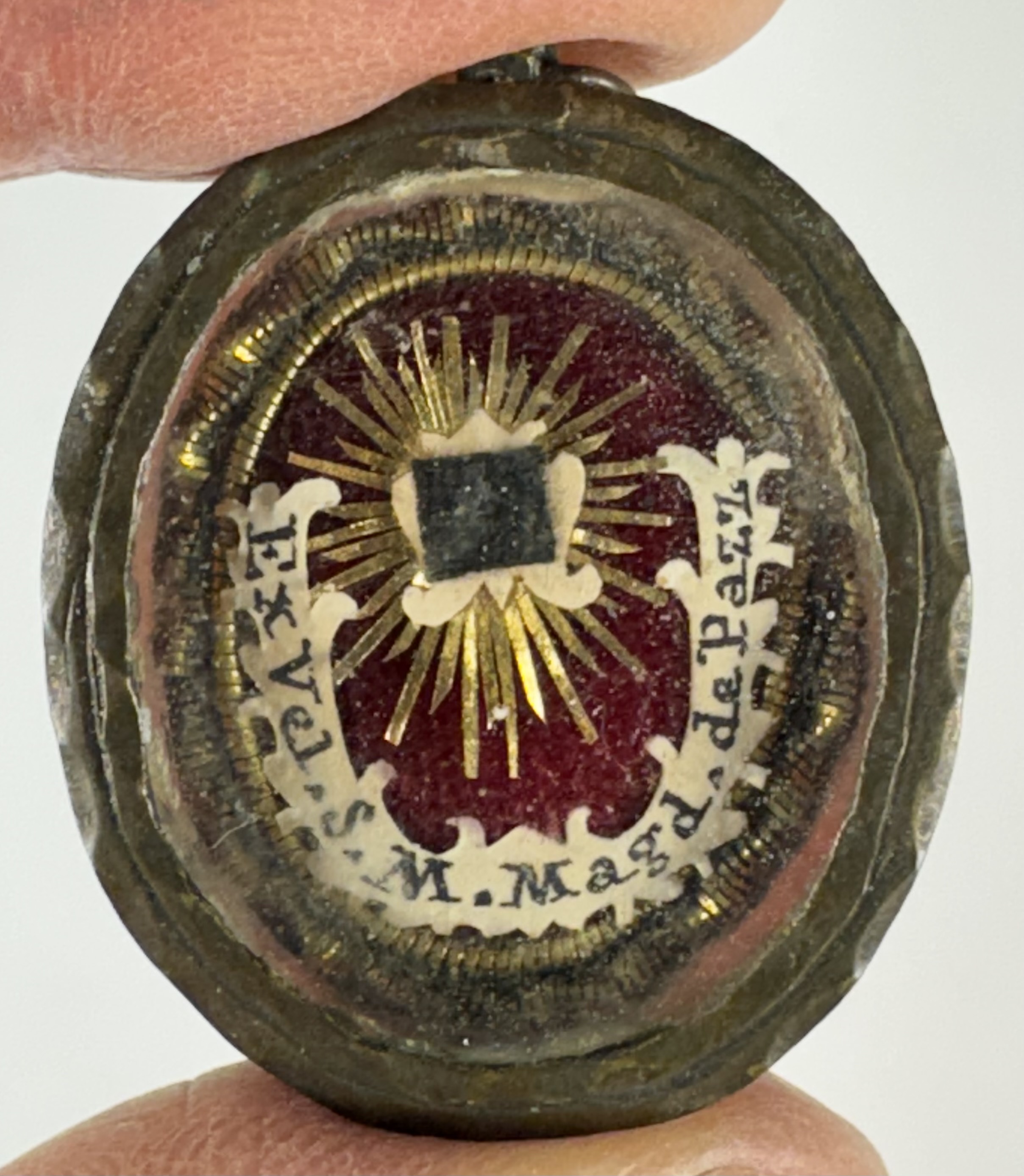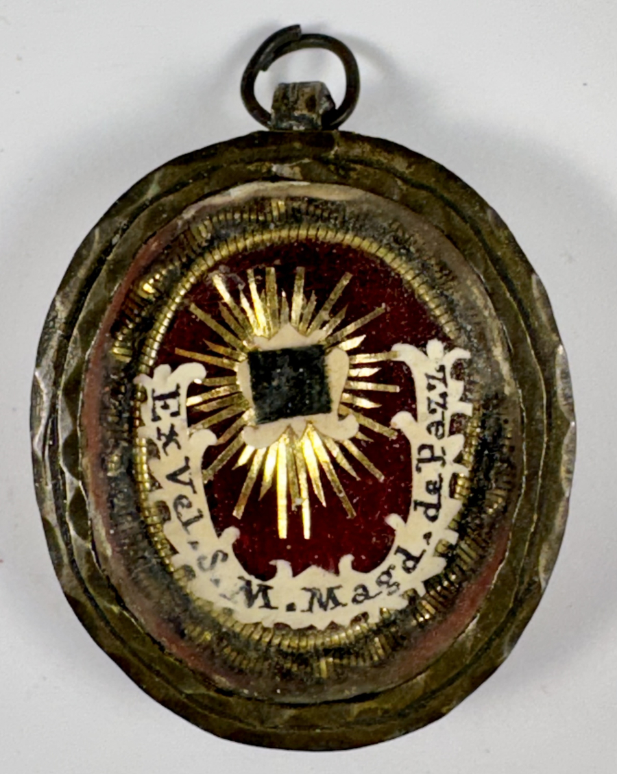 Oval brass glass-fronted pendant reliquary theca housing second-class ex velo (of the veil) of ​​Saint Mary Magdalene de' Pazzi. The relic is affixed to a gilt paper burst on a background of red silk ground surrounded by silver wire ornamentation and identified in Latin on a manuscript cedula label as Ex Vel. S. M. Magd. de Pazz (From the veil of Saint Mary Magdalene de' Pazzi). On the back, the theca is secured with a perfectly preserved seal of red Spanish wax bearing an imprint with a coat of arms of Fr. Francesco Maria Ginori (†1775), Bishop of Fiesole, Italy (1736–1775).