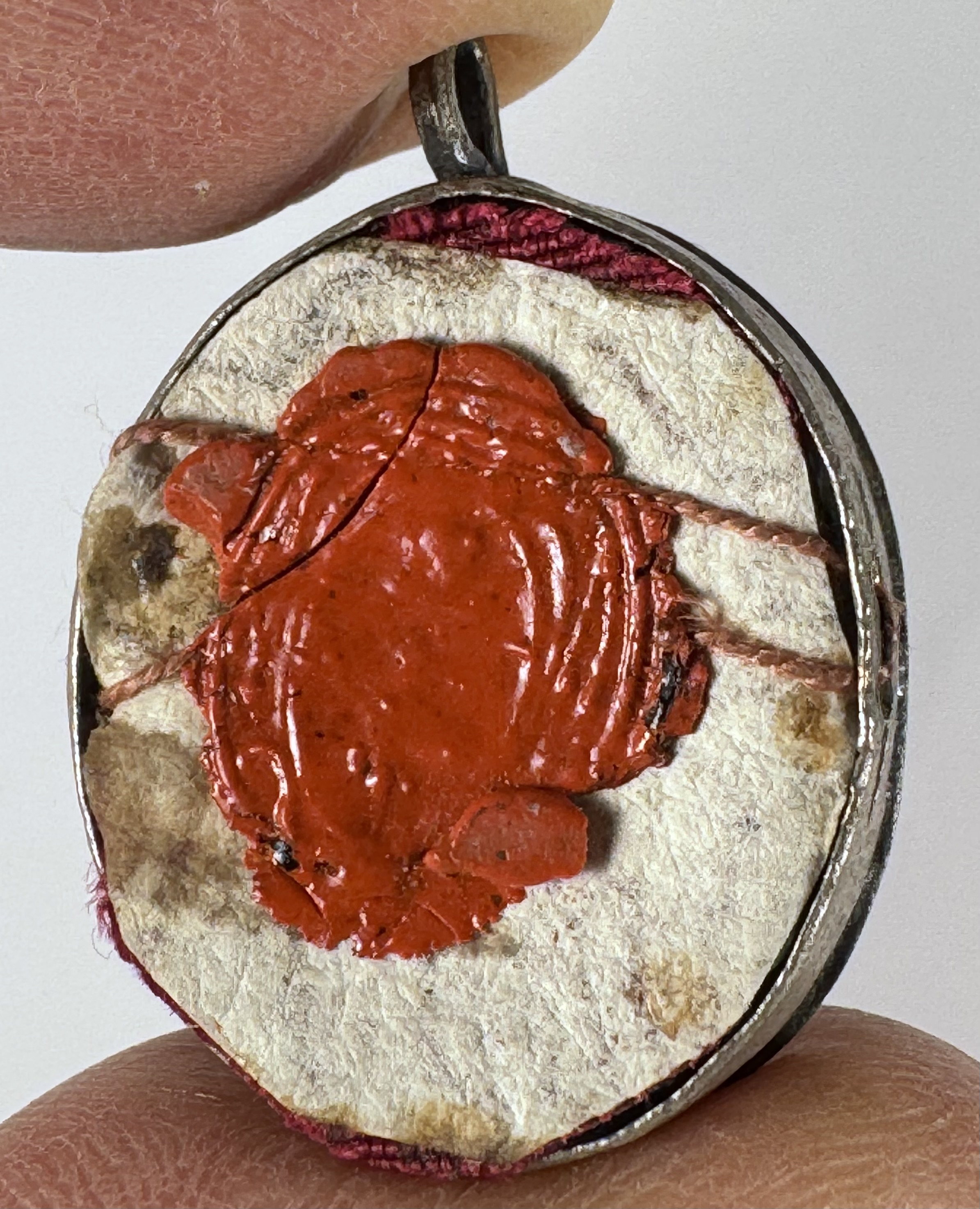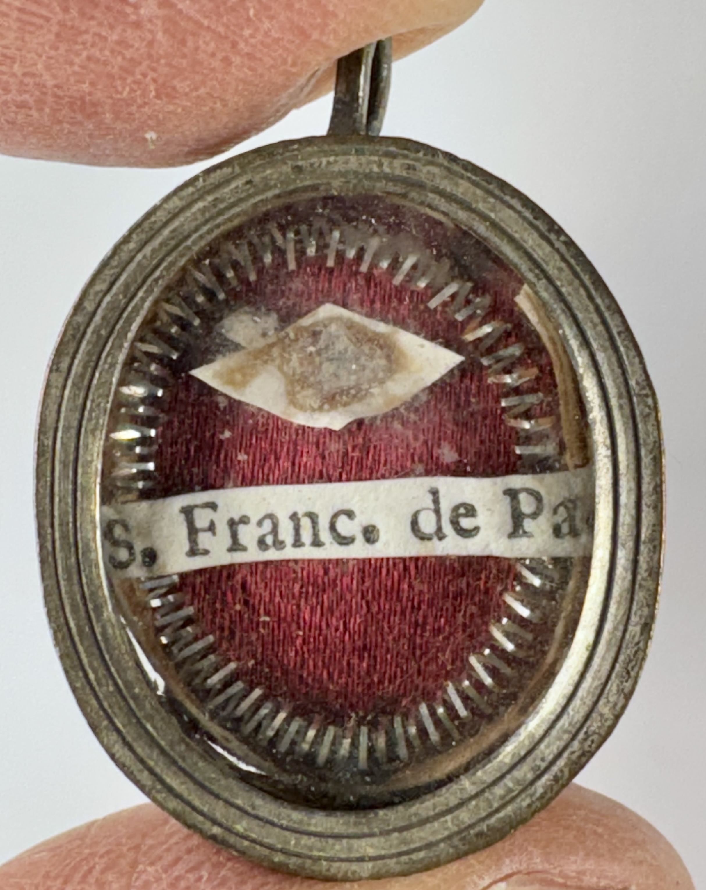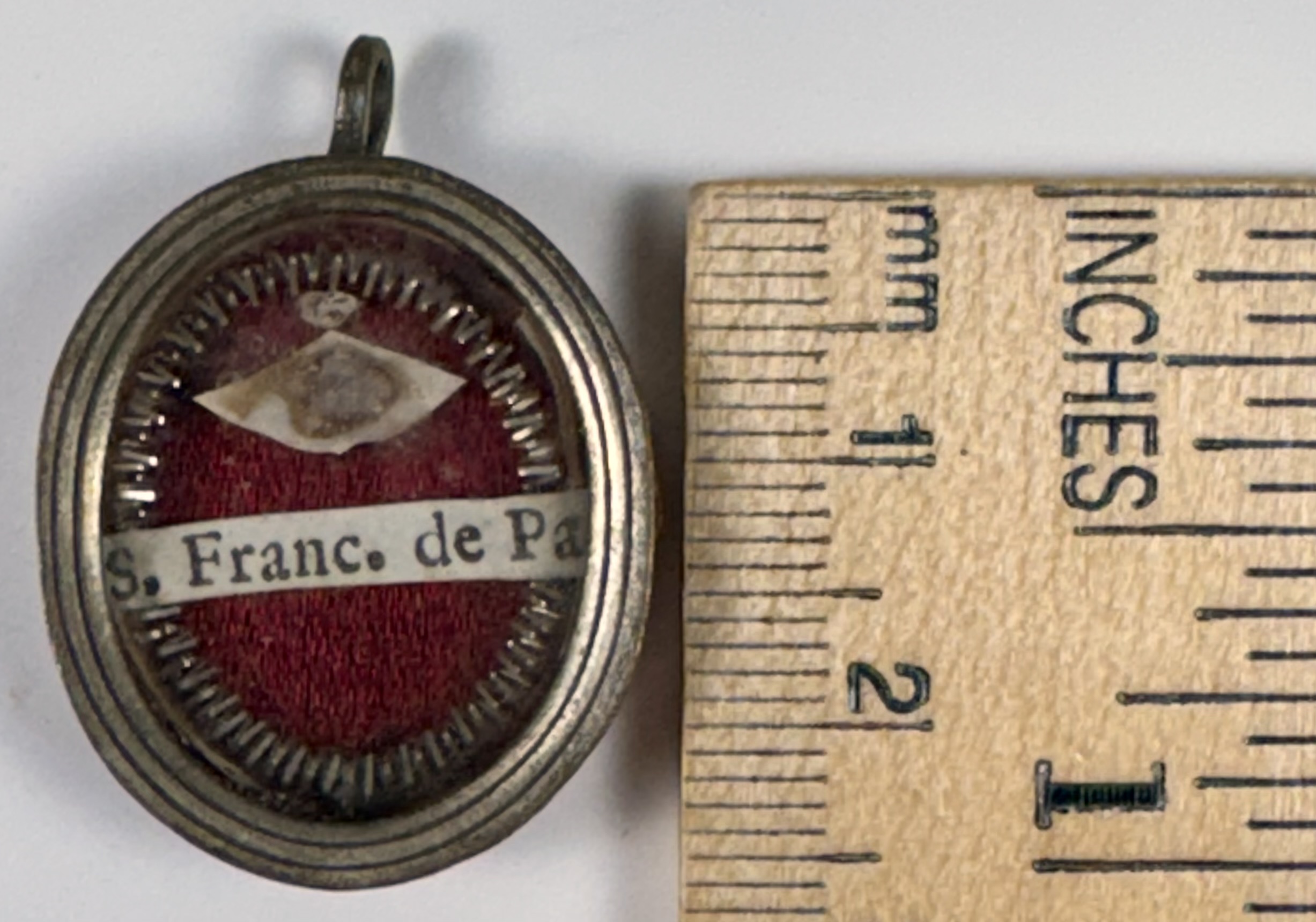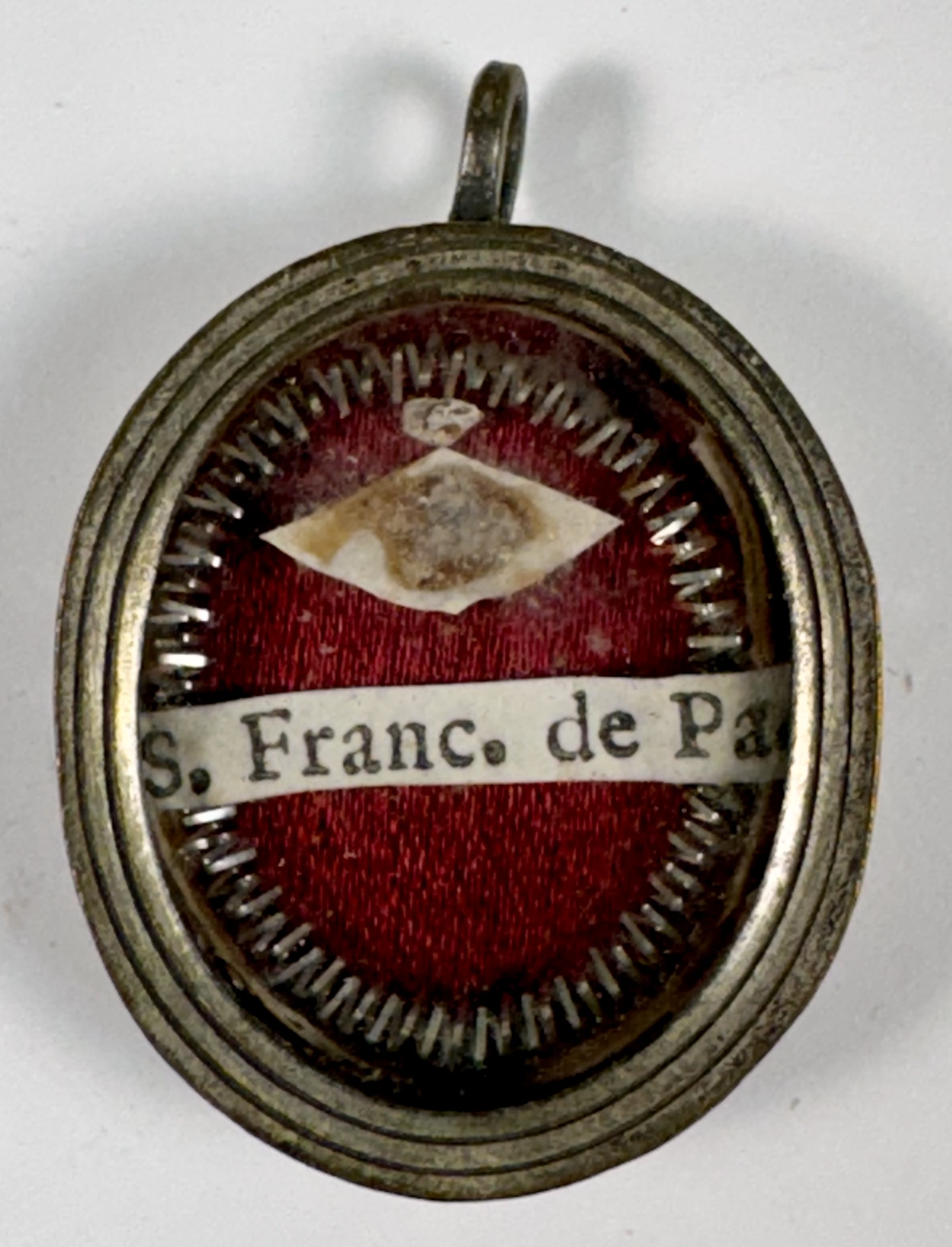 Oval glass-fronted silvered brass pendant reliquary theca housing first-class Ex Ossibus (of a bone) relic of Saint Francis of Paola. A relic is affixed to a red silk ground, surrounded by silver wire ornamentation, and identified in Latin on a typeset cedula label as S. Franc. de Pa. (Saint Francis of Paola). On the back, the theca is secured with a perfectly preserved seal of red Spanish wax bearing a faint imprint of a coat of arms of Fr. Giuseppe Bartolomeo Menocchio, O.E.S.A. (†1823), Titular Bishop of Porphyreon (1800–1823) and Sacristan of His Holiness Pius VII.