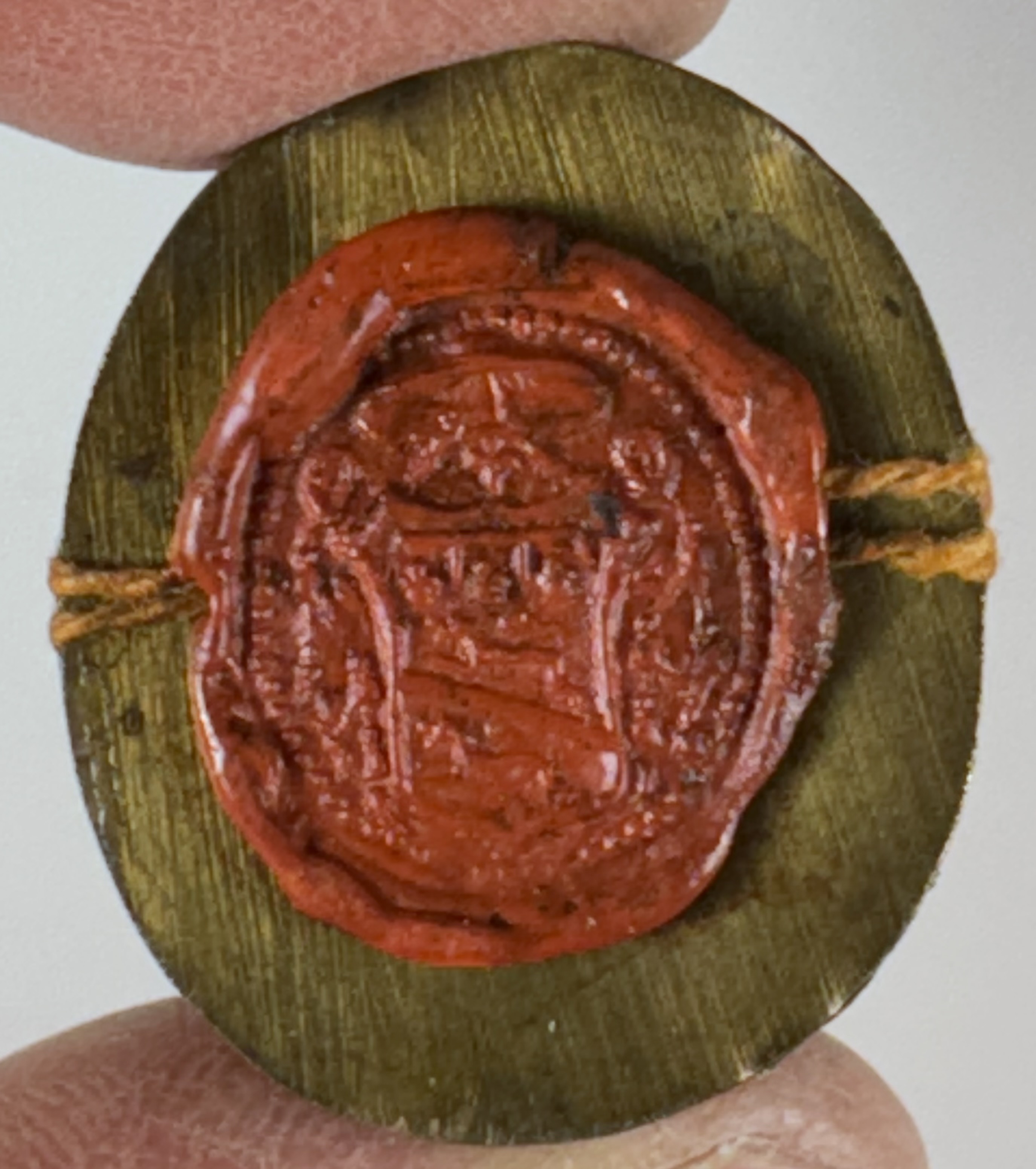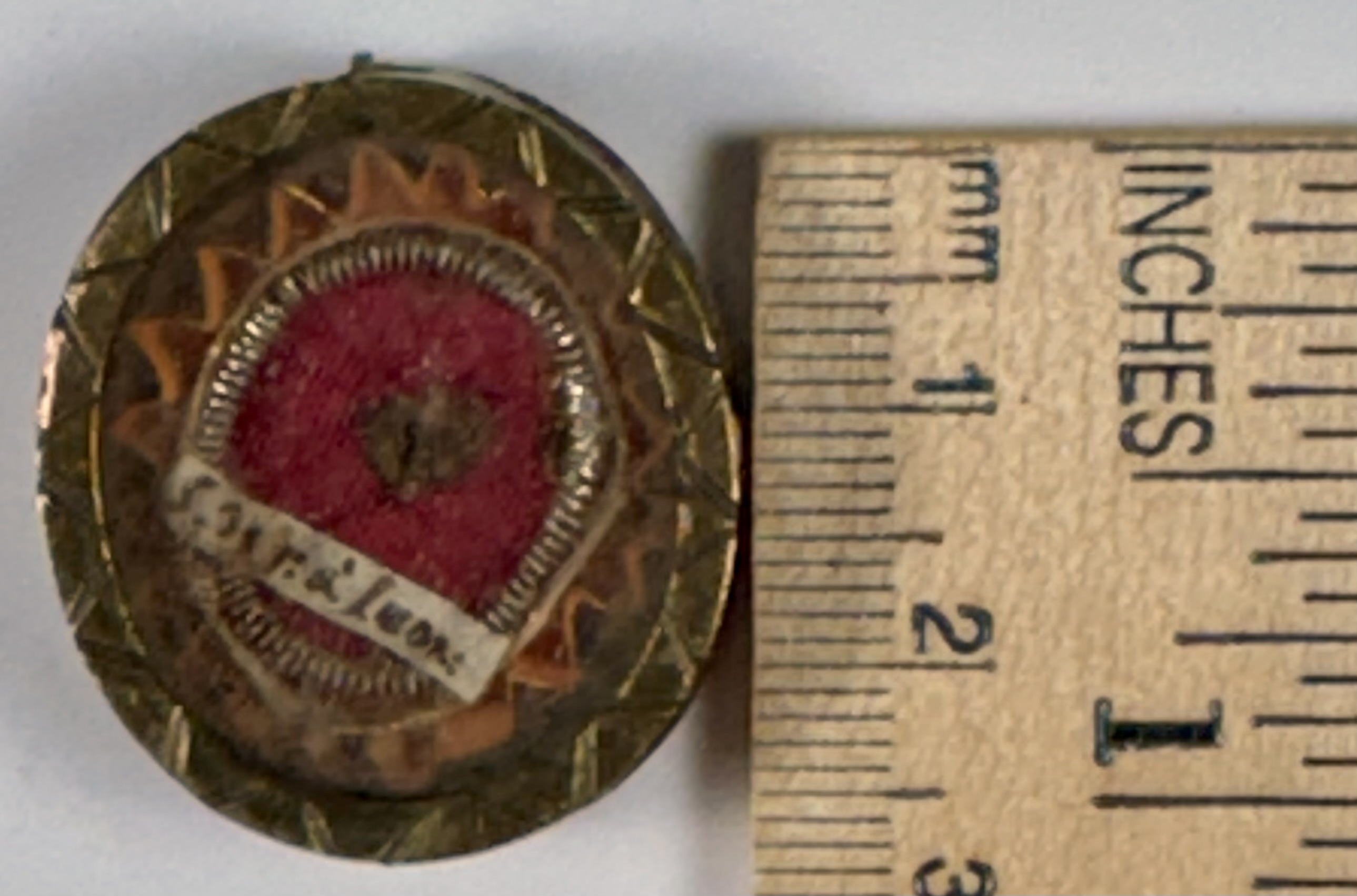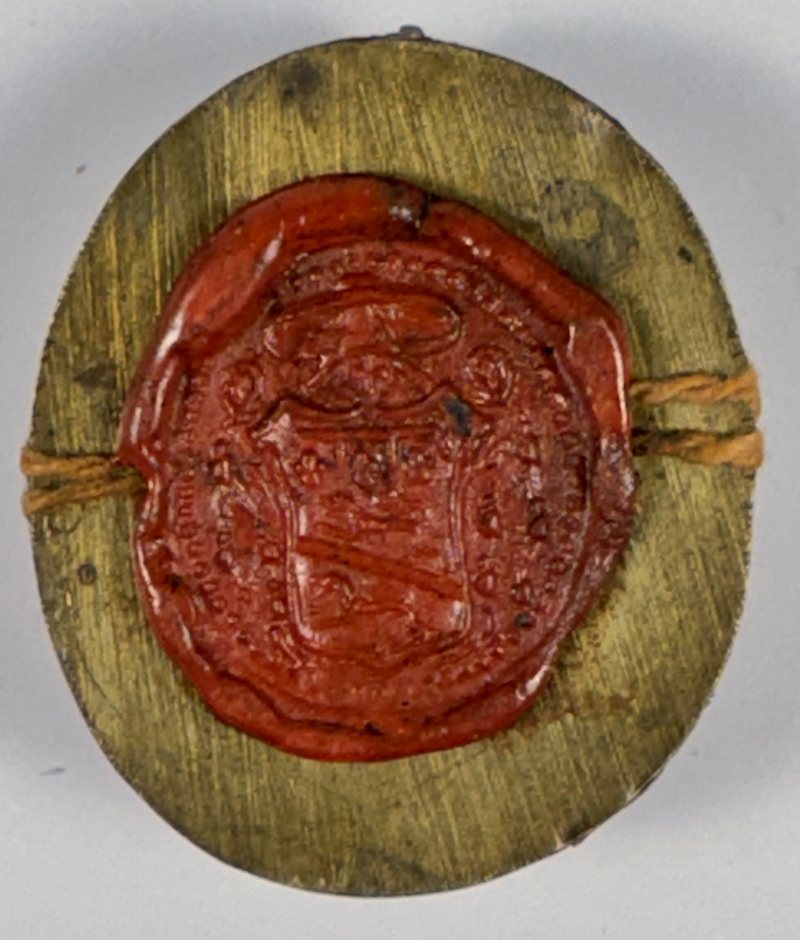 Oval glass-fronted brass reliquary theca housing relic of Saint Joseph of Leonessa, O.F.M. Cap. The relic is affixed on a background of silk, surrounded by a silver wire and gold paperolle ornamentation and identified in Latin on a manuscript cedula label as S. Jos. a Leon. (Saint Joseph of Leonessa). The reliquary is secured by the perfectly preserved seal of red Spanish wax with a coat of arms of Francesco Gaetano Incontri (†1781), the Archbishop of Florence, Italy (p. 1741-1781).