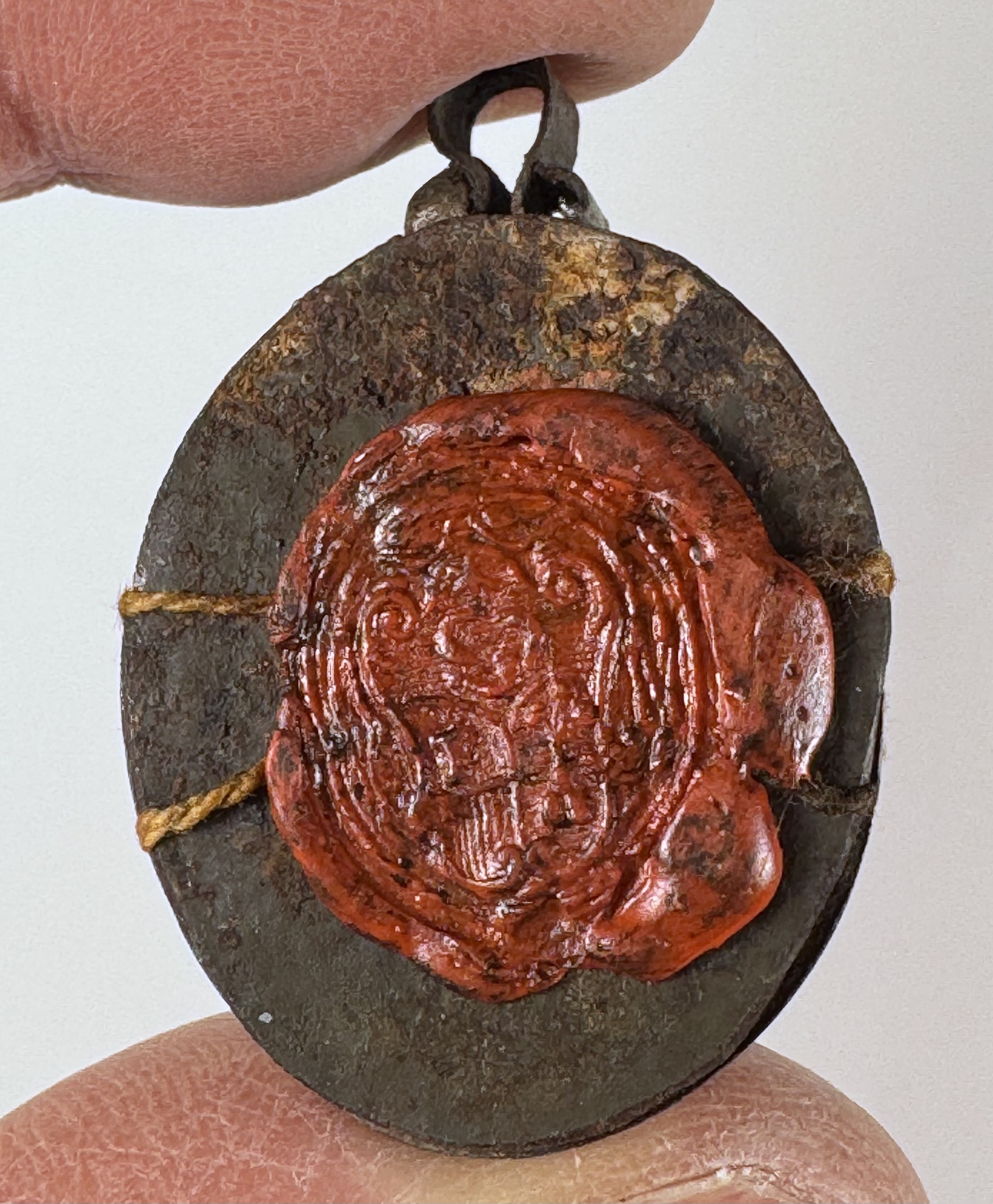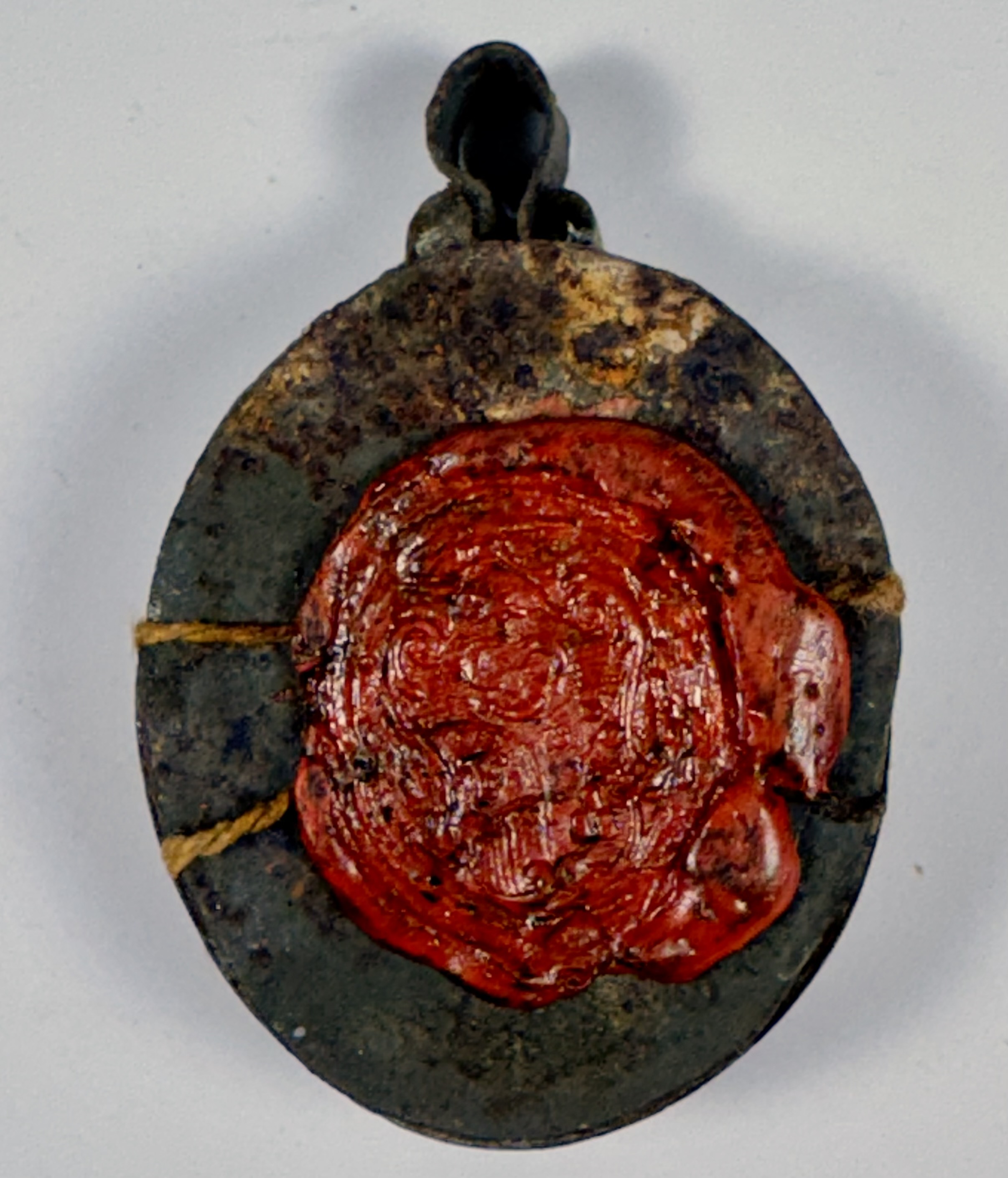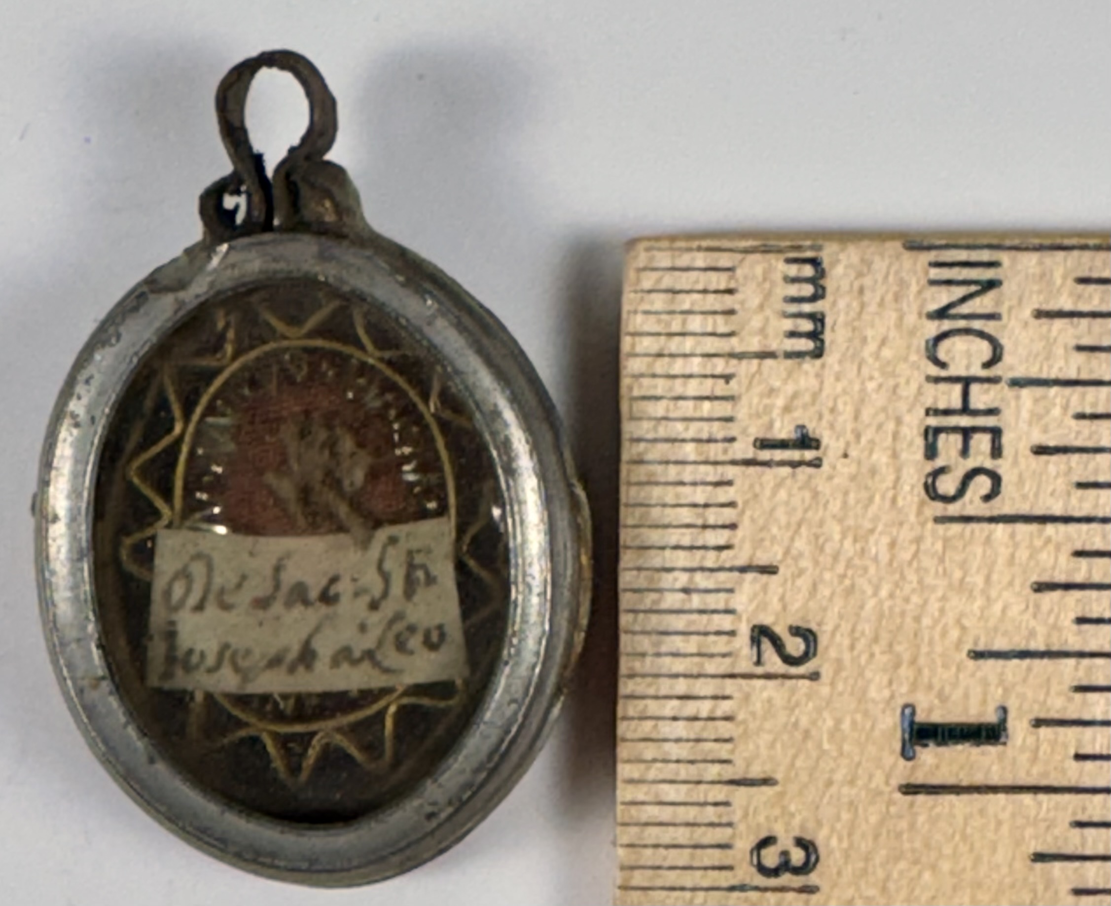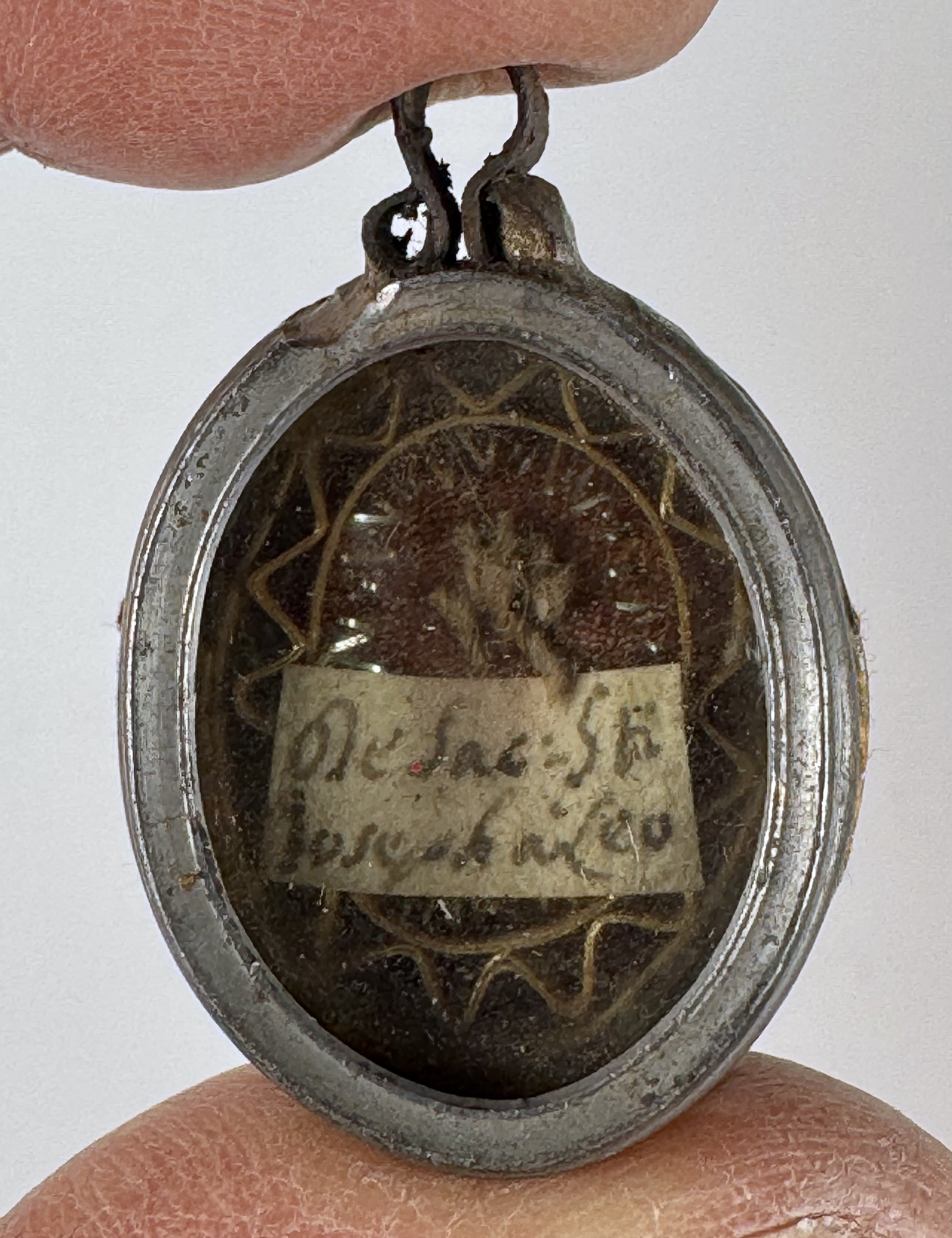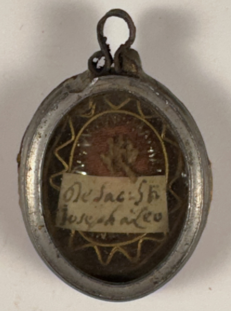 Oval glass-fronted white metal pendant reliquary theca housing relic of Saint Joseph of Leonessa, O.F.M. Cap. The relic is affixed on a background of silk, surrounded by a silver wire and gold paperolle ornamentation and identified in Latin on a manuscript cedula label as Ex Sac. Ste. Joseph a Leon. (Saint Joseph of Leonessa). The reliquary is secured by the perfectly preserved seal of red Spanish wax with a coat of arms of Bishop Nicola Angelo Maria Landini, O.E.S.A. (†1782), Titular Bishop of Porphyreon and Vicar General of the Vatican Curia.
