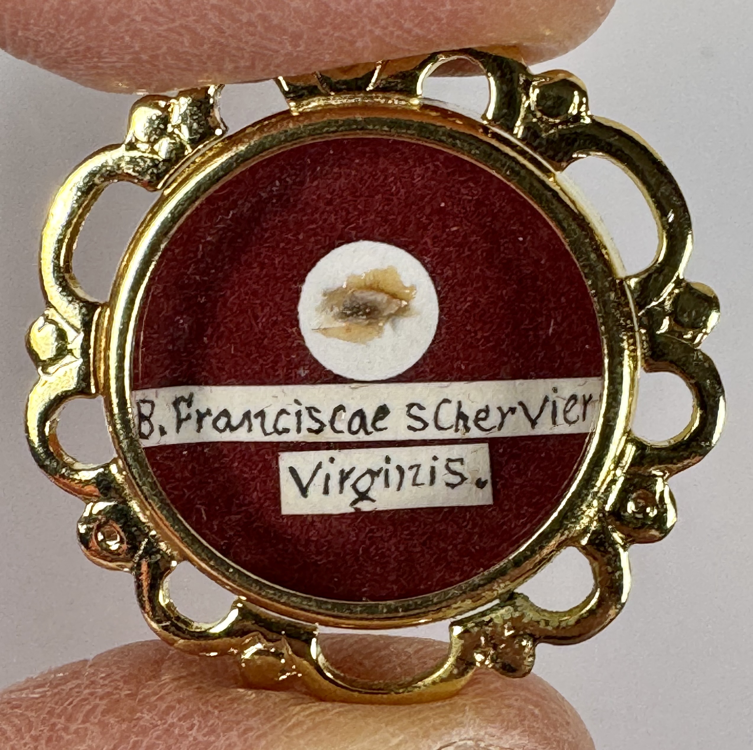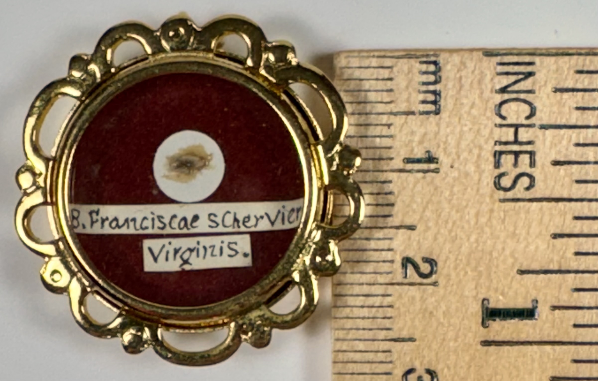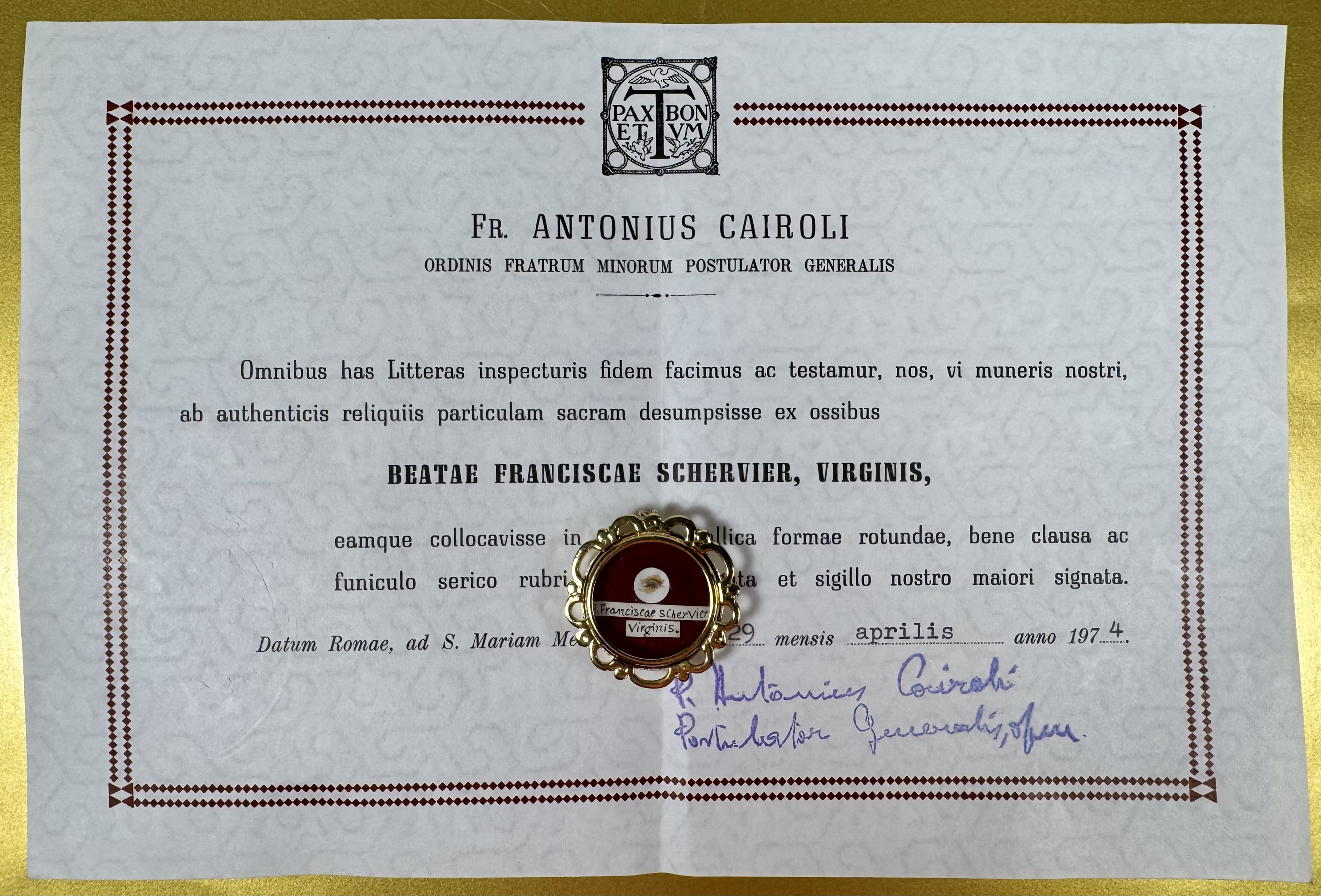 Round glass-fronted yellow-metal reliquary theca housing the first-class ex ossibus  (of the bone) relic of Blessed Mary Frances Schervier. The relic is affixed to a red silk ground and identified in Latin on a manuscript cedula label as B. Franciscae Schervier Virginis (Blessed Frances Schervier, Virgin).  On the back, under the protective cap, the theca is secured with a seal of red Spanish wax bearing an imprint of a coat of arms of the Order of Friars Minor (commonly known as the Franciscans). The relic is accompanied by the original matching authentics document issued and signed on 29 April 1974 (only a day after her beatification) by the Postulator General of the Order responsible for the cause of beatification and canonization.