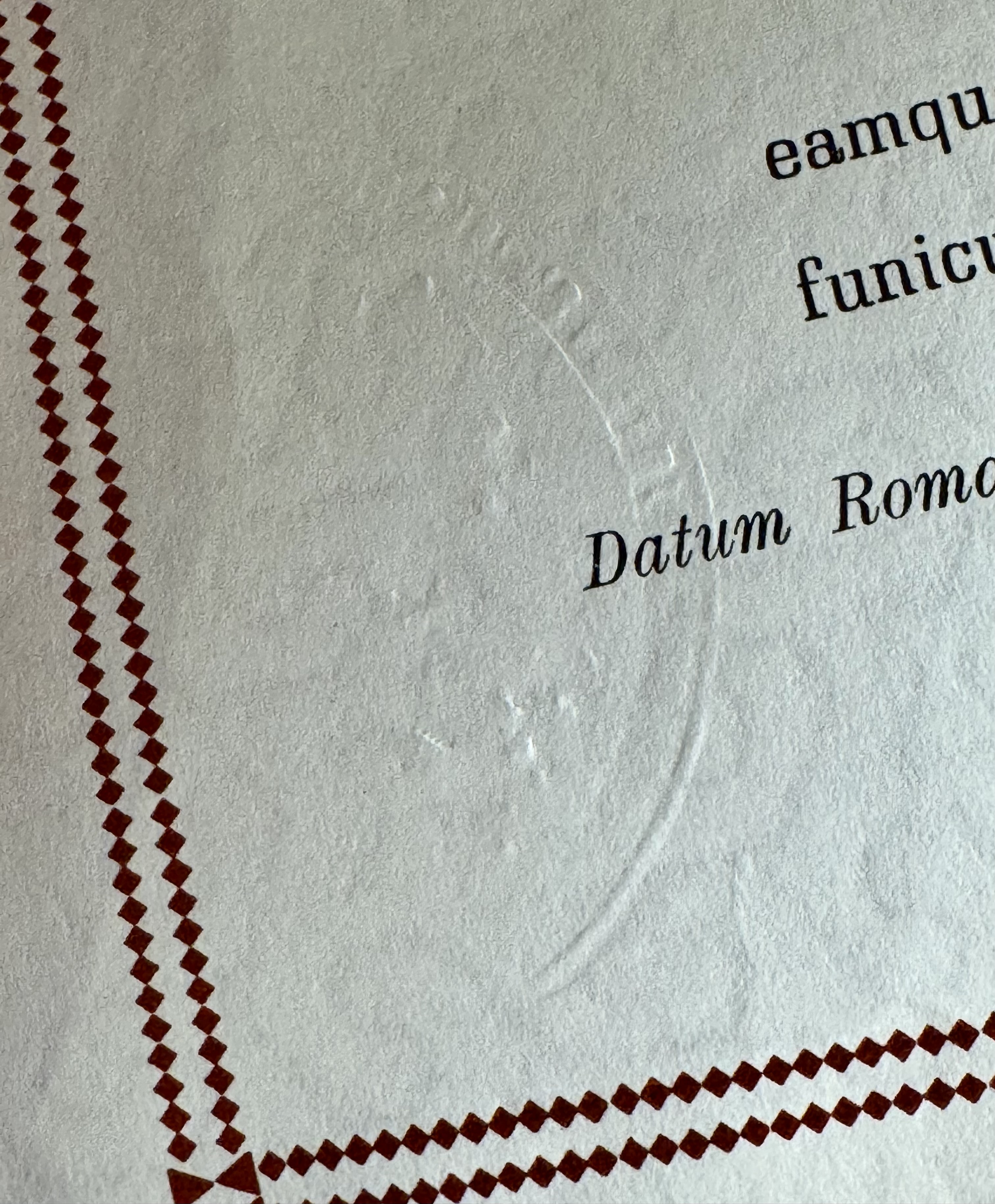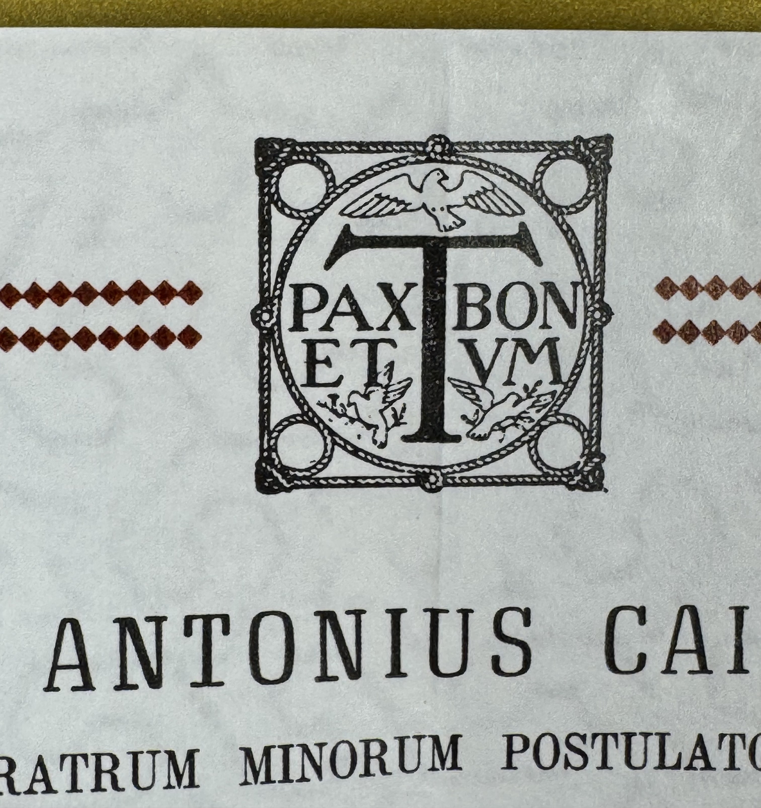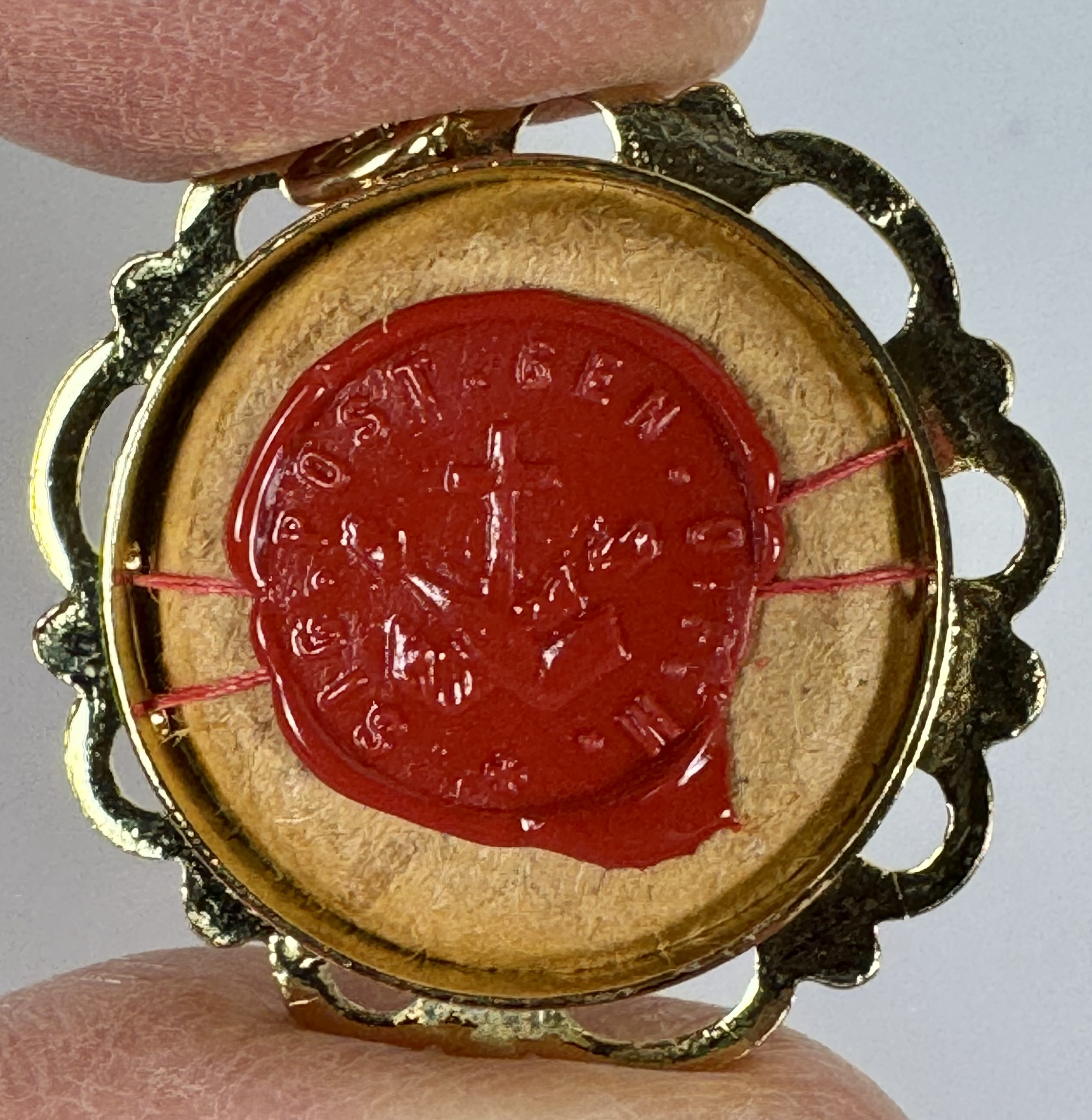 Round glass-fronted yellow-metal reliquary theca housing the first-class ex ossibus  (of the bone) relic of Blessed Mary Frances Schervier. The relic is affixed to a red silk ground and identified in Latin on a manuscript cedula label as B. Franciscae Schervier Virginis (Blessed Frances Schervier, Virgin).  On the back, under the protective cap, the theca is secured with a seal of red Spanish wax bearing an imprint of a coat of arms of the Order of Friars Minor (commonly known as the Franciscans). The relic is accompanied by the original matching authentics document issued and signed on 29 April 1974 (only a day after her beatification) by the Postulator General of the Order responsible for the cause of beatification and canonization.