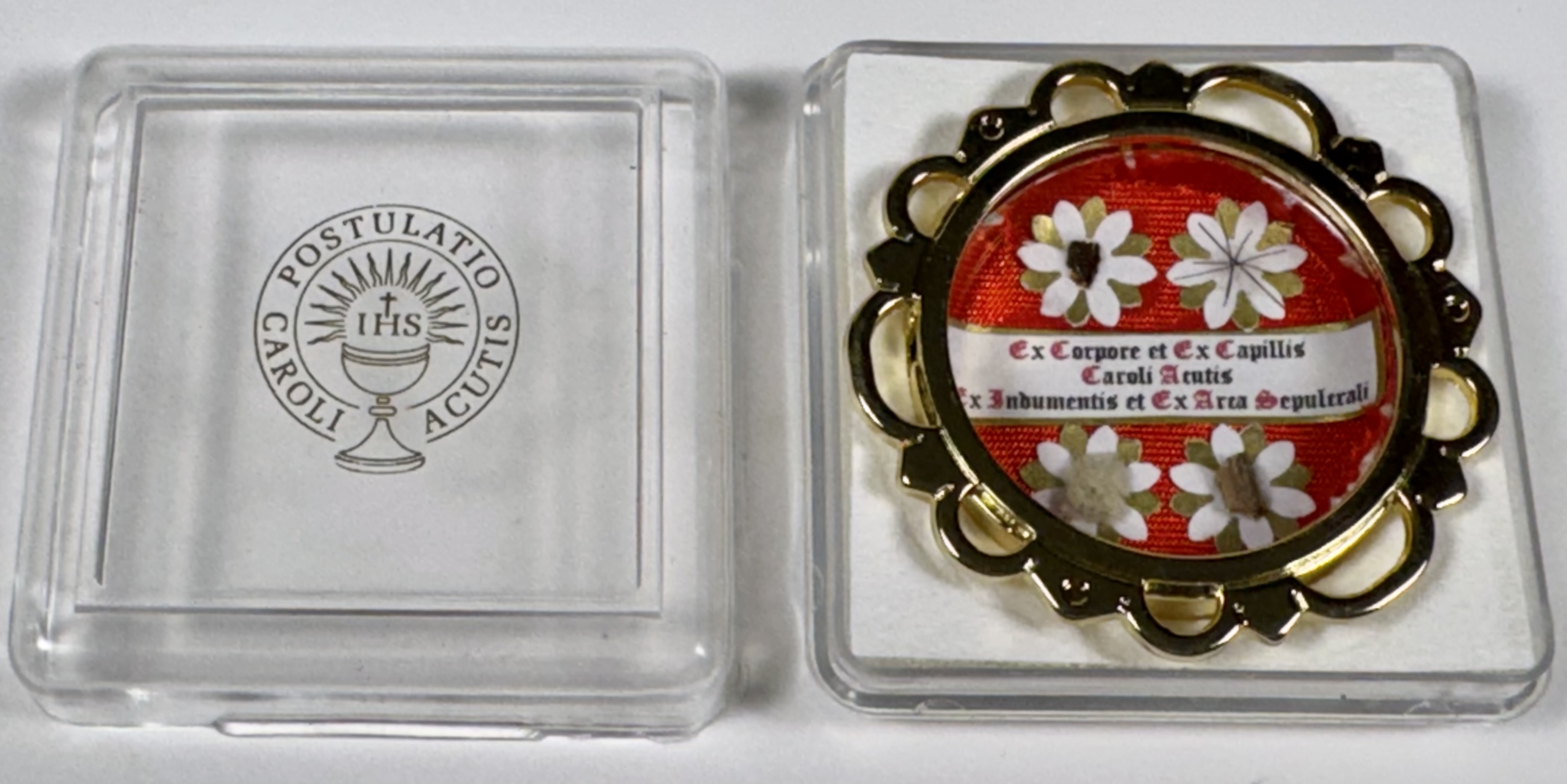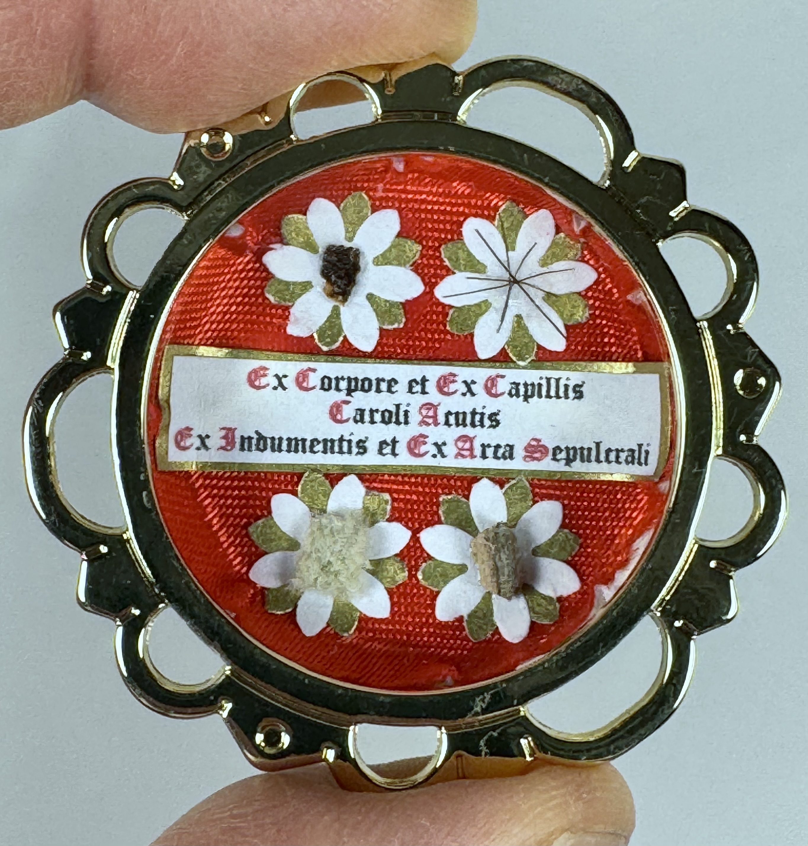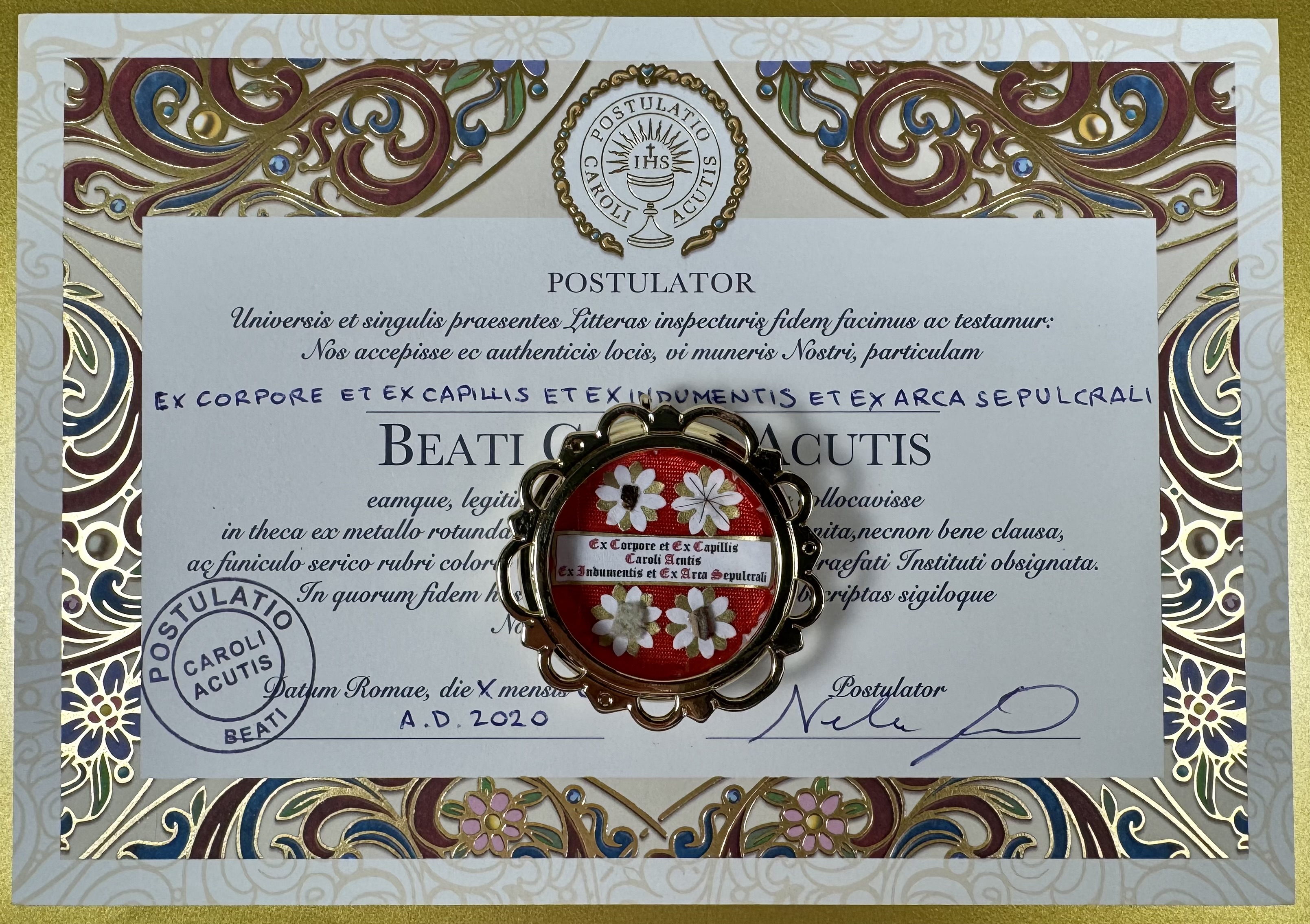 Extremely rare large round glass-fronted metal reliquary theca housing four first- and second-class pre-canonization relics of Saint Carlo Acutis. The relics are affixed to the flower-shaped paper and are identified in Latin on a bi-color typeset cedula label as Ex Corpore et Ex Capillis / Caroli Acutis / Ex Indumentis et Ex Arca Sepulerali (Of the body, of the hair, of the clothes, of the funeral casket of Carlo Acutis). On the back, under a protective cap, the theca is secured with a seal of red Spanish wax bearing an imprint of the Postulator General for the Cause of the Beatification of Carlo Acutis. The relic is accompanied by the original matching authentics document issued and sealed by the order of the Postulator General on October 10, 2020 - the very day of his beatification.