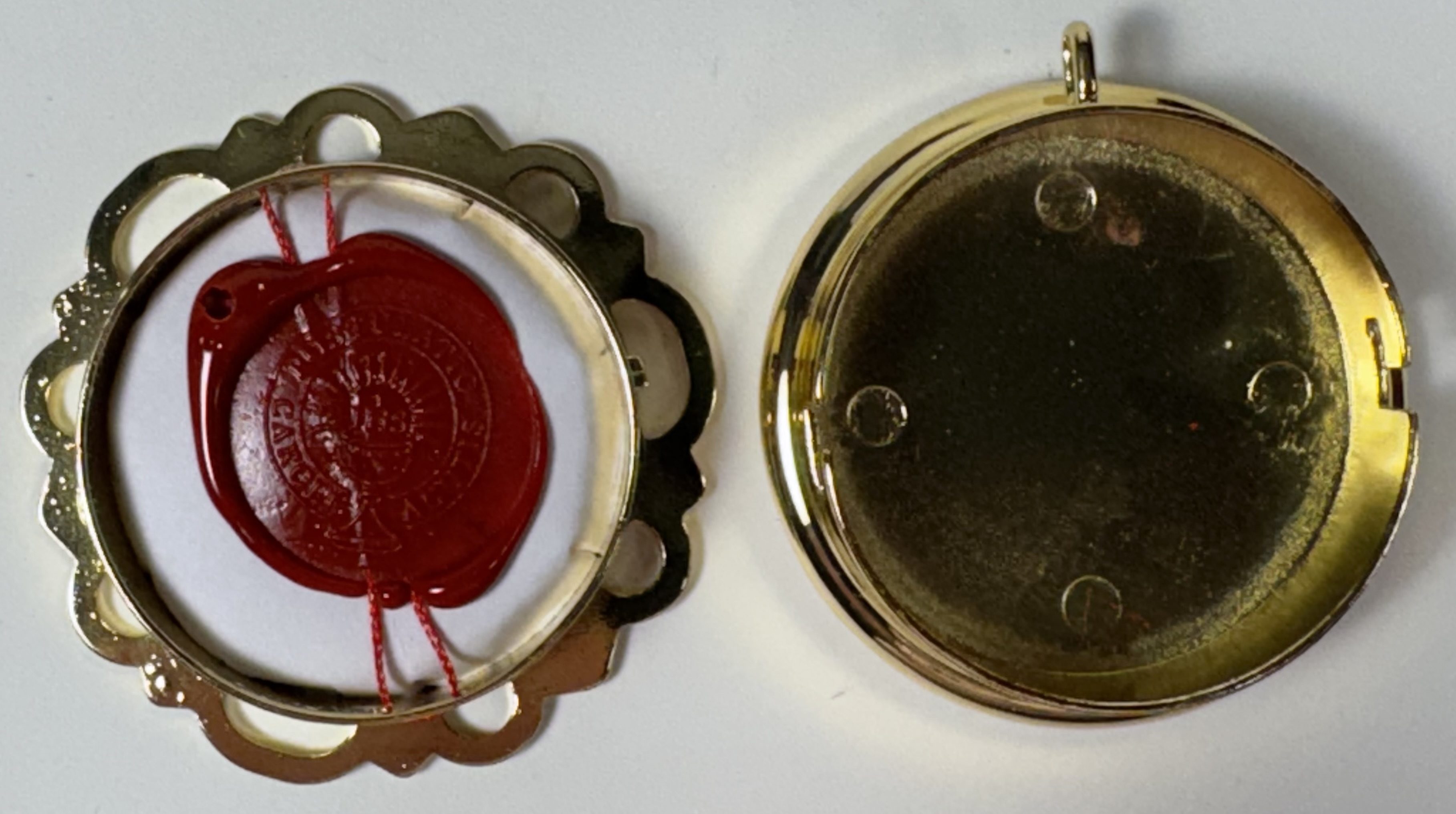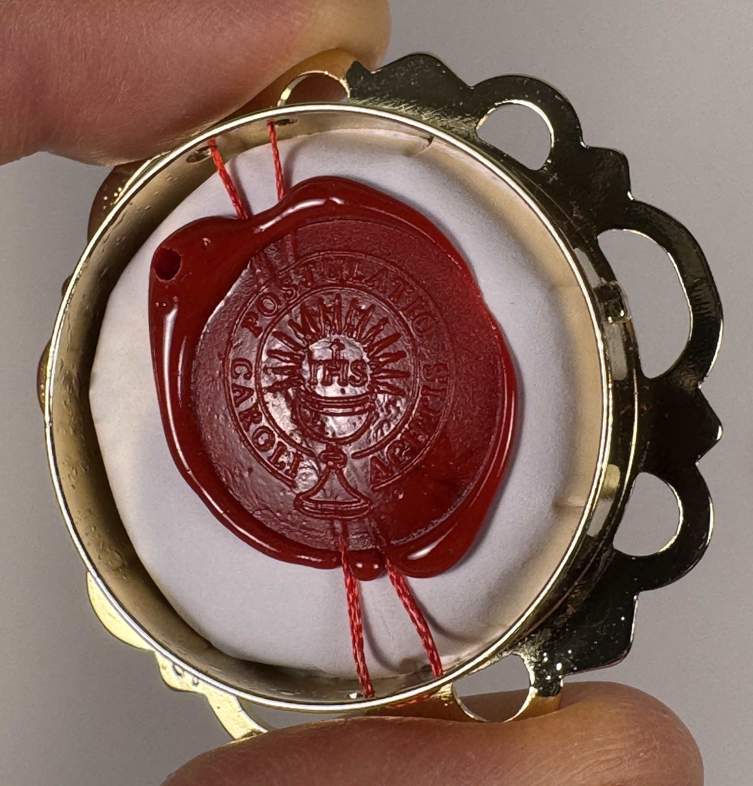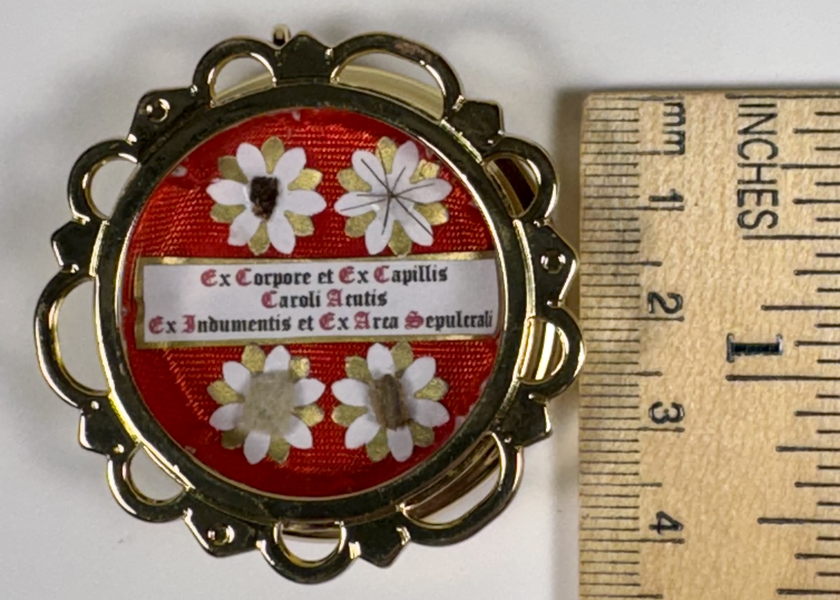 Extremely rare large round glass-fronted metal reliquary theca housing four first- and second-class pre-canonization relics of Saint Carlo Acutis. The relics are affixed to the flower-shaped paper and are identified in Latin on a bi-color typeset cedula label as Ex Corpore et Ex Capillis / Caroli Acutis / Ex Indumentis et Ex Arca Sepulerali (Of the body, of the hair, of the clothes, of the funeral casket of Carlo Acutis). On the back, under a protective cap, the theca is secured with a seal of red Spanish wax bearing an imprint of the Postulator General for the Cause of the Beatification of Carlo Acutis. The relic is accompanied by the original matching authentics document issued and sealed by the order of the Postulator General on October 10, 2020 - the very day of his beatification.