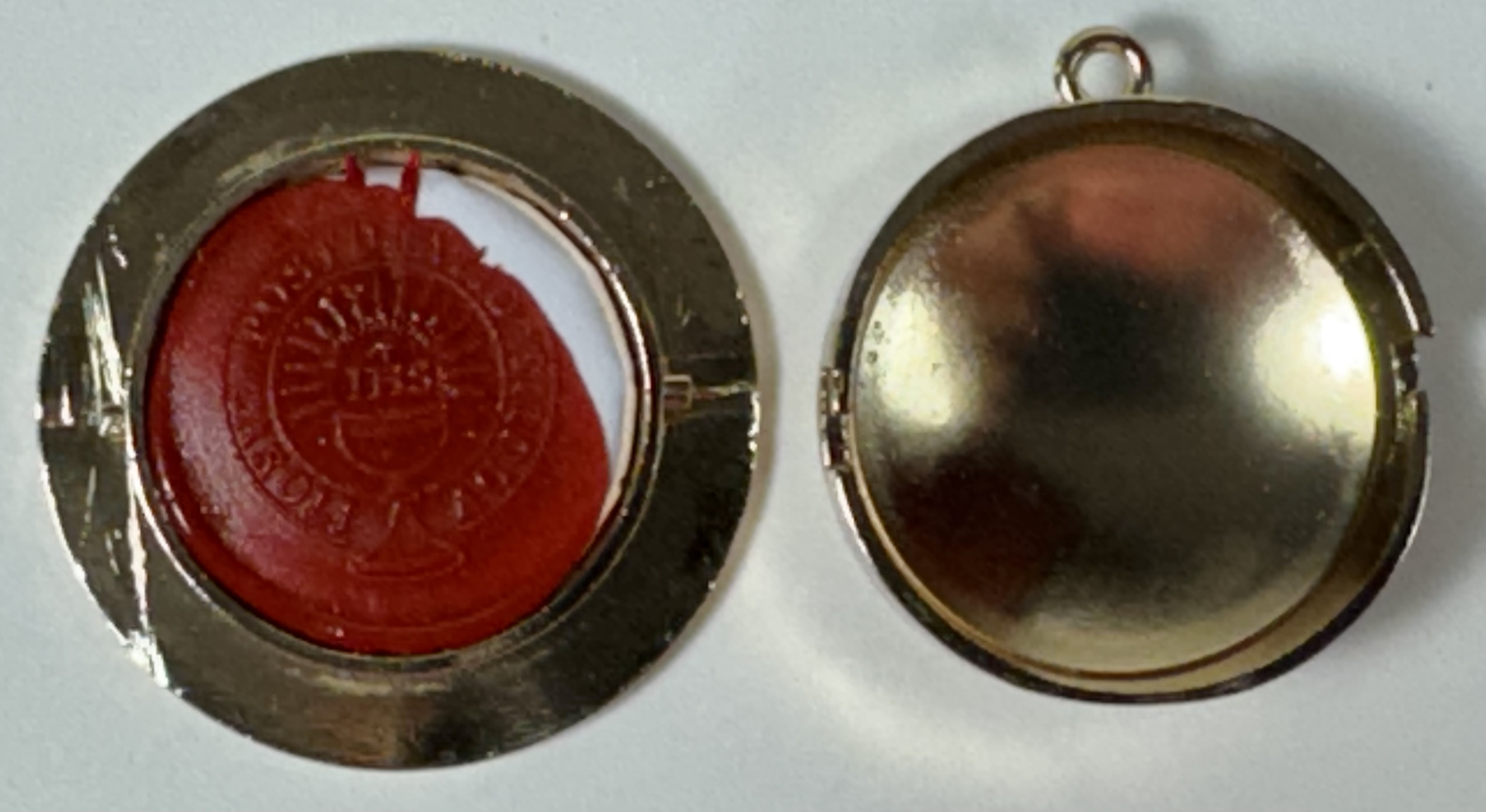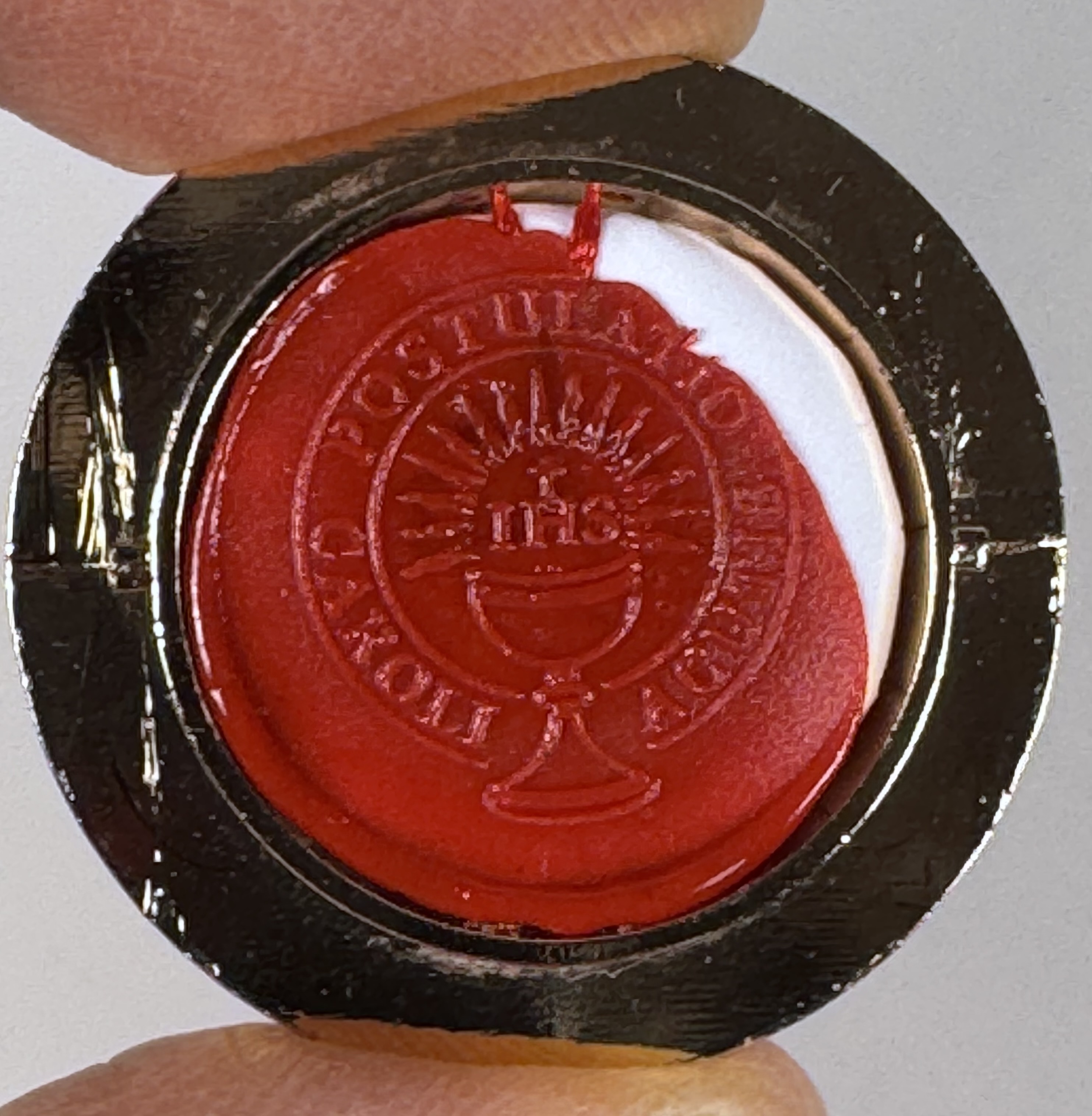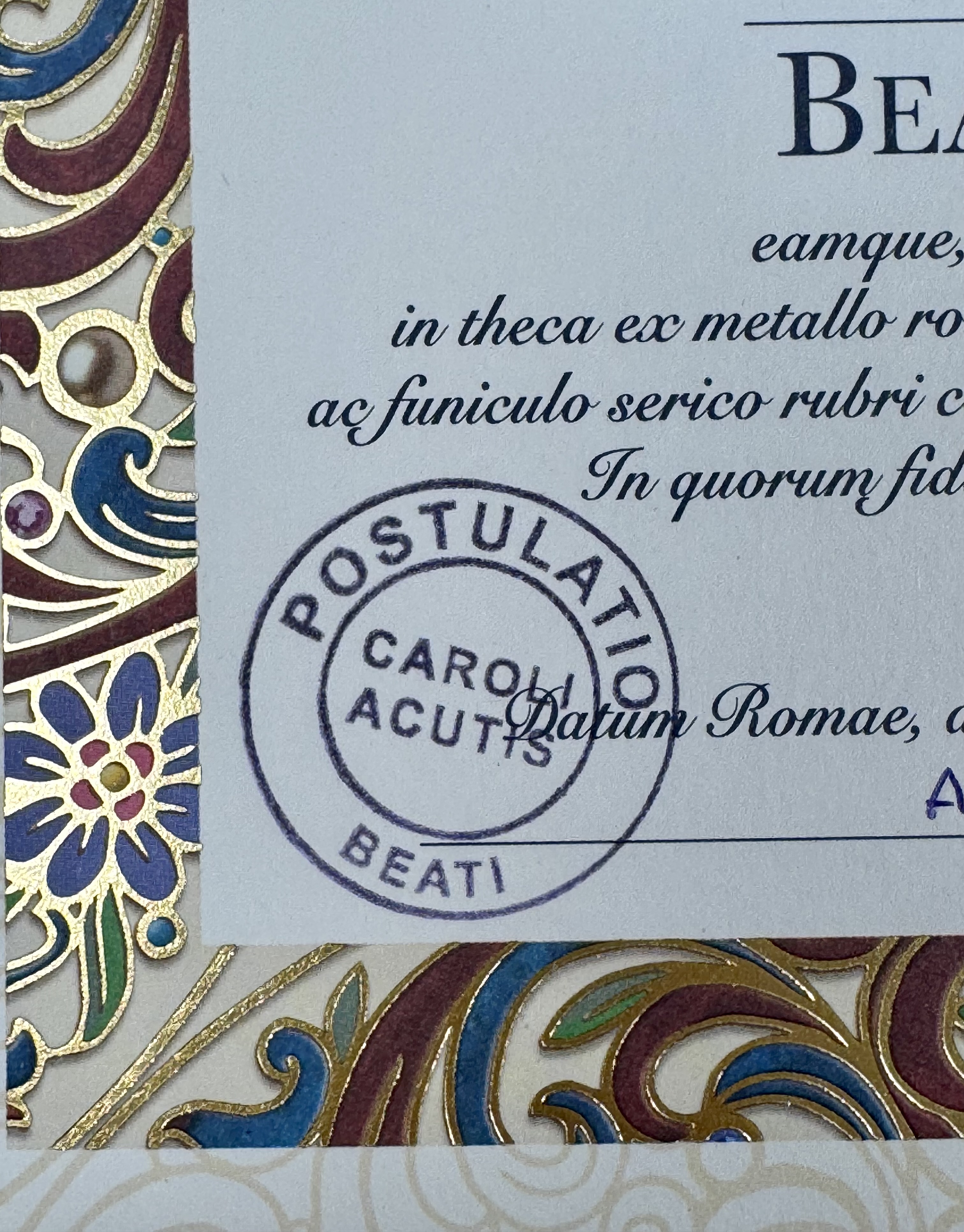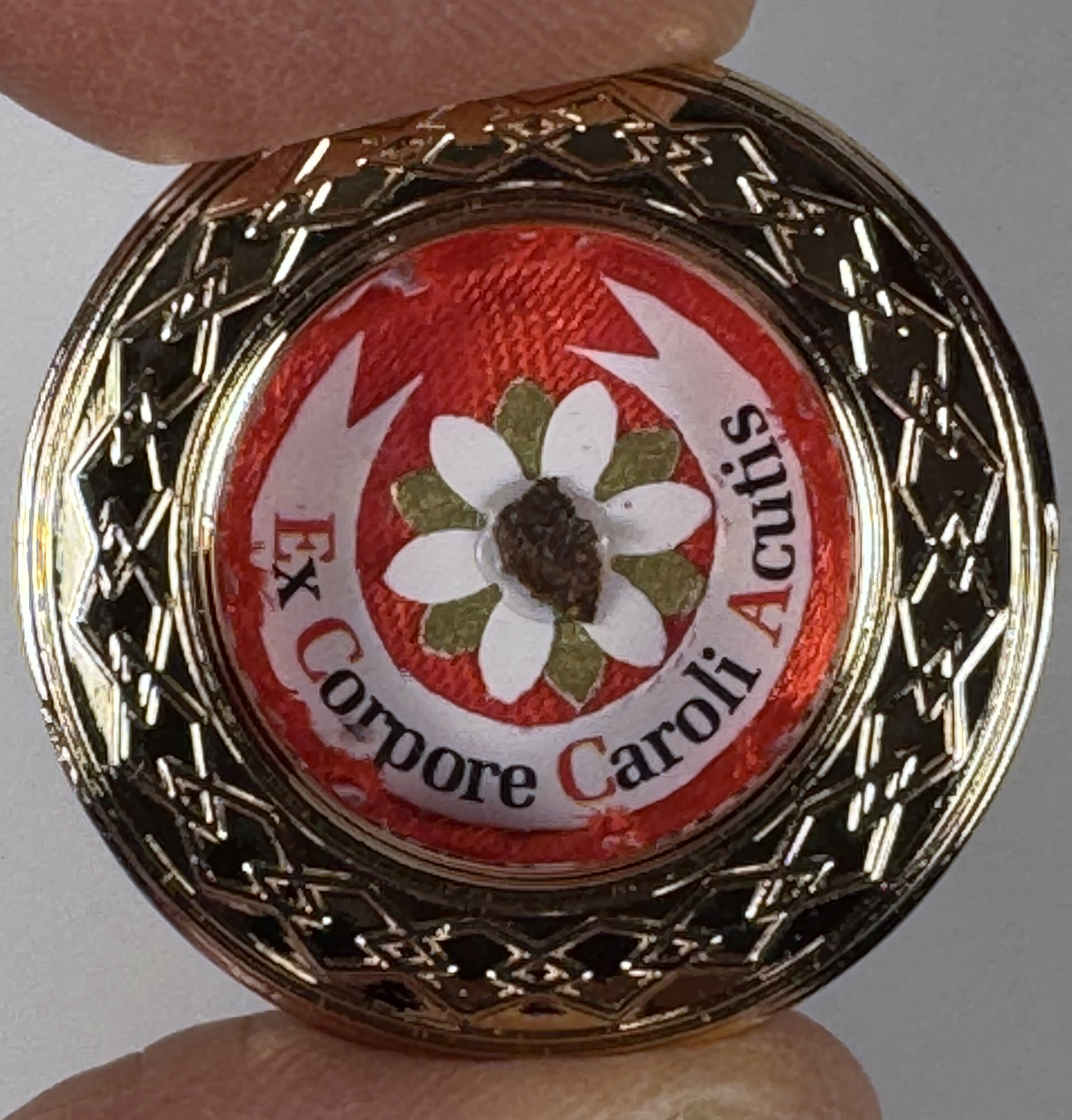 Extremely rare round glass-fronted metal reliquary theca housing the first-class Ex Corpore (of the body) pre-canonization relics of Saint Carlo Acutis. The relics are affixed to a ground of red silk and identified in Latin on a bi-color typeset cedula label as Ex Corpore Caroli Acutis (Of the body of Carlo Acutis). On the back, under a protective cap with an engraved seal of the Postulator General for the Cause of the Beatification of Carlo Acutis, the theca is secured with a seal of red Spanish wax bearing an imprint of the same Postulator. The relic is accompanied by the original matching authentics document issued and sealed by the order of the Postulator General on October 10, 2020 - the very day of his beatification. Please note that, due to its scarcity, this item is not subject to any discounts.