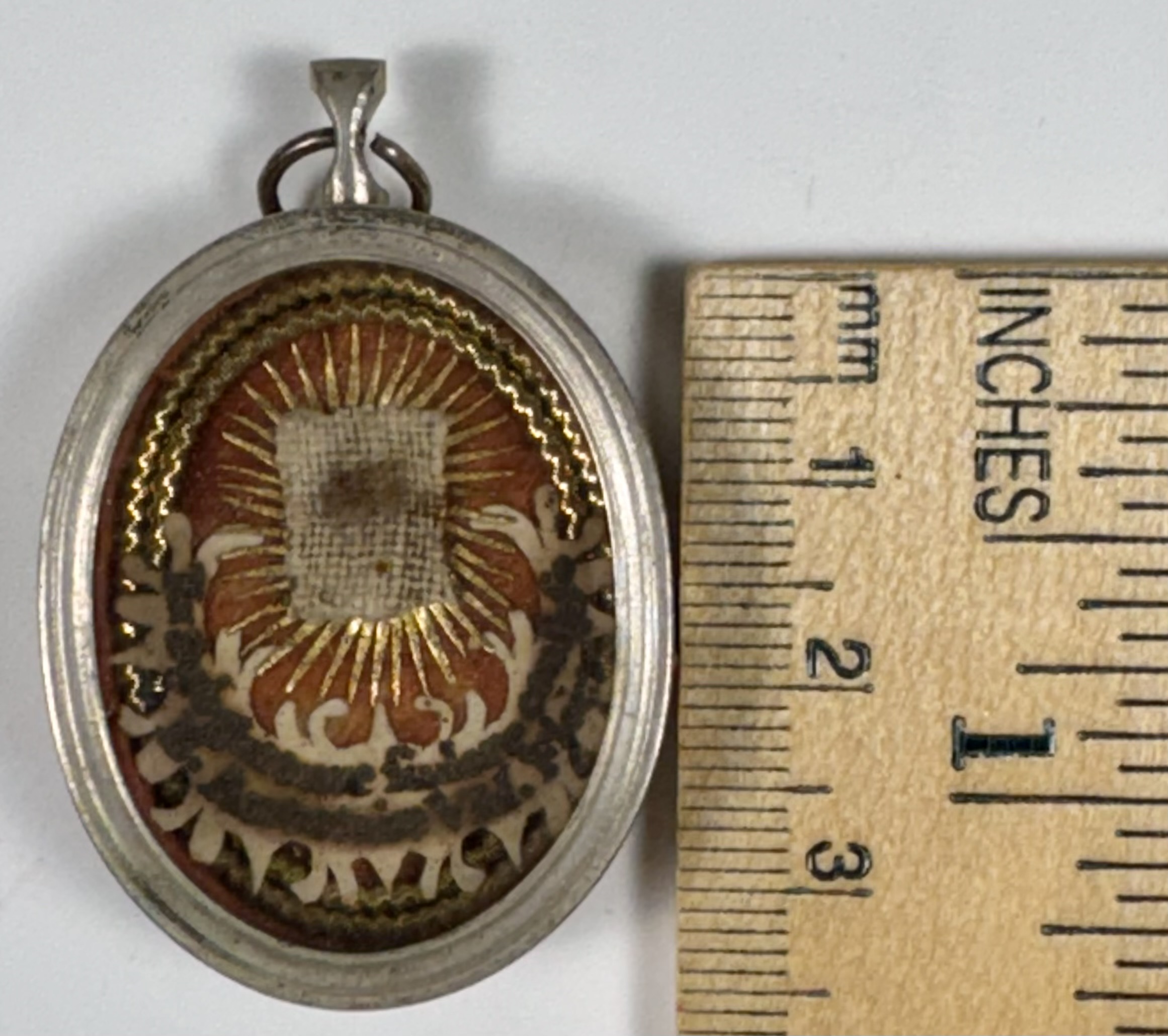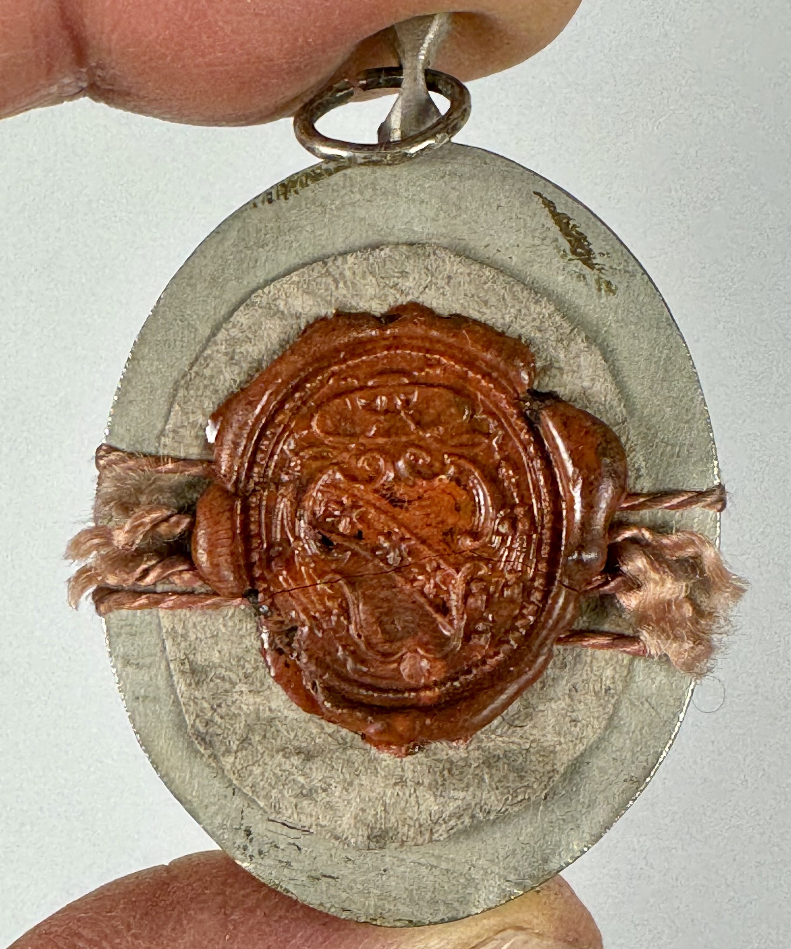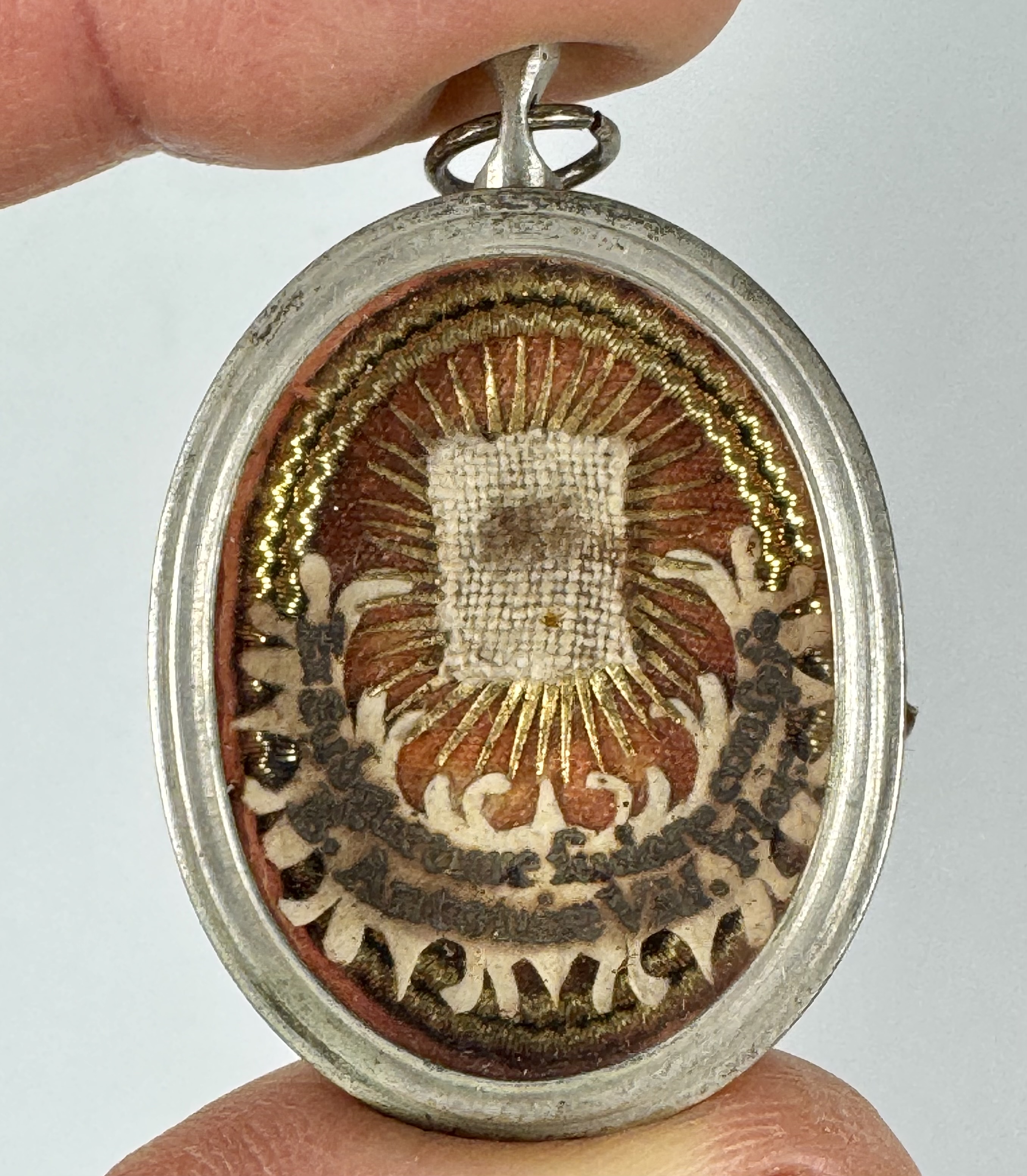 Oval glass-fronted silvered brass pendant reliquary theca housing the second-class Ex subcorpore sudario (from the shroud covering the body)relic of Blessed Antonia of Florence. The relic is affixed on a background of silk, surrounded by a silver wire and ornamentation and identified in Latin on a fancy manuscript cedula label as Ex subcorpore sudario B. Antoniae Vid. Floren. (from the shroud of Blessed Antonia, Widow of Florence). On the back, the reliquary is secured by the perfectly preserved seal of red Spanish wax with a coat of arms of Fr. Francesco Maria Ginori (†1775), Bishop of Fiesole, Italy (1736–1775).