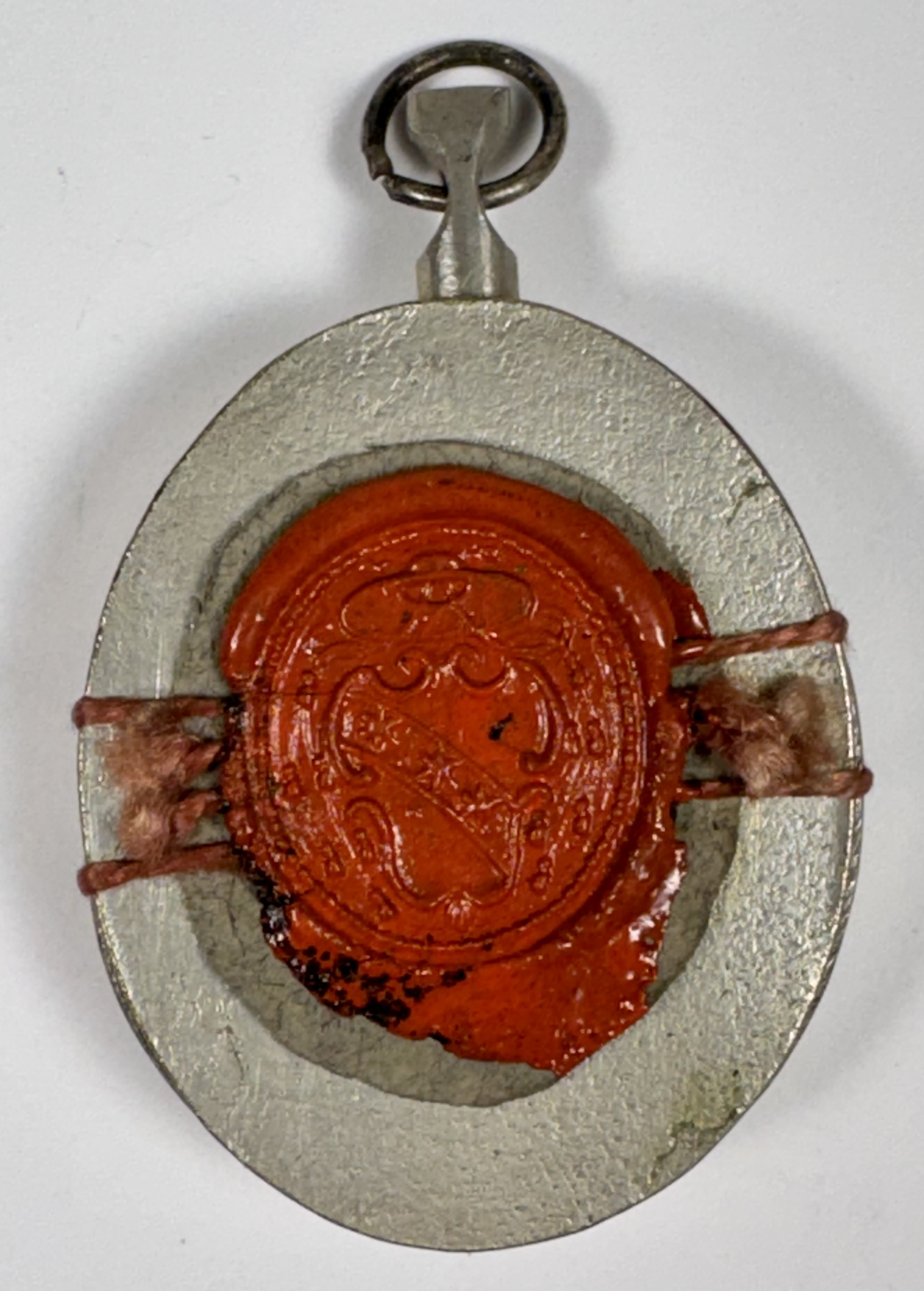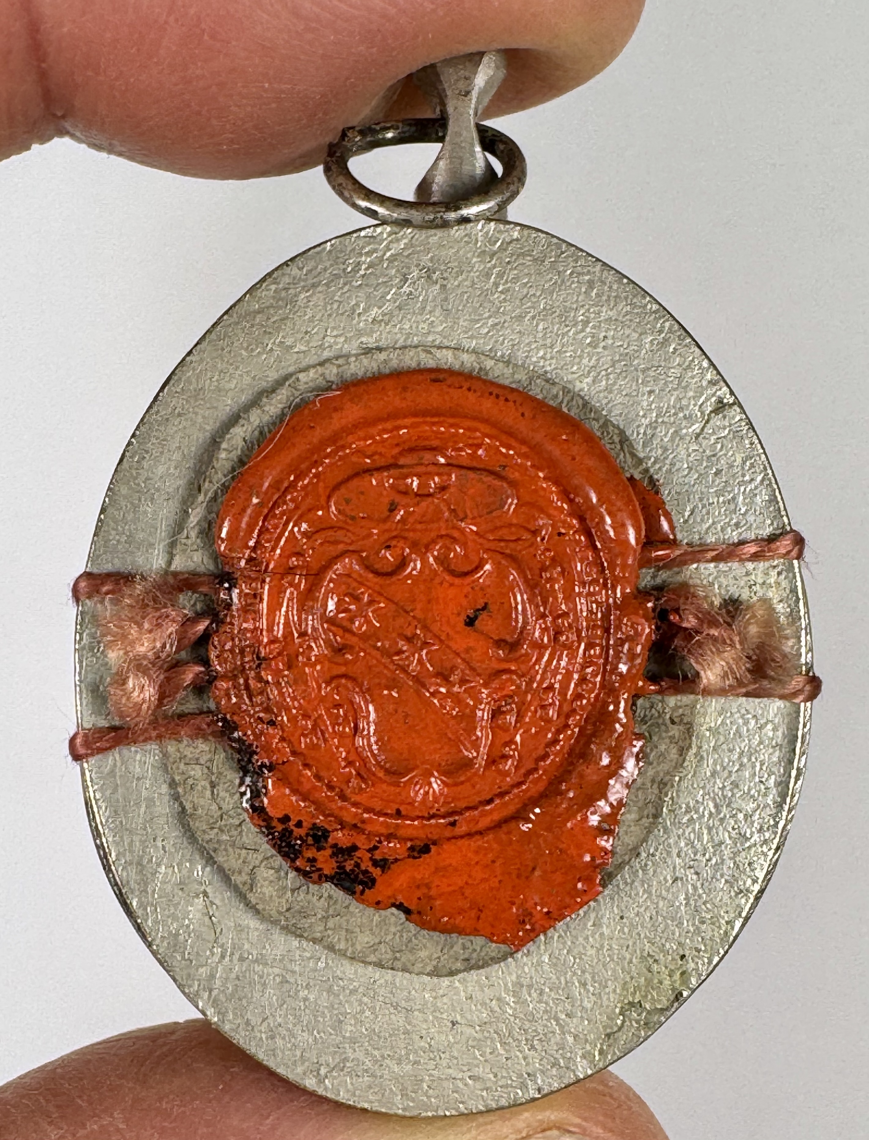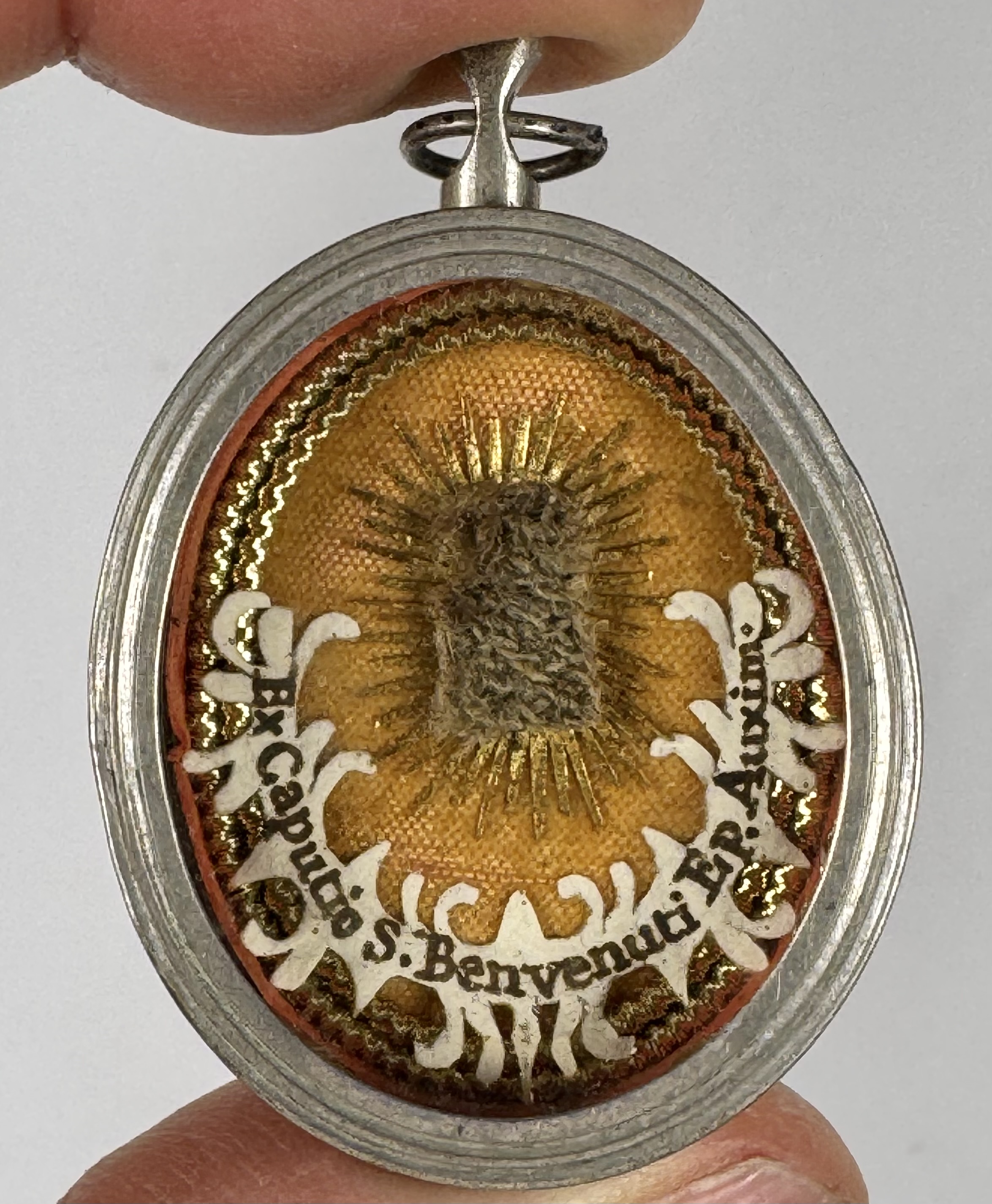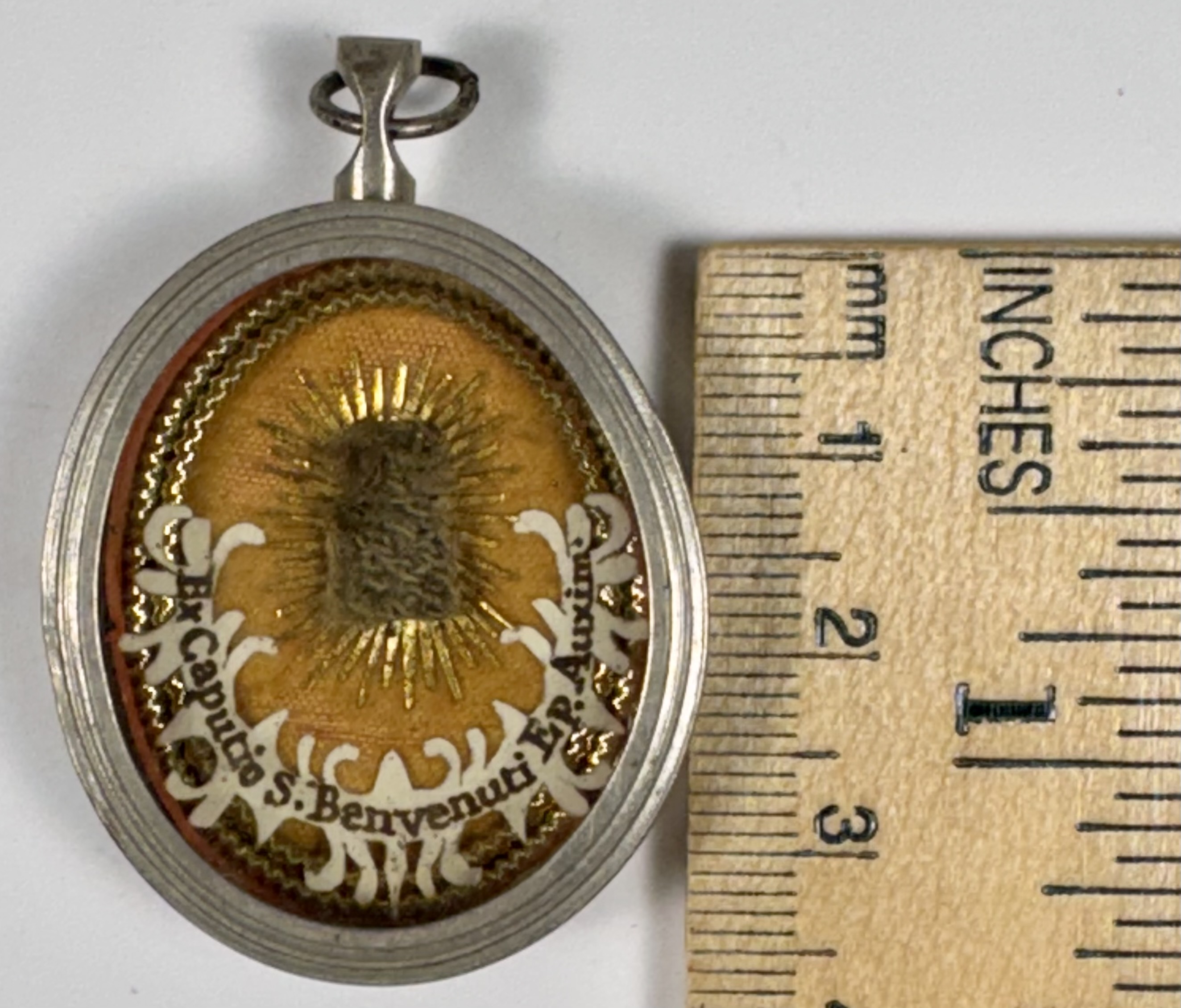 Oval glass-fronted silvered brass pendant reliquary theca housing the second-class Ex caputo (of the head covering) relic of Saint Benvenutus Scotivoli, Bishop of Osimo. The relic is affixed on a gilt paper burst on a background of silk, surrounded by a silver wire ornamentation and identified in Latin on a fancy manuscript cedula label as Ex Caputo S. Benvenuti Ep. Auxim. (of the head covering of Saint Benvenutus Scotivoli, Bishop of Osimo). On the back, the reliquary is secured by the perfectly preserved seal of red Spanish wax with a coat of arms of Fr. Francesco Maria Ginori (†1775), Bishop of Fiesole, Italy (1736–1775).