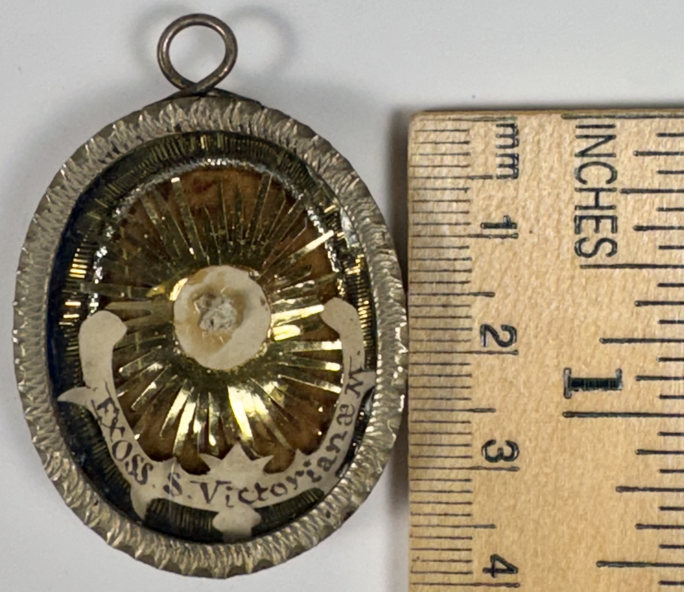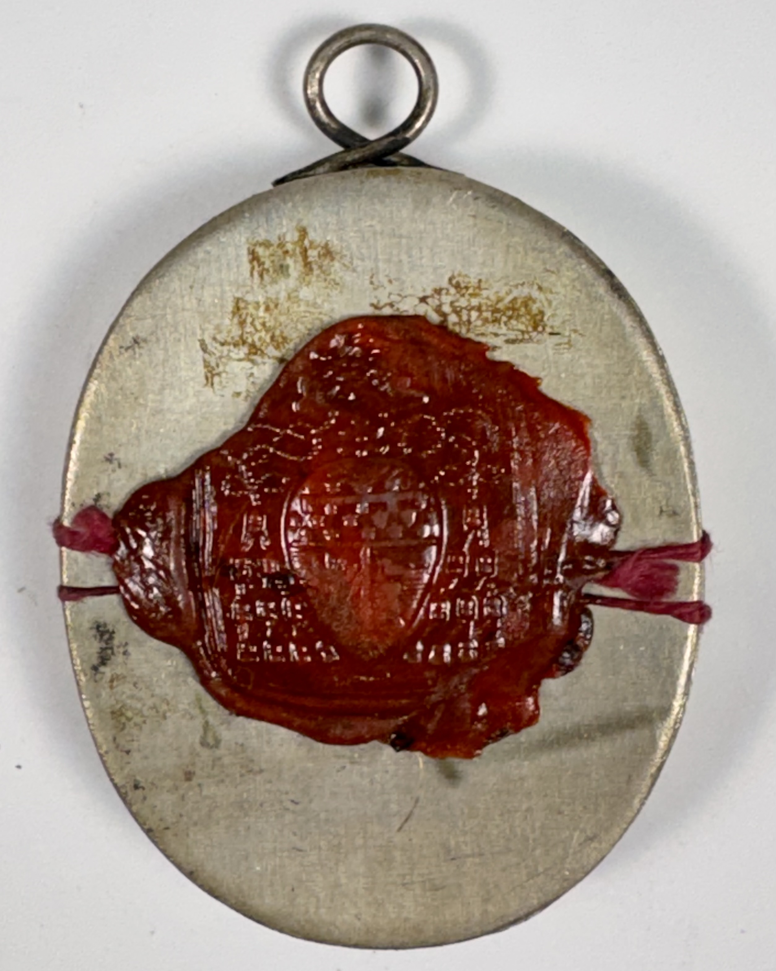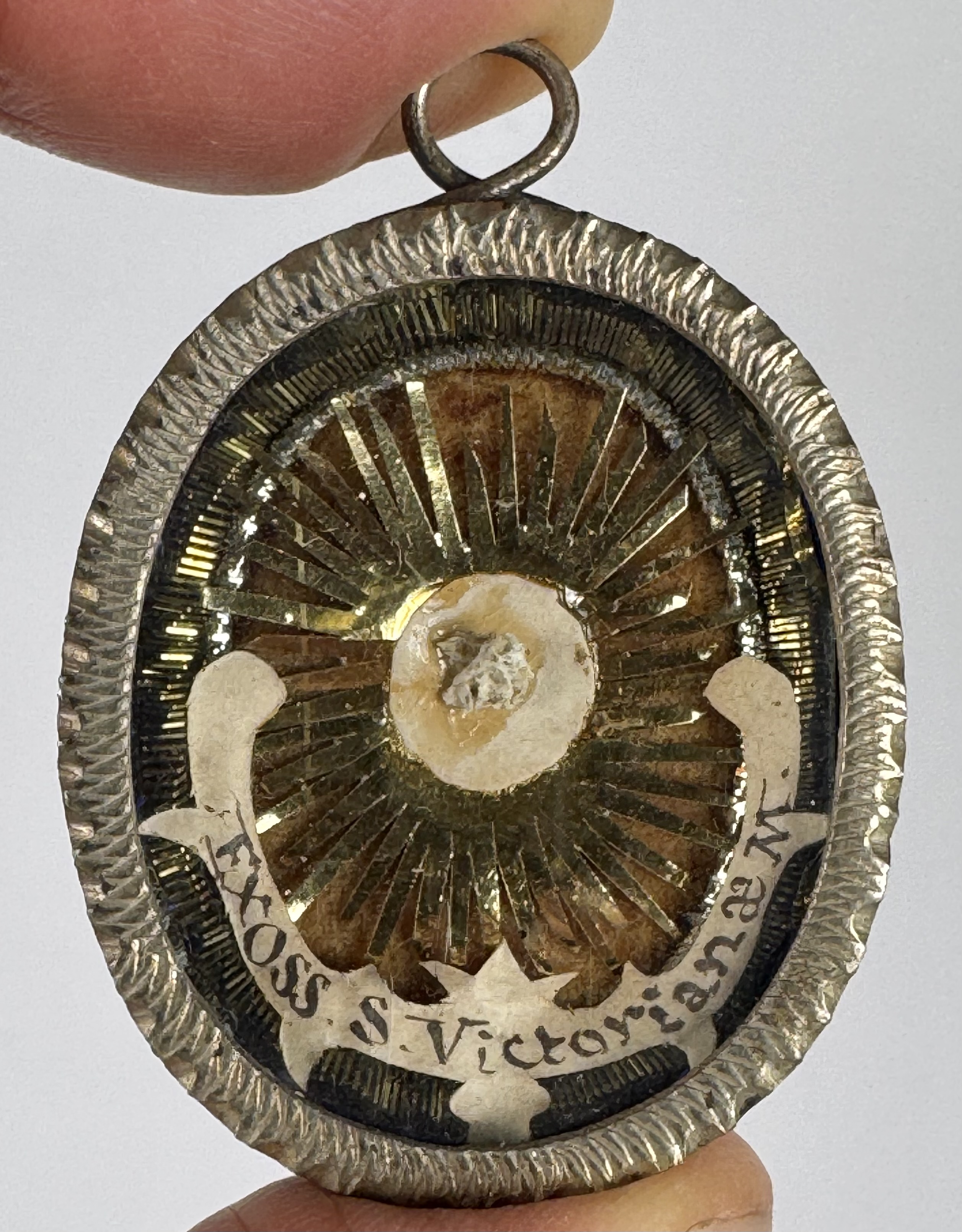 Oval glass-fronted silver pendant reliquary theca housing the second-class Ex Ossibus (of a bone) relic of Saint Victoriana, Martyr. The relic is affixed to a gilt paper burst on a ground of silk, surrounded by a silver wire ornamentation and identified in Latin on a fancy manuscript cedula label as Ex Oss. S. Victorianae M. (of a bone of Saint Victoriana, Martyr). On the back, the reliquary is secured by the perfectly preserved seal of red Spanish wax with a coat of arms of Monsignor Giovacchino Limberti (†1874), Archbishop of Florence, Italy (1857–1874).