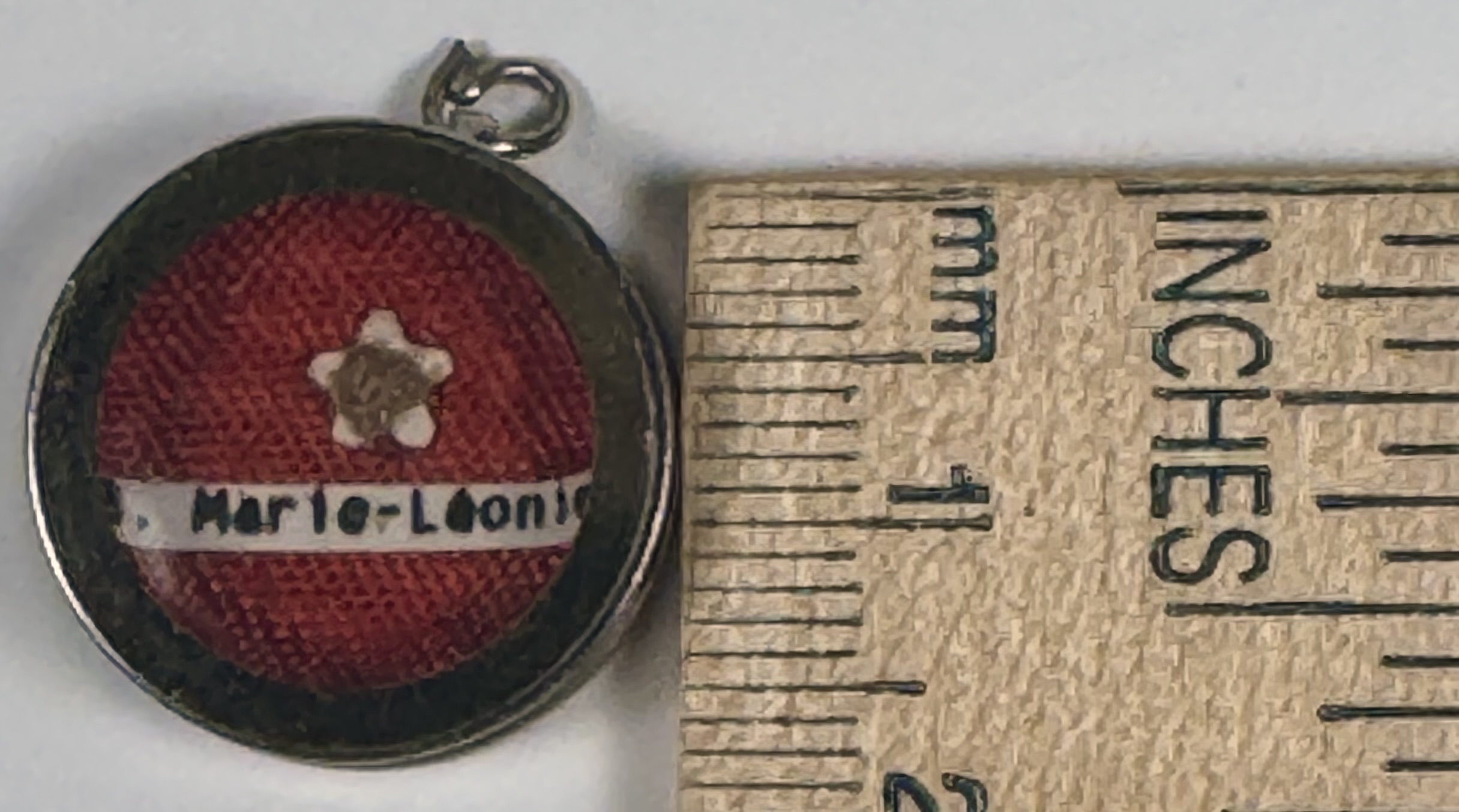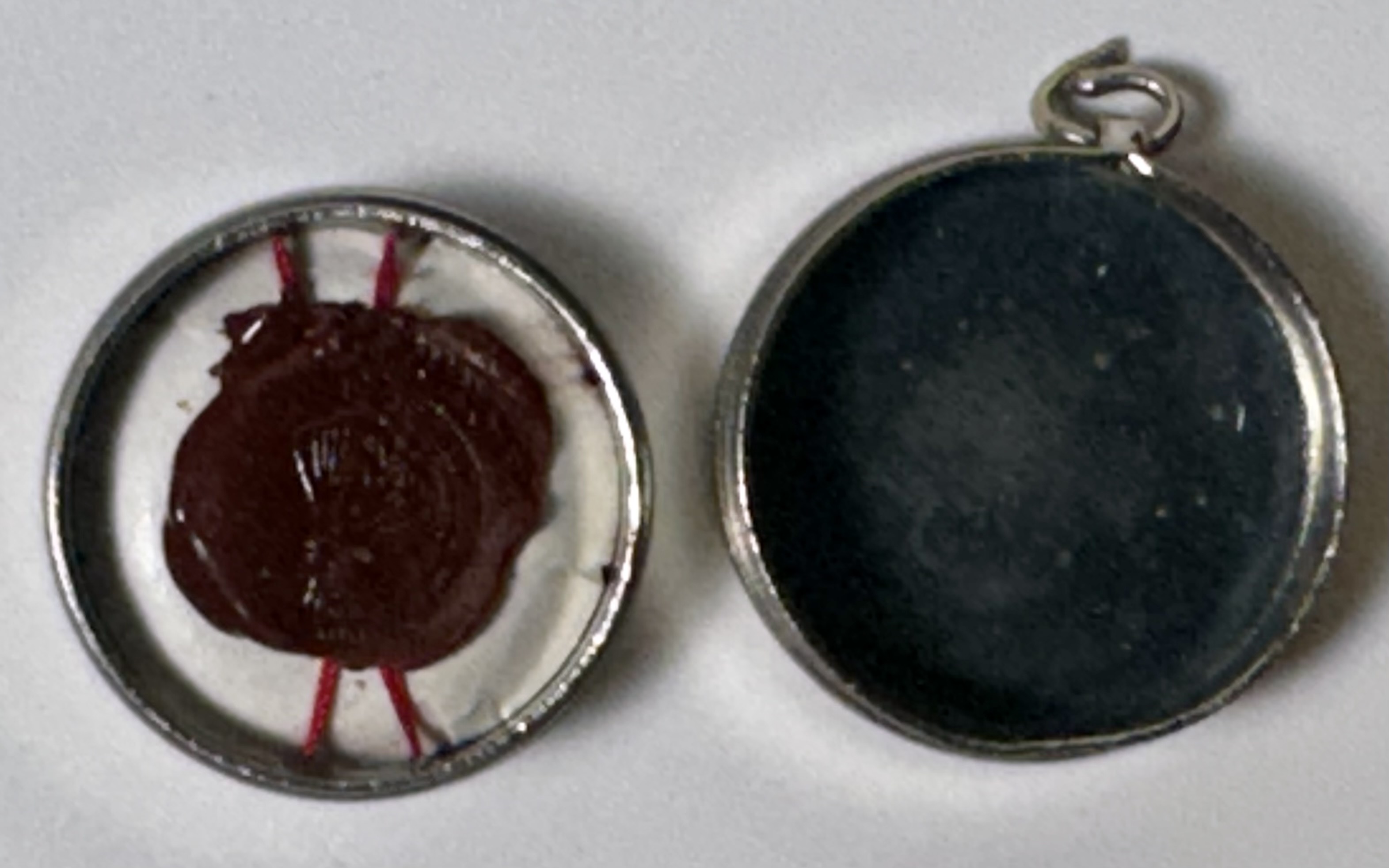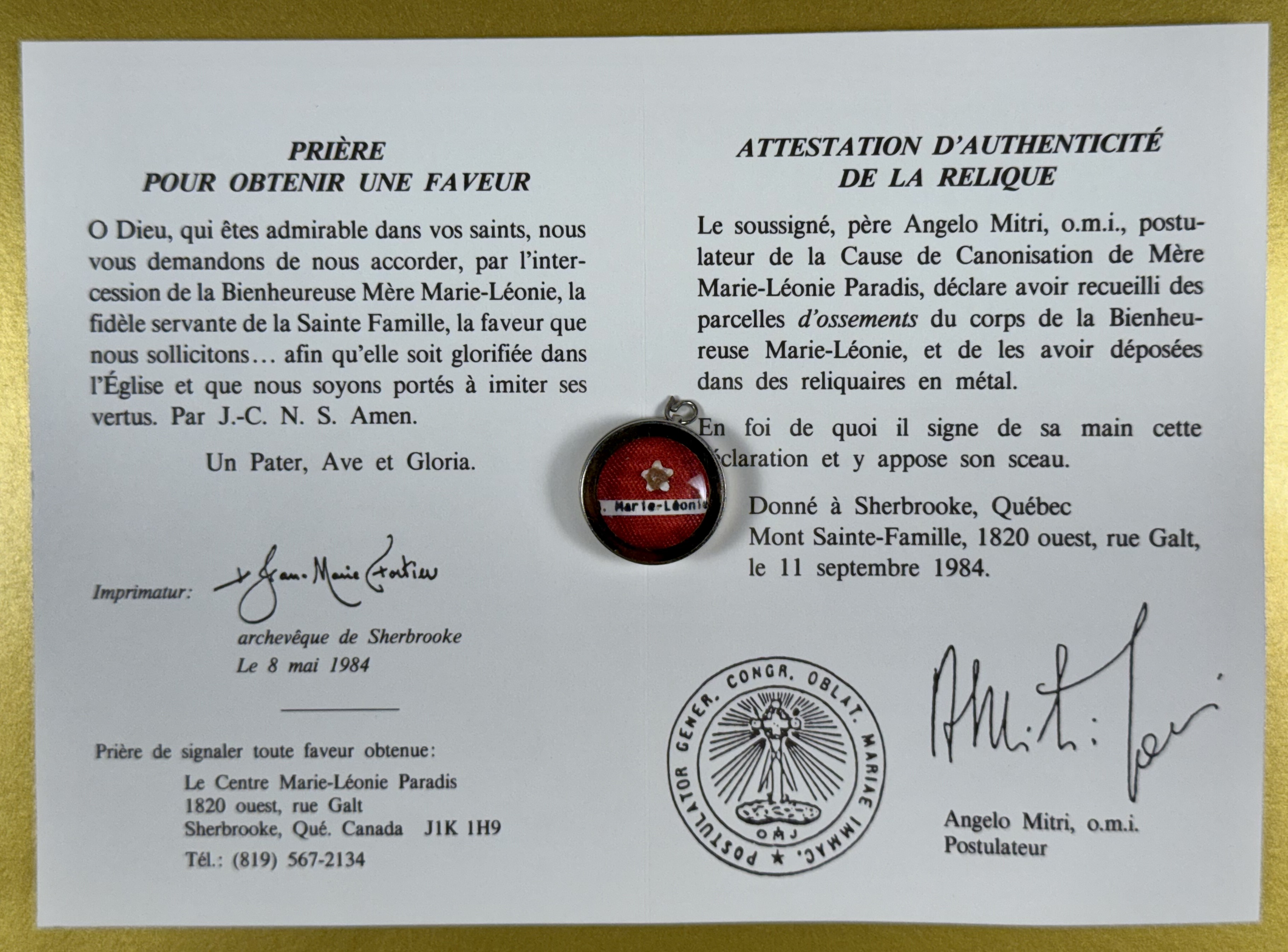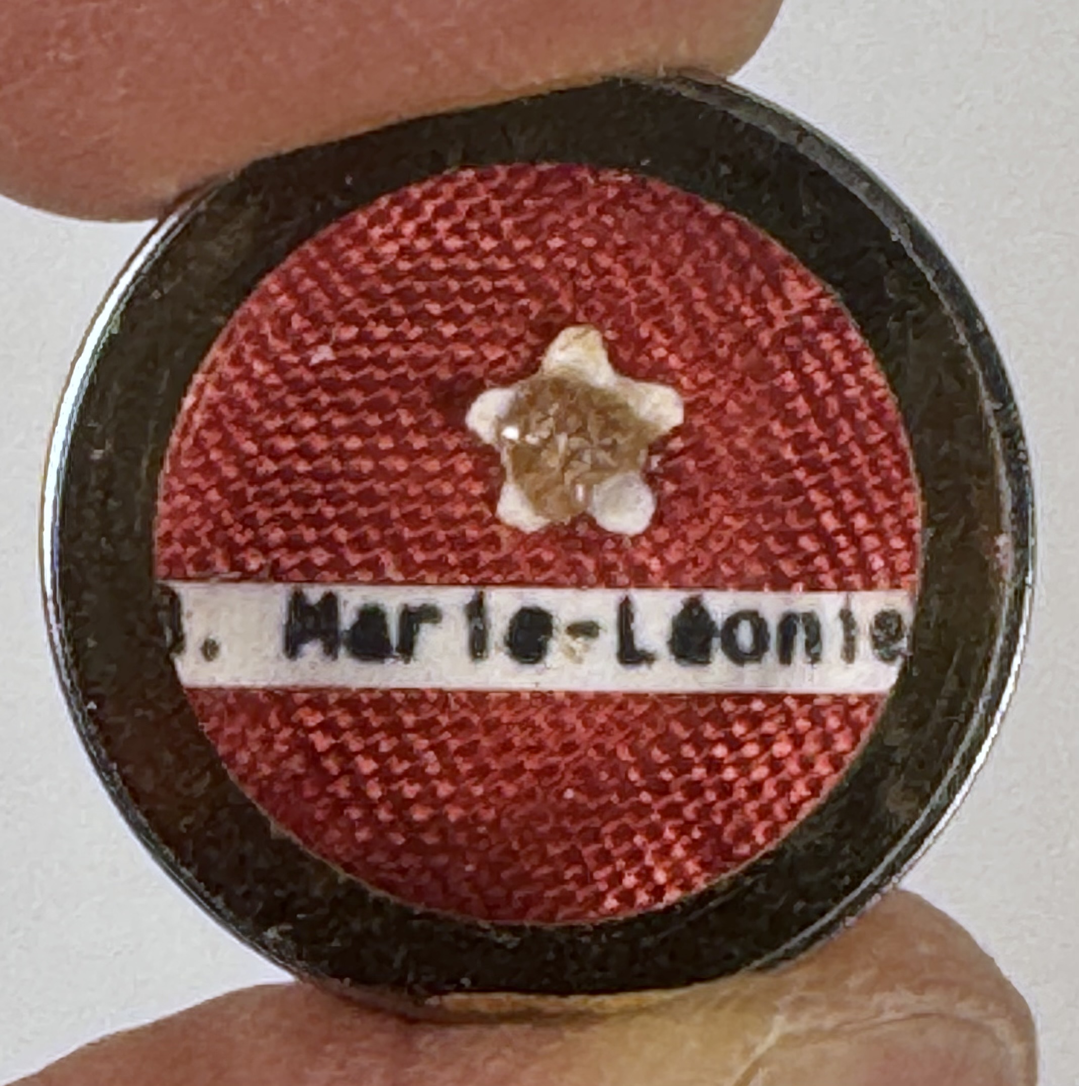 Small round glass-fronted white-metal reliquary theca housing the first-class ex ossibus (of the bone) pre-canonization relic of St. Marie-Léonie Paradis. The relic is affixed to a red silk ground and identified in Latin on a typeset cedula label as B. Marie- Leonis (Blessed Marie-Léonie). On the back, under the protective cap, the theca is secured with a seal of red Spanish wax bearing an imprint of a coat of arms of the Congregation of the Missionary Oblates of Mary Immaculate. The relic is accompanied by the original matching authentics document issued and signed on September 11, 1984 (the very day of her beatification) by the Postulator General of the Order responsible for the cause of beatification and canonization.