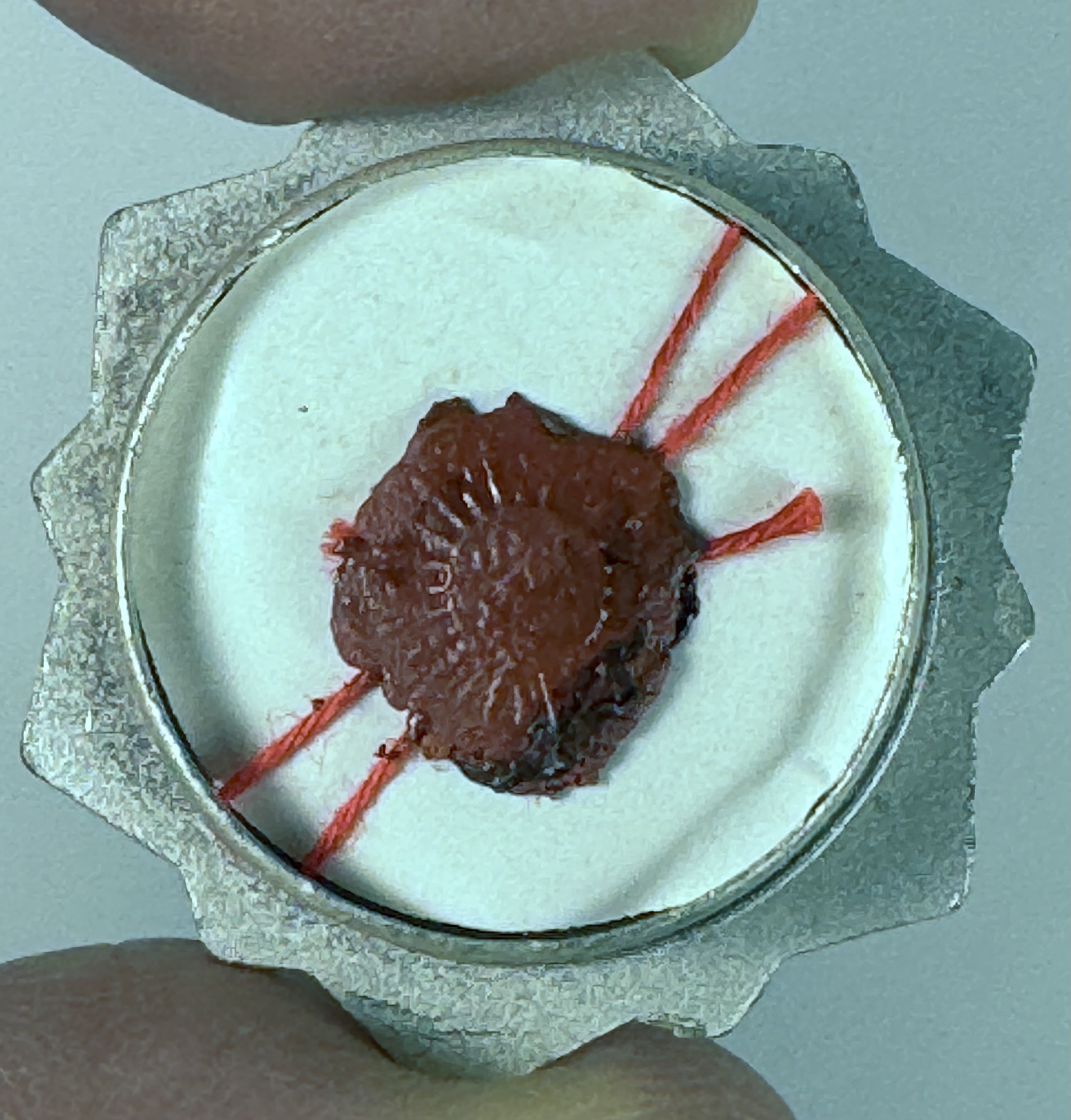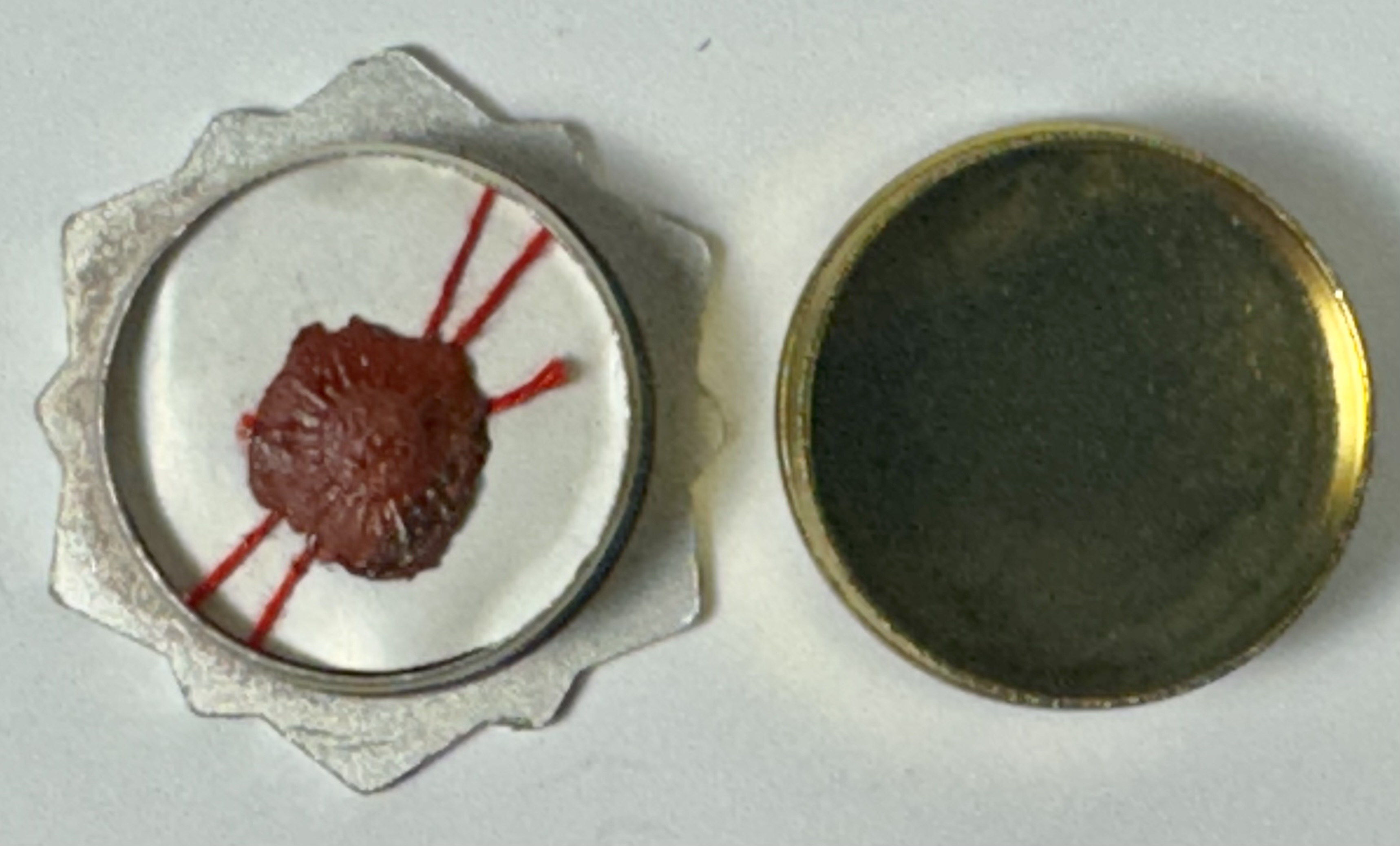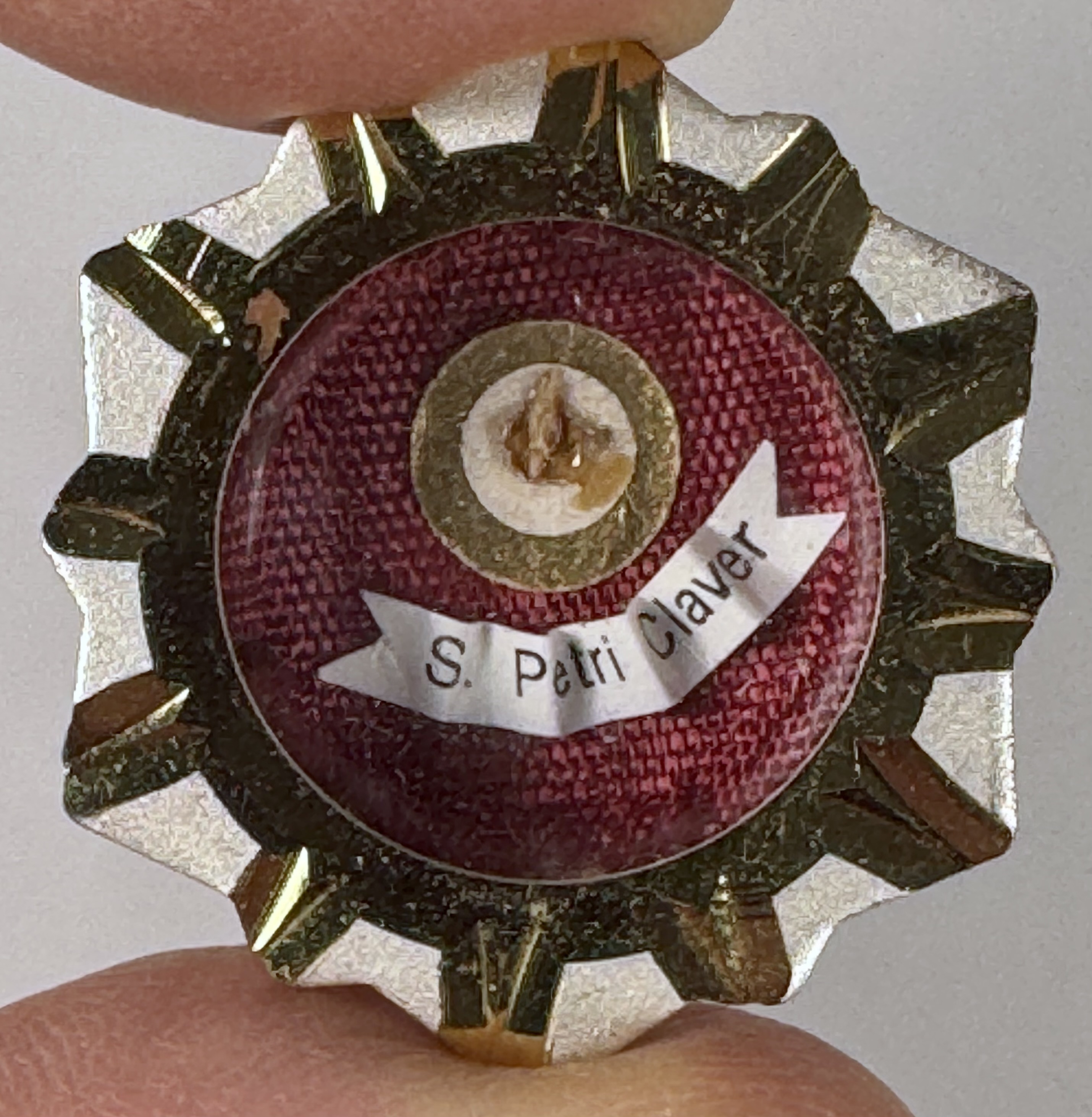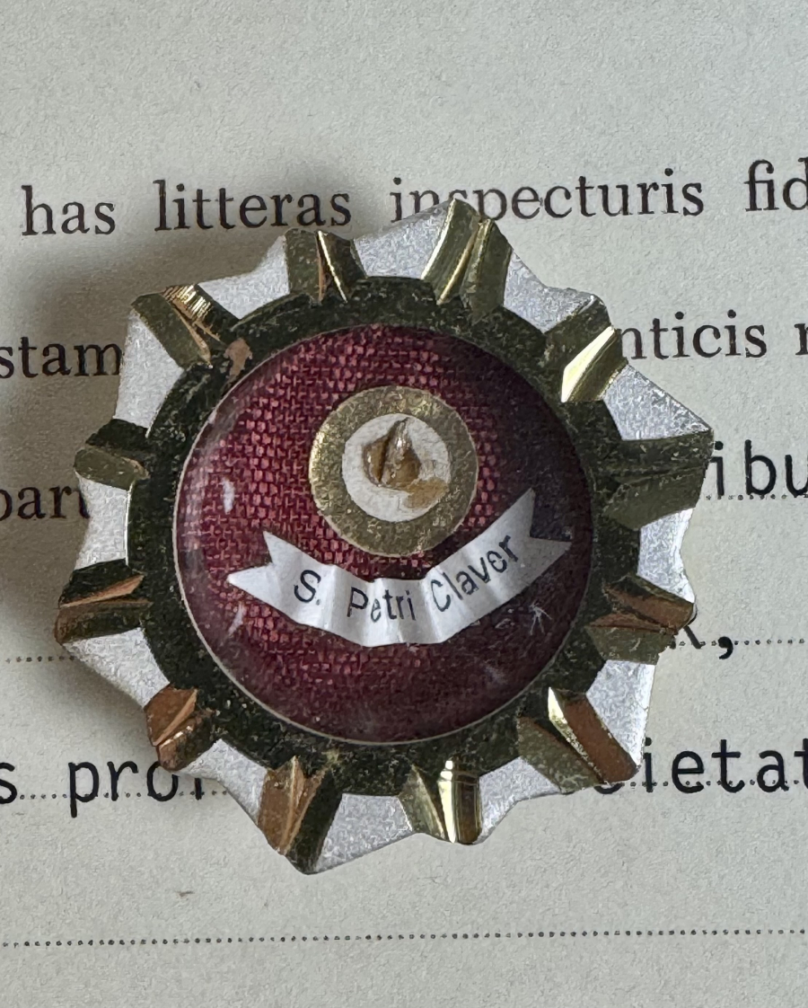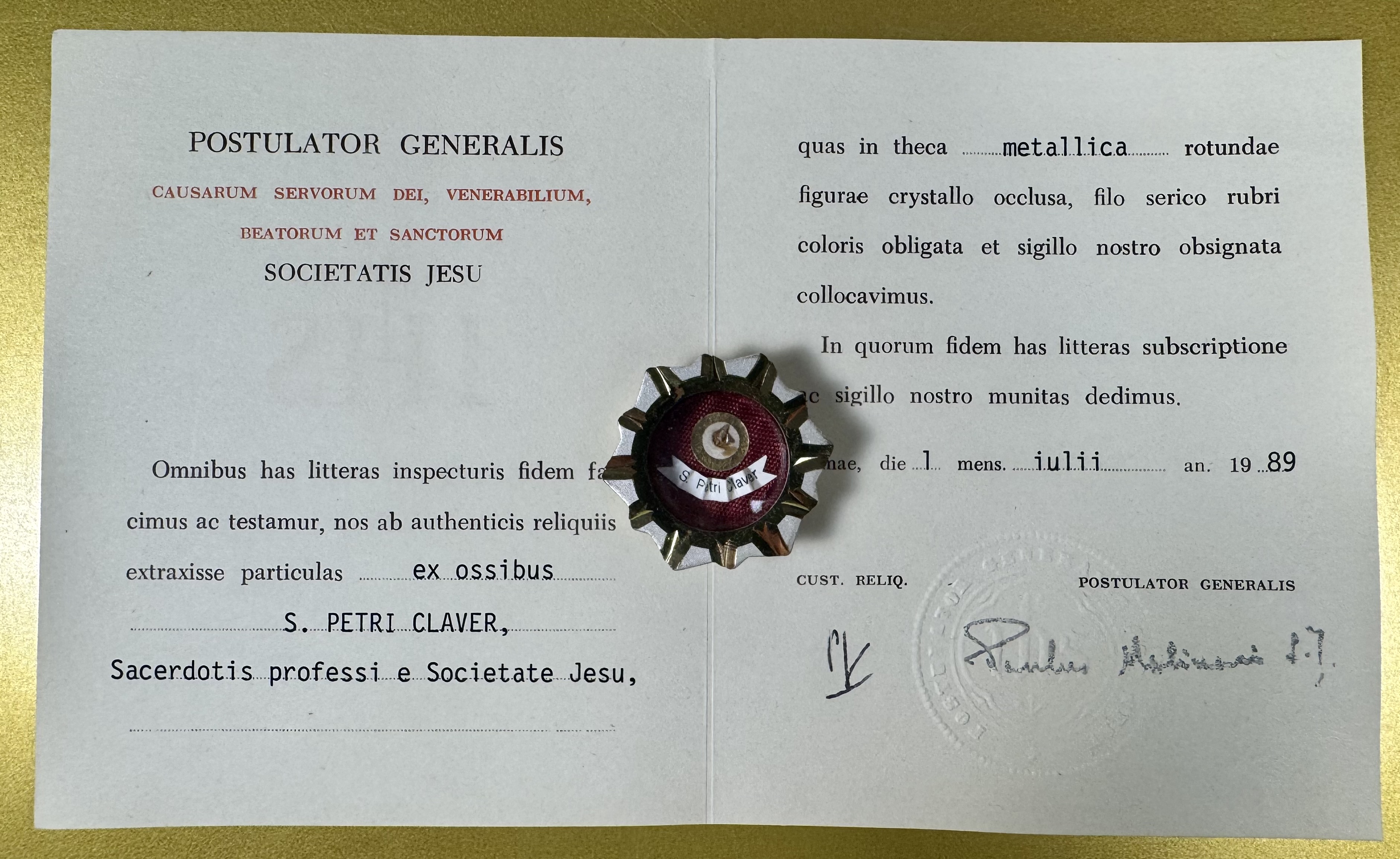 Round glass-fronted white-metal reliquary theca housing the first-class ex ossibus (of the bone) relic of Saint Peter Claver. The relic is affixed to a red silk ground and identified in Latin on a typeset cedula label as S. Petri Claver(Saint Peter Claver). On the back, under the protective cap, the theca is secured with a seal of red Spanish wax bearing an imprint of a coat of arms of the Jesuit Order. The relic is accompanied by the original matching authentics document issued and signed in 1989 by the Postulator General of the Order responsible for the cause of beatification and canonization.
