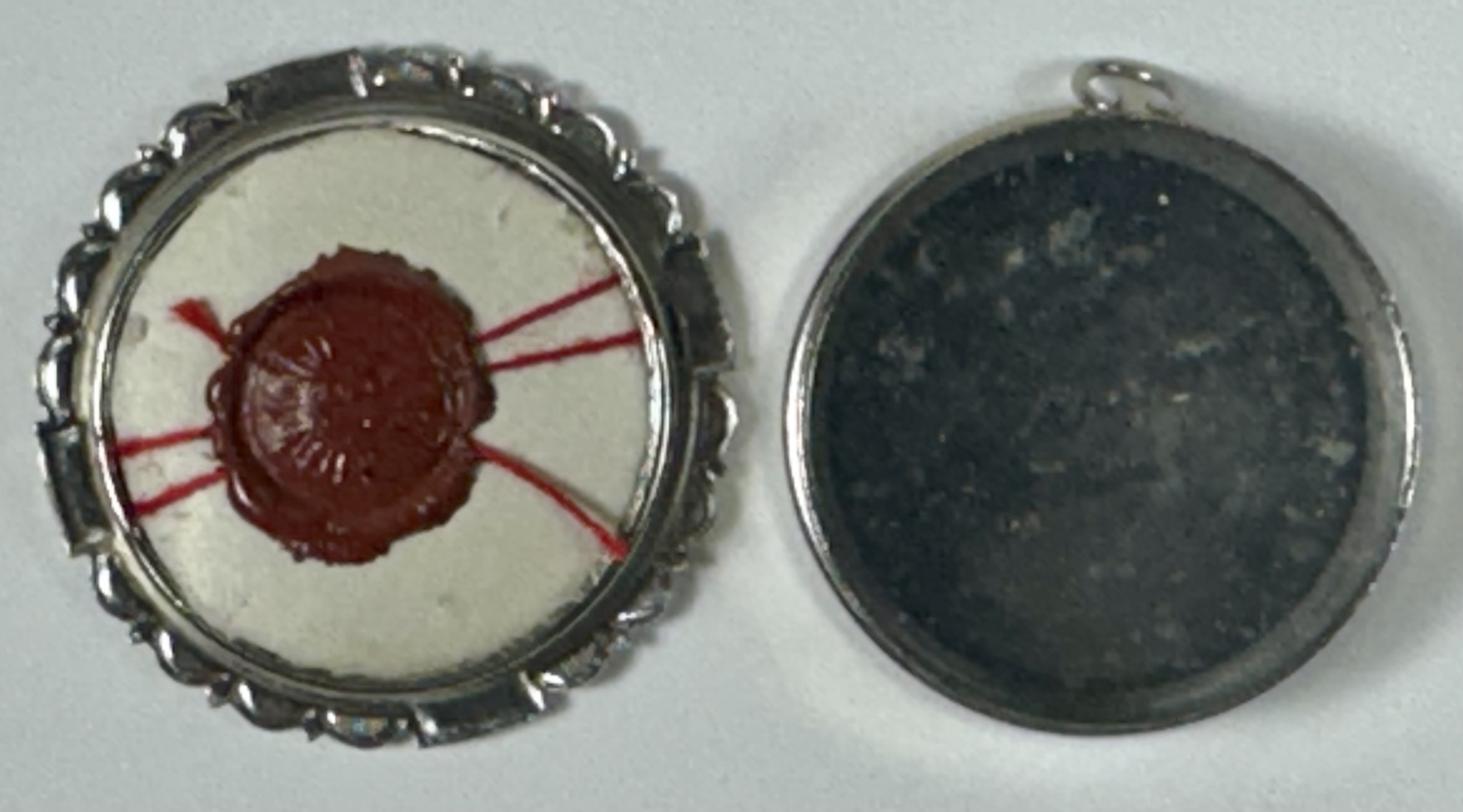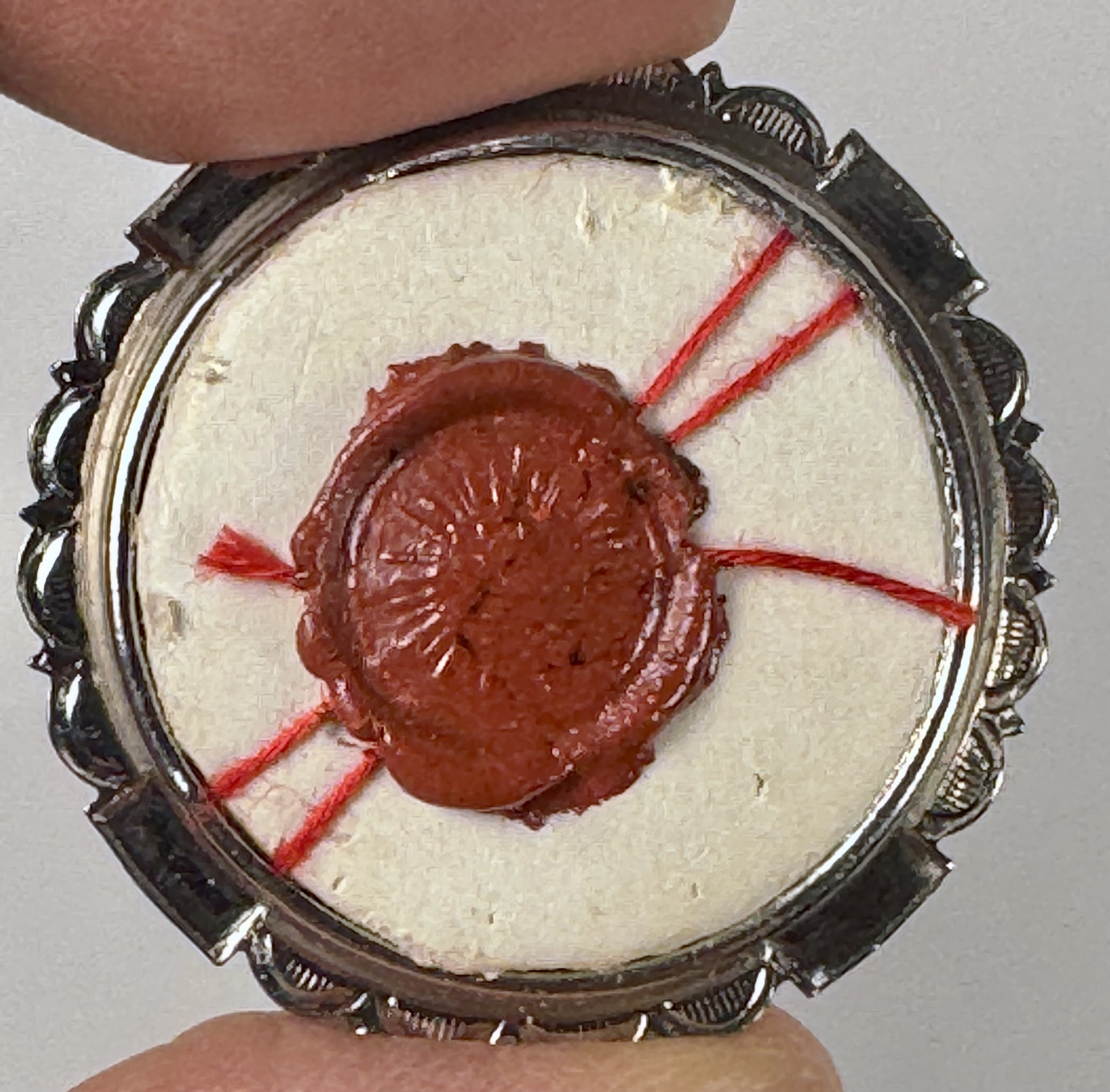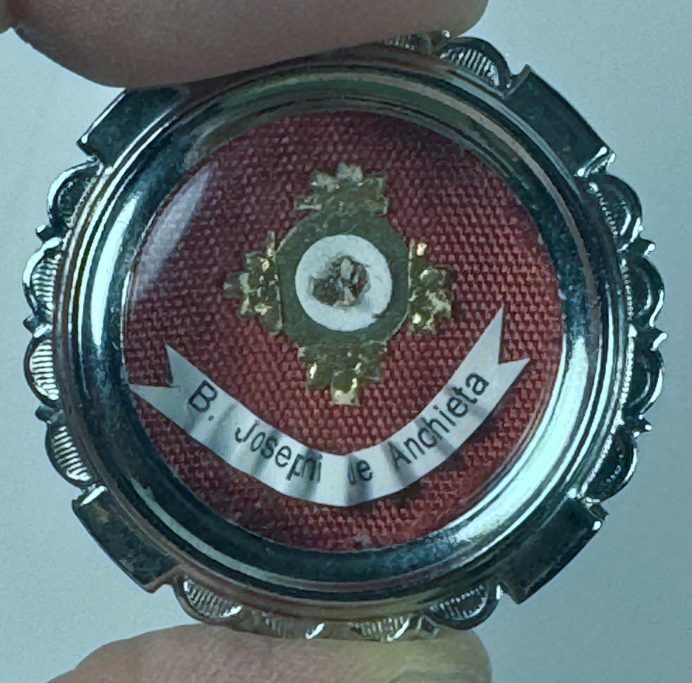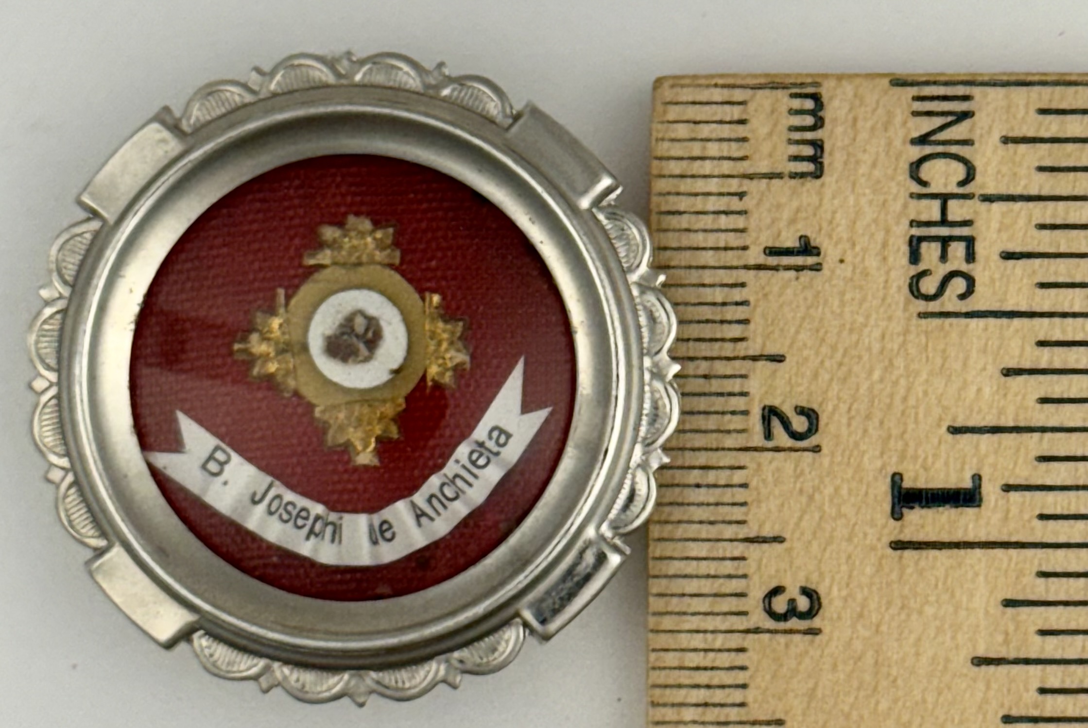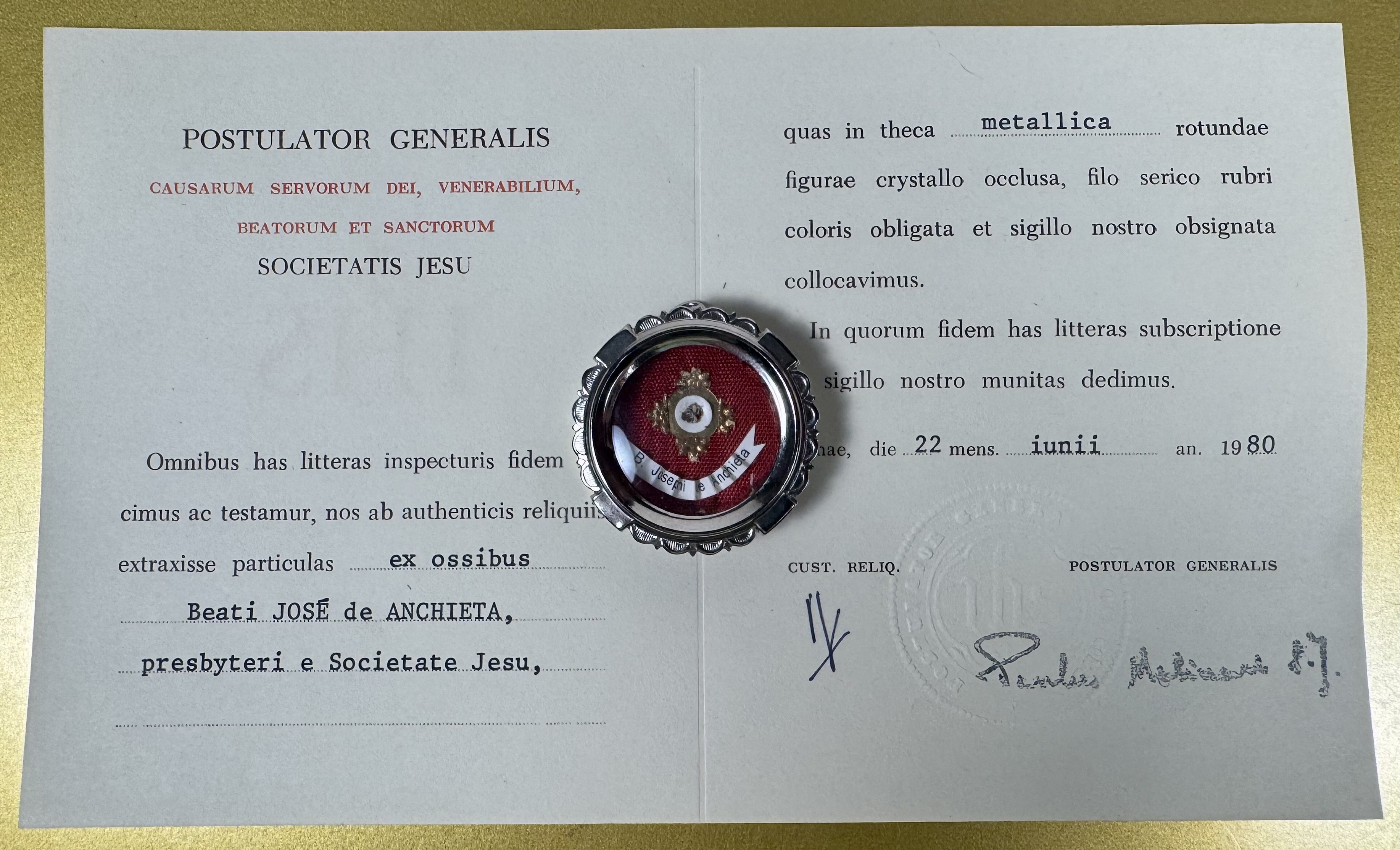 Round glass-fronted white-metal reliquary theca housing the first-class ex ossibus (of the bone) relic of Blessed José de Anchieta. The relic is affixed to a red silk ground and identified in Latin on a typeset cedula label as B. Josephi de Anchieta (Blessed José de Anchieta). On the back, under the protective cap, the theca is secured with a seal of red Spanish wax bearing an imprint of a coat of arms of the Jesuit Order. The relic is accompanied by the original matching authentics document issued and signed in 1980 by the Postulator General of the Order responsible for the cause of beatification and canonization.