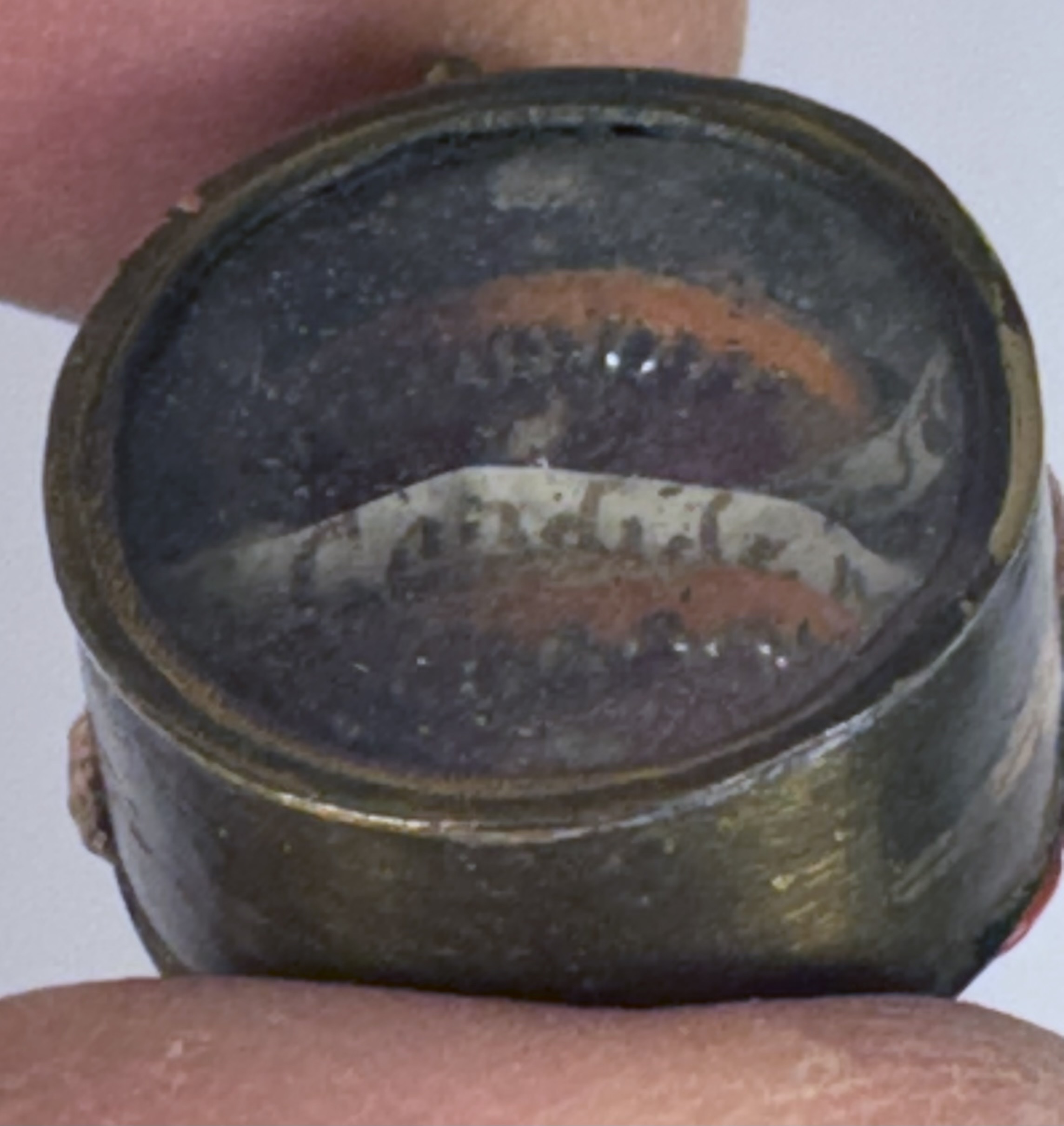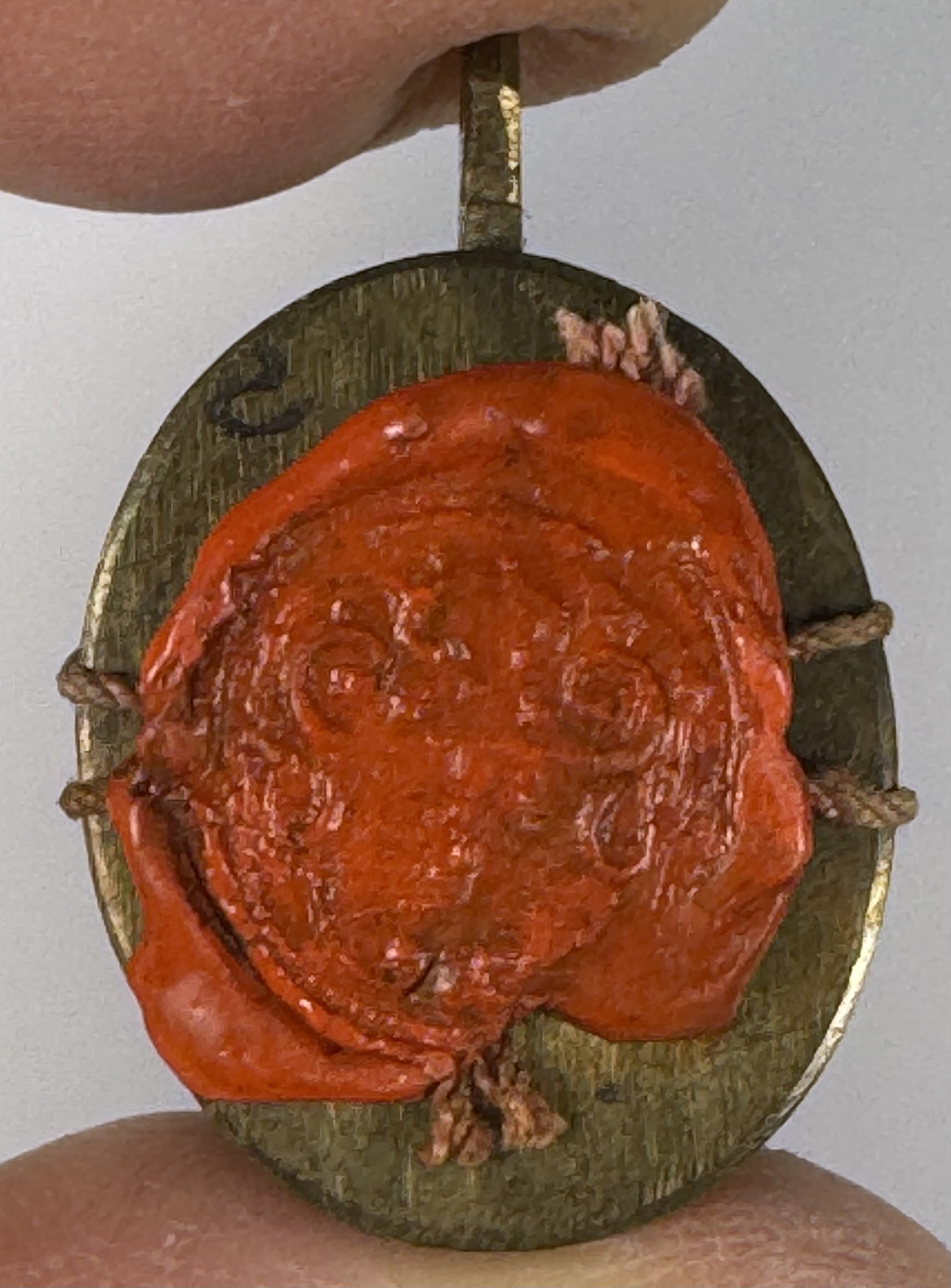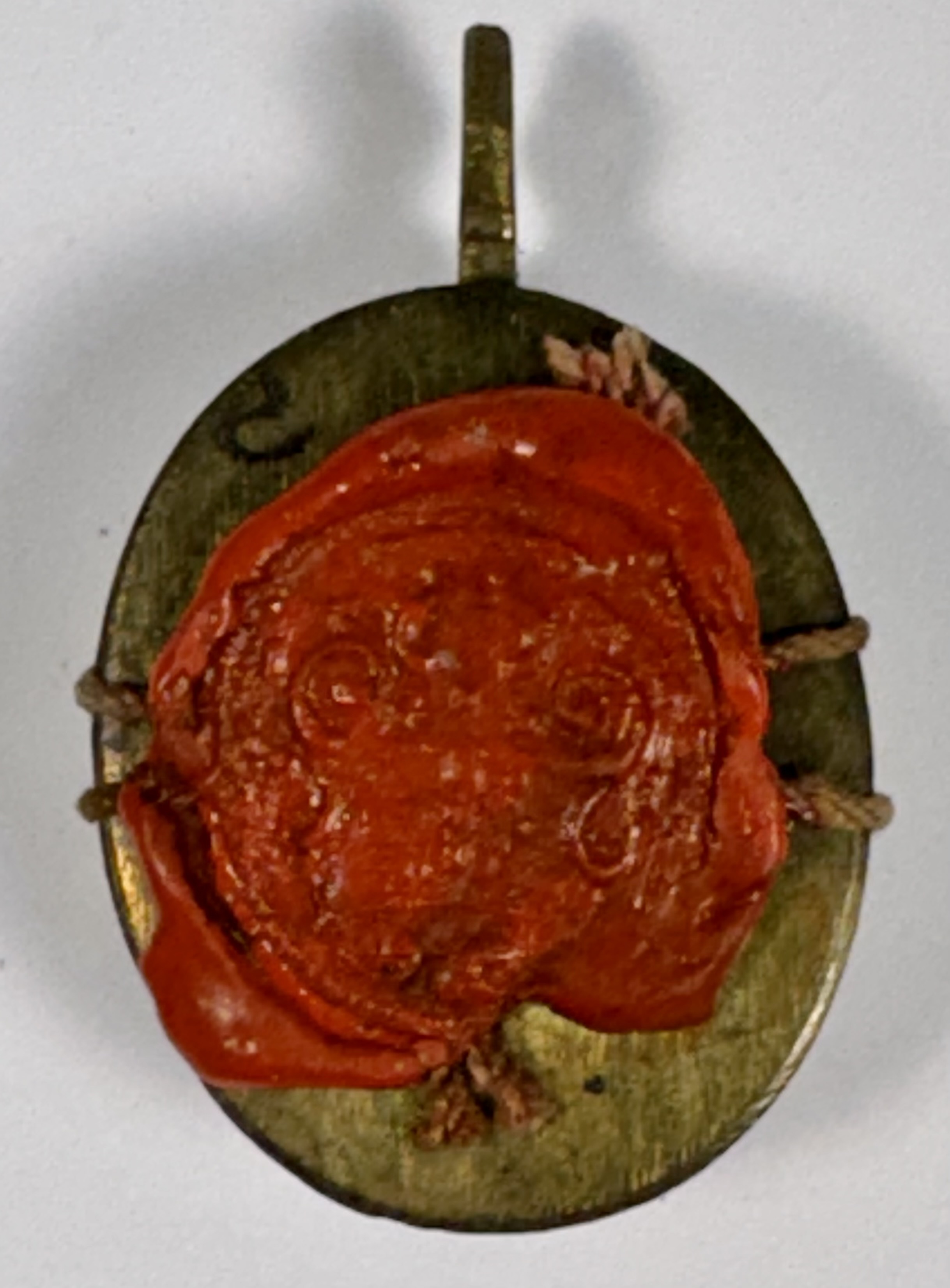 Oval glass-fronted brass pendant reliquary theca housing the first-class relics of two Christian Martyr saints: Saint Mary of Escalos de Arribaand Saint Candida of Rome. The relics are affixed to a red silk ground surrounded by silver wire and gilt paperolle ornamentation and identified in Latin on manuscript cedulae labels as S. Mariae Esc. // S. Candidae M. (Saint Mary of Escalos// Saint Candida, Martyr). On the back, the theca is secured by a perfectly preserved seal of red Spanish wax bearing an imprint with a coat of arms of Fr. Antonio Cantoni (†1781), Bishop of Faenza, Italy (1742–1767) and Archbishop of Ravenna, Italy (1767–1781).