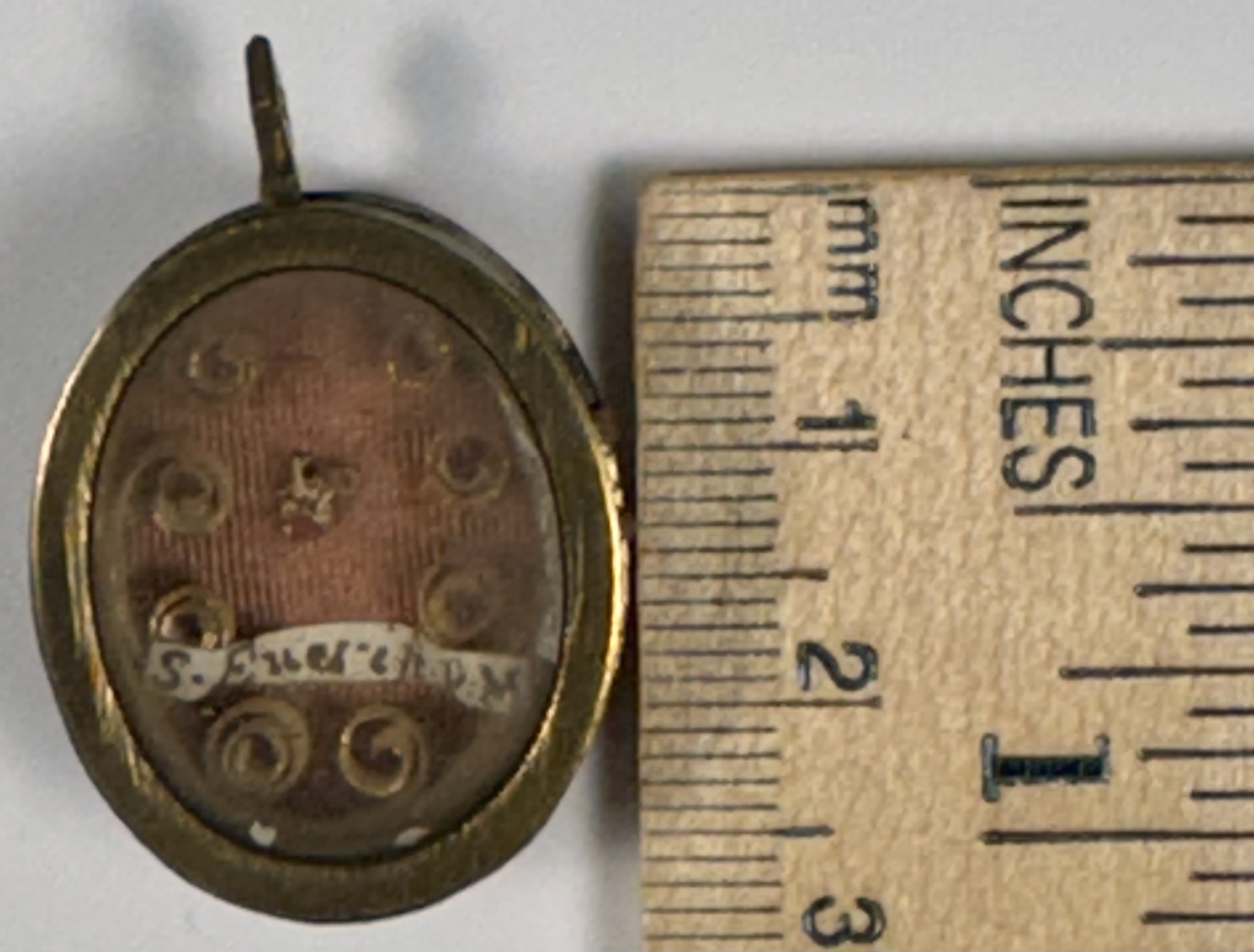 Oval glass-fronted brass pendant reliquary theca housing the first-class ex ossibus (of the bone) relic of Saint PopeEutychian. The relic is affixed to a red silk ground surrounded by gilt paperolle ornamentation and identified in Latin on a manuscript cedula label as S. Eutuchi P.M. (Saint Eutychian Pope & Martyr). On the back, the theca is secured with a perfectly preserved seal of red Spanish wax bearing an imprint with a coat of arms of Fr. Antonio Cantoni (†1781), Bishop of Faenza, Italy (1742–1767) and Archbishop of Ravenna, Italy (1767–1781).