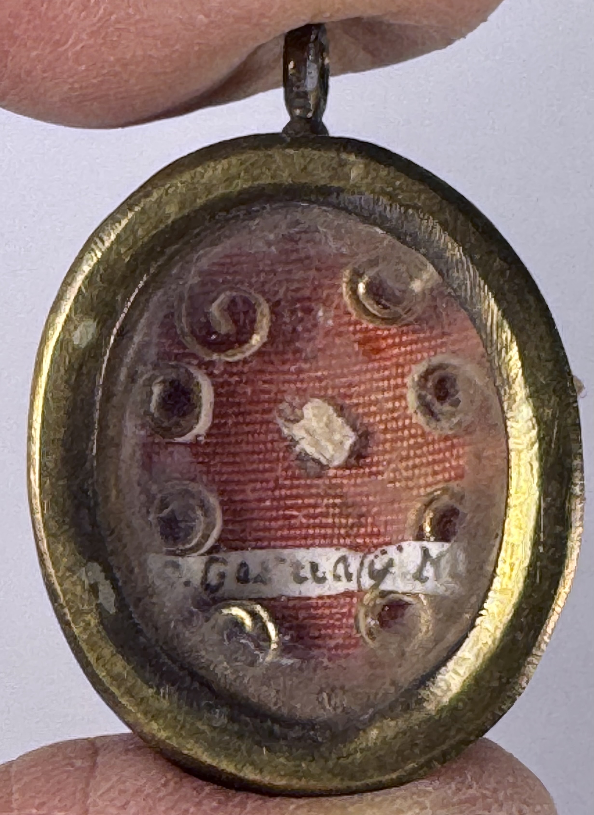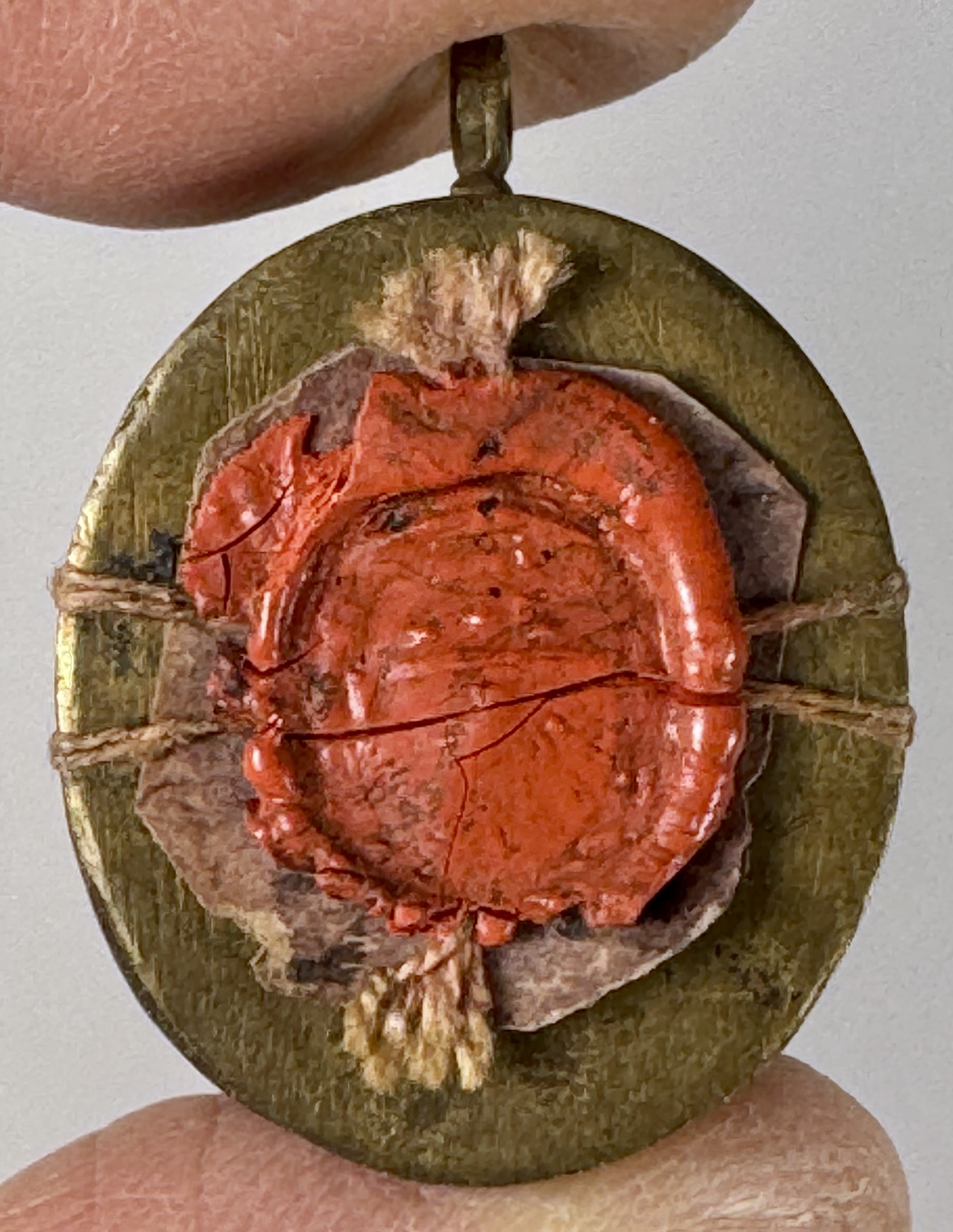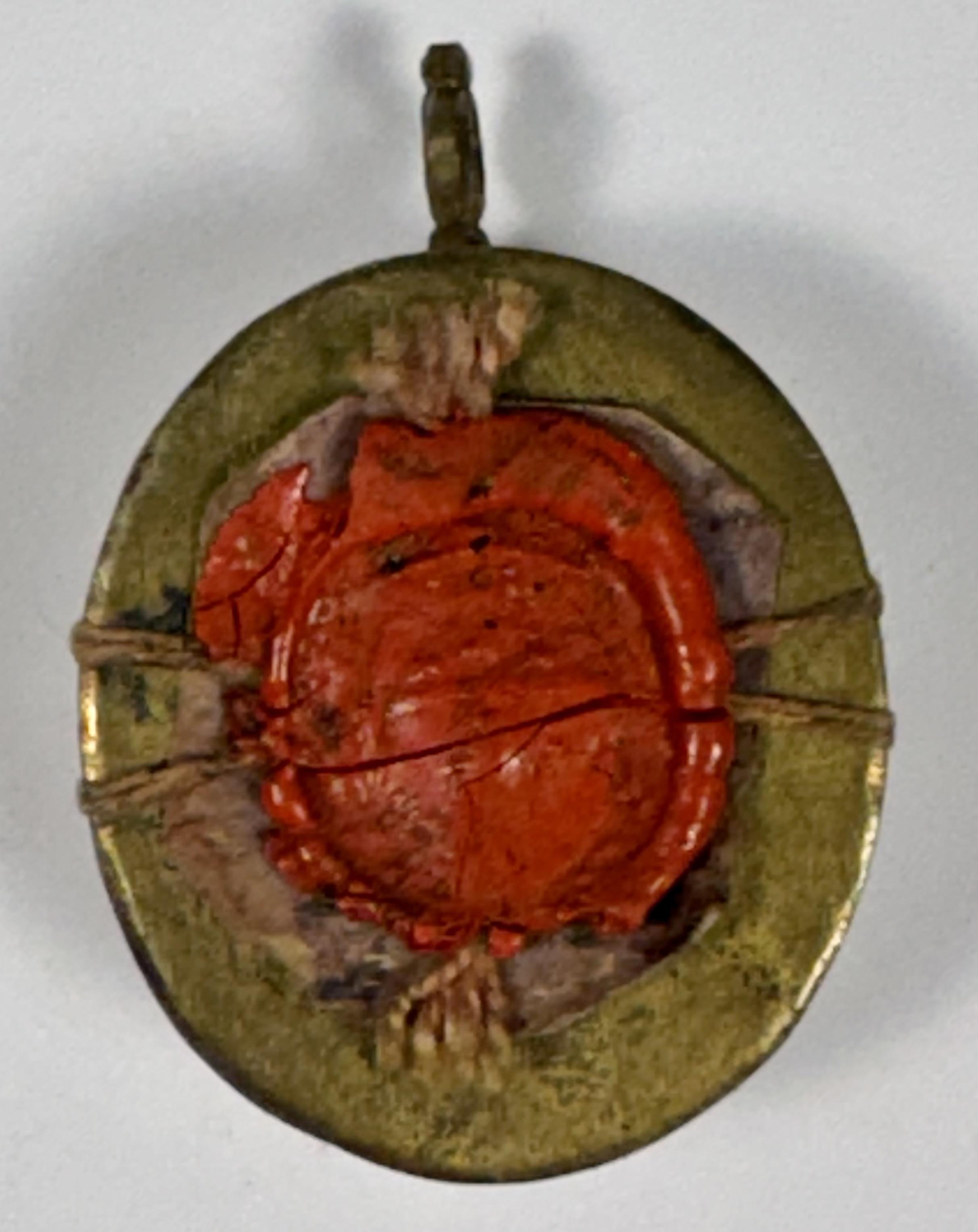 Oval glass-fronted brass reliquary theca housing first-class ex ossibus (of the bone) relic of Saints Gervasius. The relic is affixed to a red silk ground surrounded by gilt paperolle ornamentation and identified in Latin on a manuscript cedula label as S. Gerasÿ M. (Saints Gervasius, Martyr). On the back, the theca is secured with a perfectly preserved seal of red Spanish wax bearing an imprint with a coat of arms of Fr. Antonio Cantoni (†1781), Bishop of Faenza, Italy (1742–1767) and Archbishop of Ravenna, Italy (1767–1781).