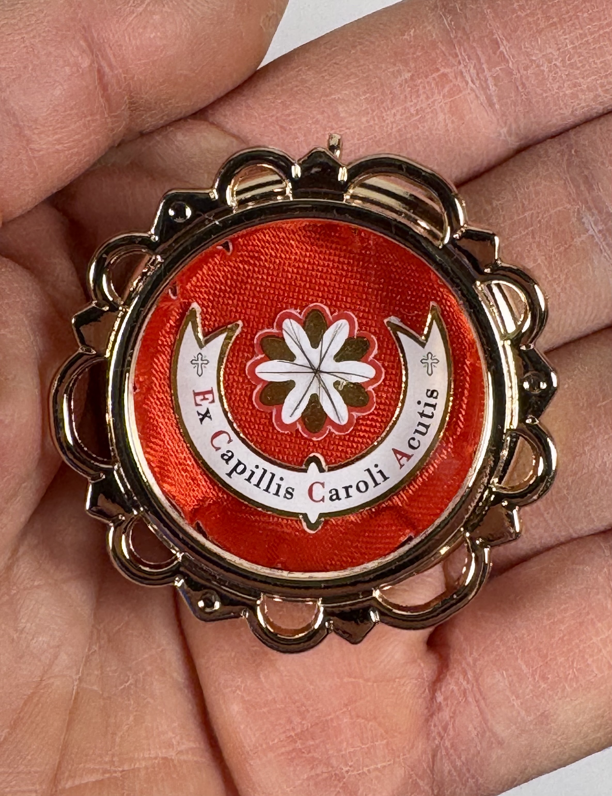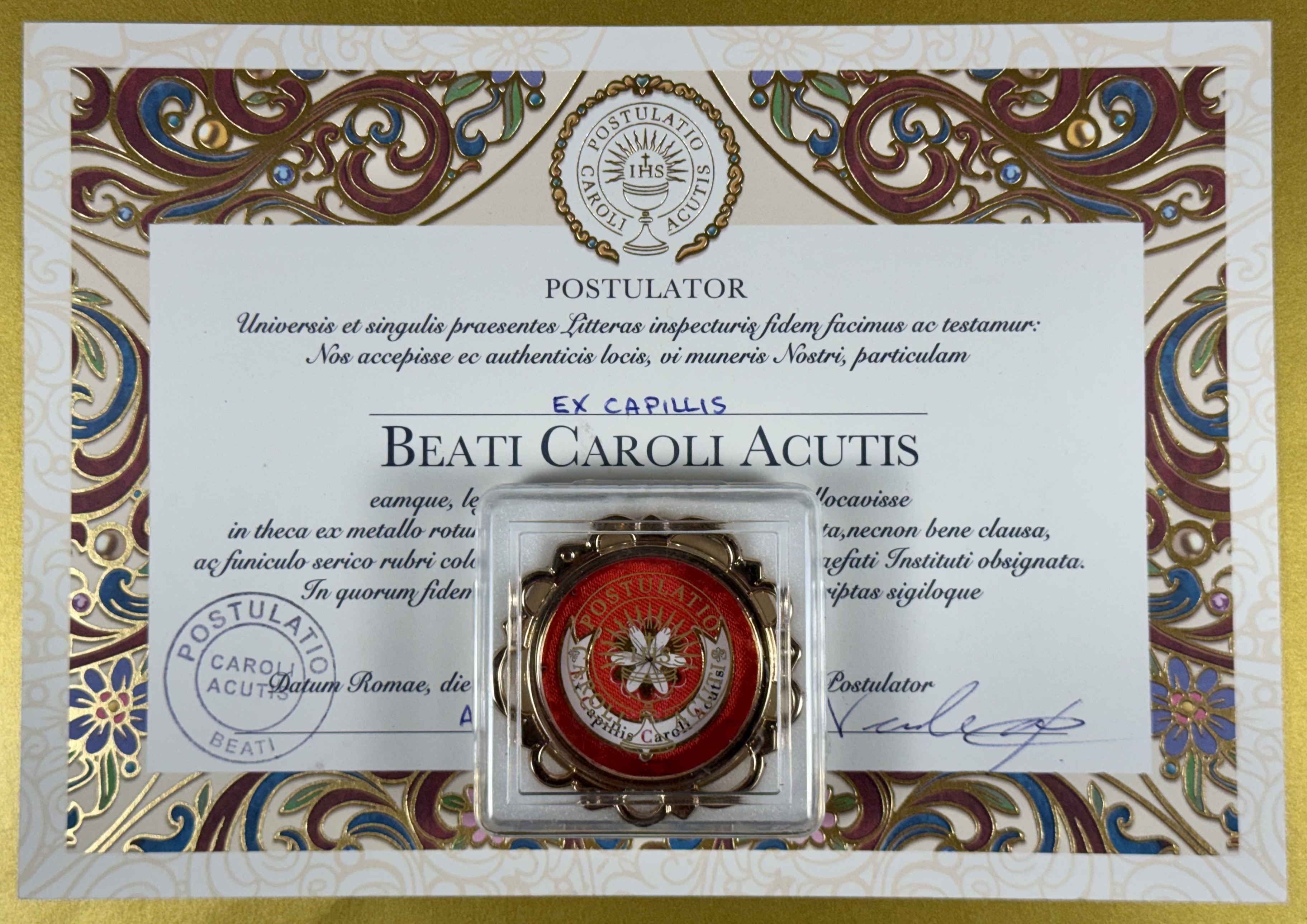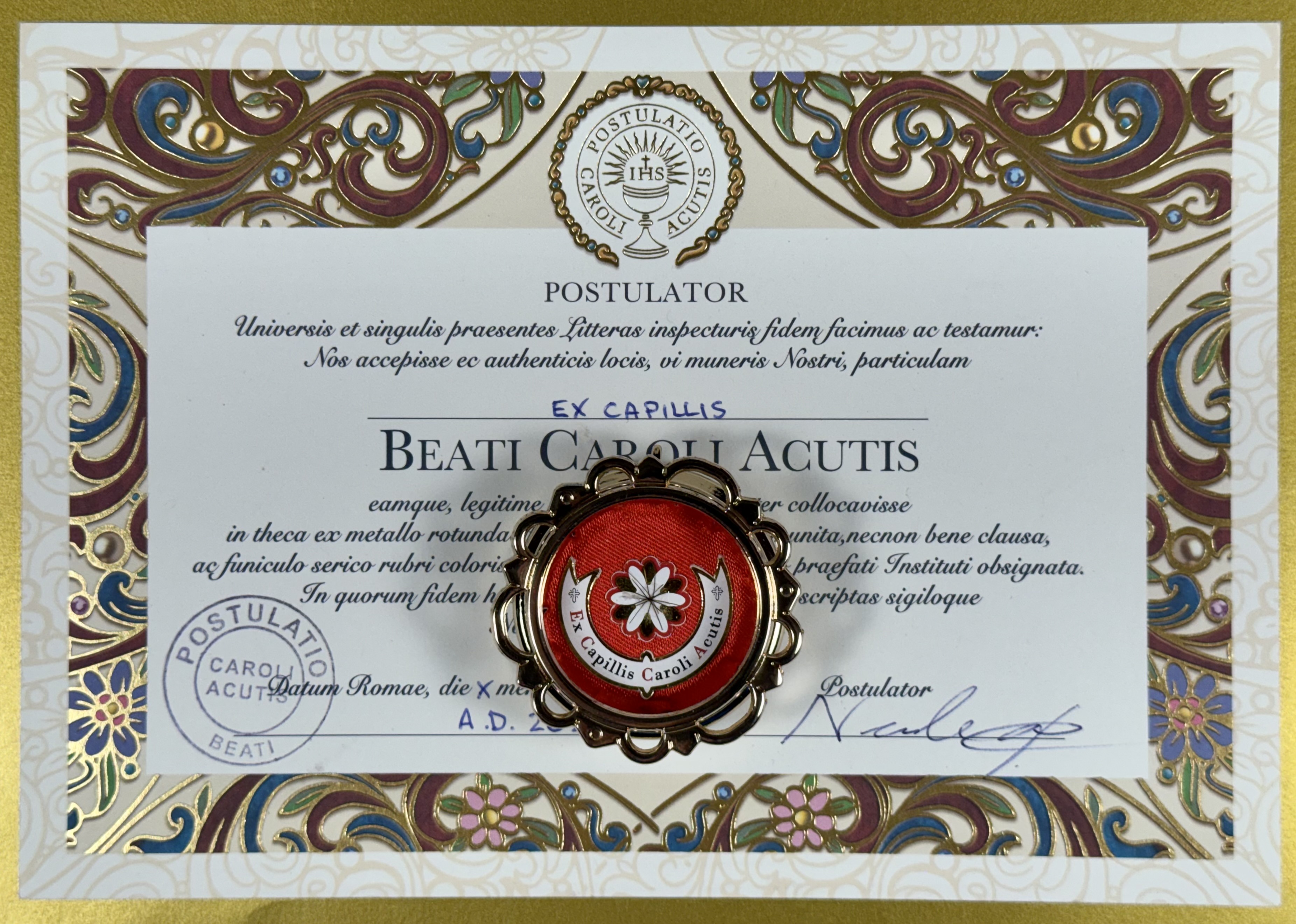 Extremely rare large round glass-fronted metal reliquary theca housing the first-class Ex Capillis (of the Hair) pre-canonization relics of Saint Carlo Acutis. The relics consisting of multiple clippings of hair are affixed to a six-petal flower-shaped paper on a ground of red silk and are identified in Latin on a bi-color typeset cedula label as Ex Capillis Caroli Acutis (Of the hair of Carlo Acutis).  On the back, under a protective cap, the theca is secured with a seal of red Spanish wax bearing an imprint of the Postulator General for the Cause of the Beatification of Carlo Acutis. The reliquary is housed in its original case of issue, with a seal of the Postulator General for the cause of Carlo Acutis' canonization. The relic is accompanied by the original matching authentics document issued and sealed by the order of the Postulator General on October 10, 2020 - the very day of his beatification. Please note that, due to its scarcity, this item is not subject to any discounts.