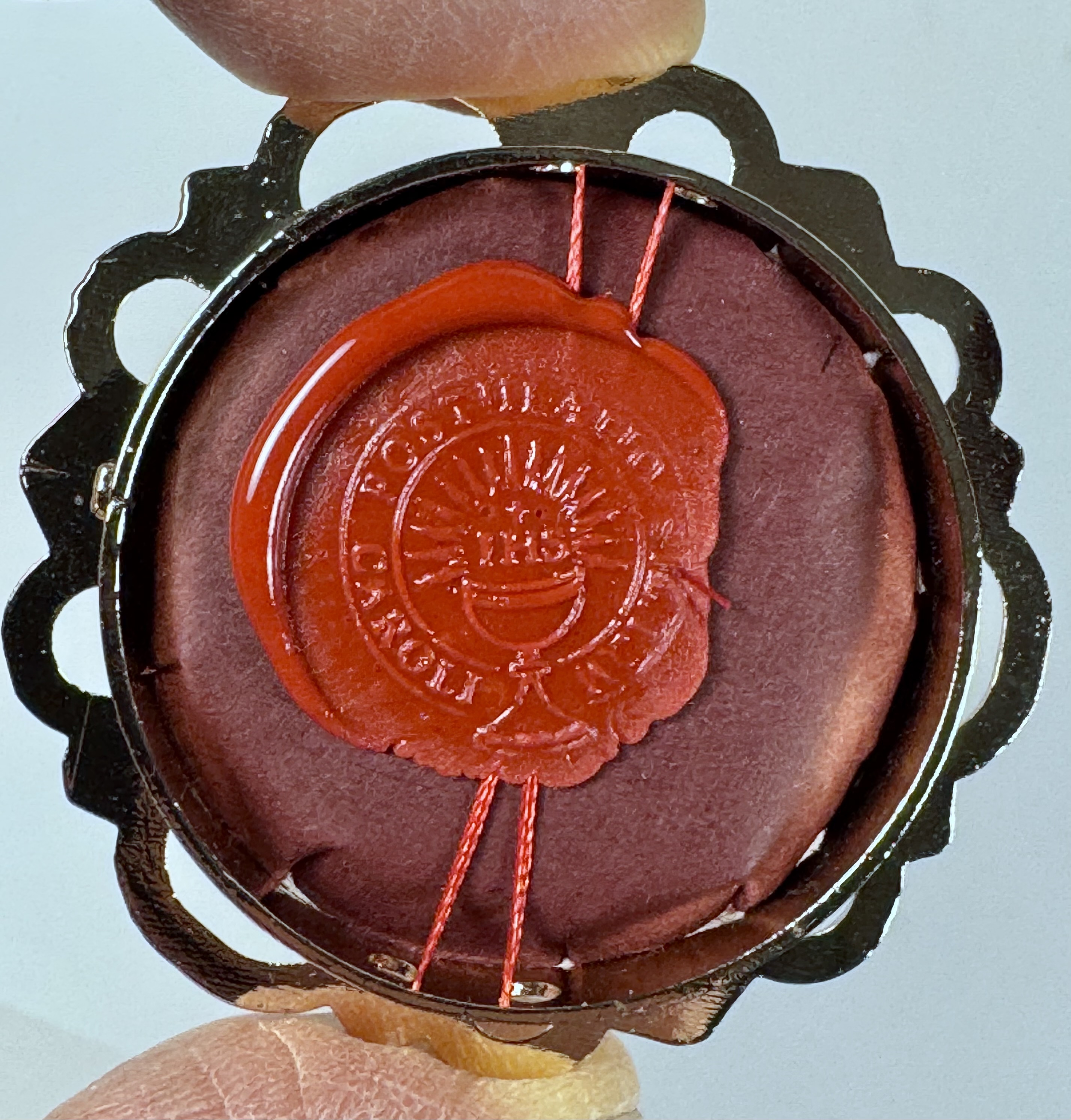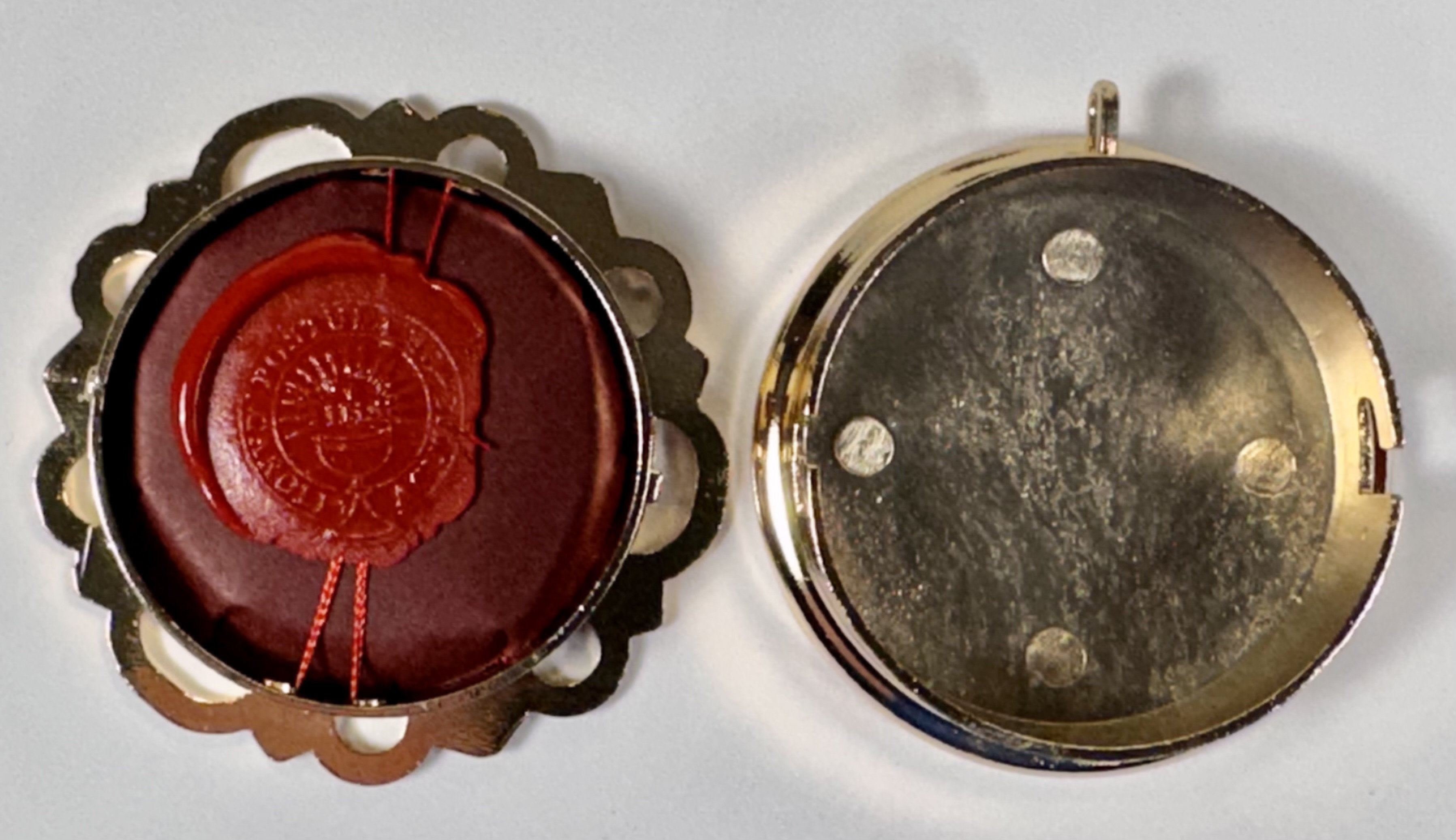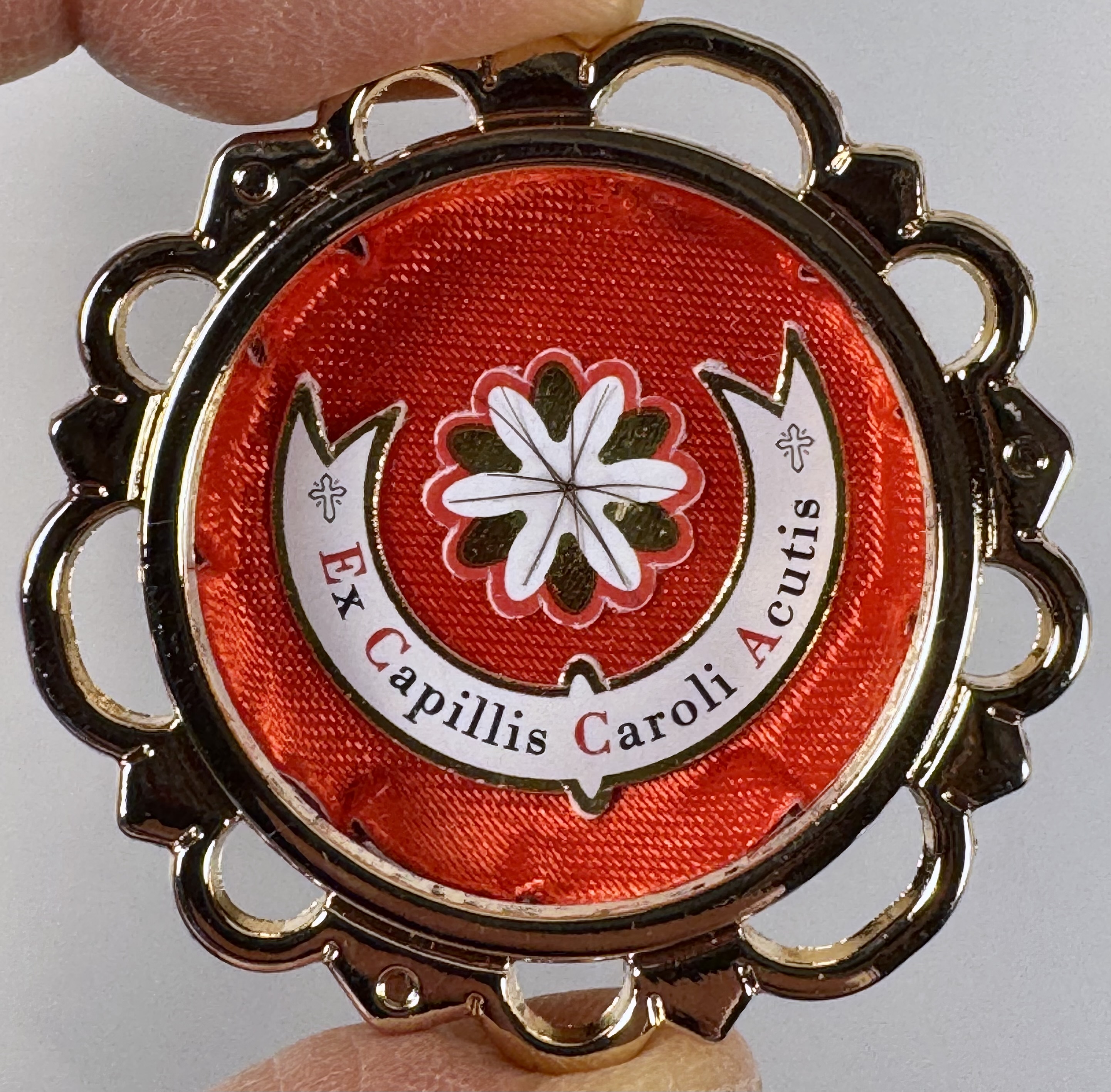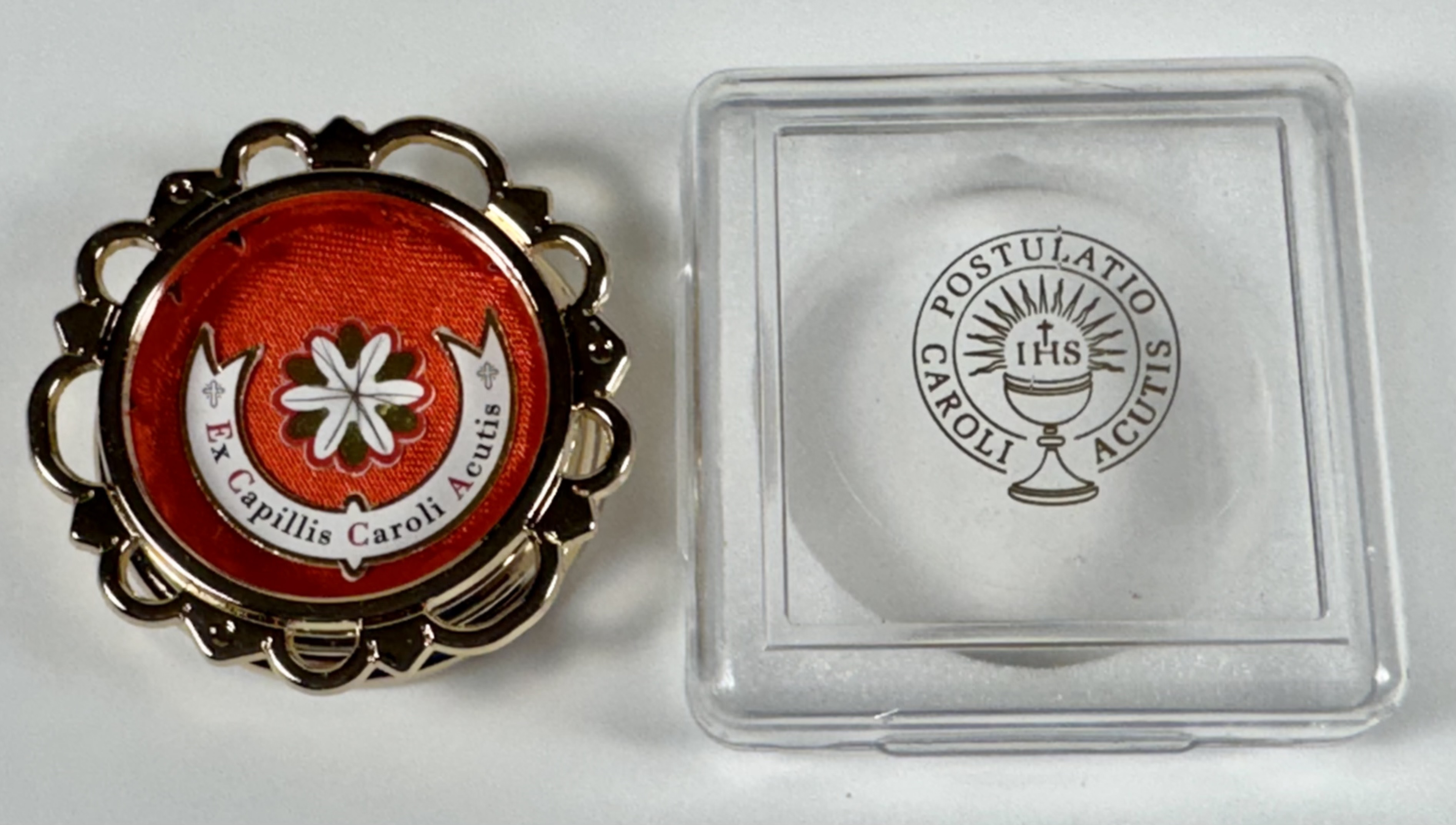 Extremely rare large round glass-fronted metal reliquary theca housing the first-class Ex Capillis (of the Hair) pre-canonization relics of Saint Carlo Acutis. The relics consisting of multiple clippings of hair are affixed to a six-petal flower-shaped paper on a ground of red silk and are identified in Latin on a bi-color typeset cedula label as Ex Capillis Caroli Acutis (Of the hair of Carlo Acutis).  On the back, under a protective cap, the theca is secured with a seal of red Spanish wax bearing an imprint of the Postulator General for the Cause of the Beatification of Carlo Acutis. The reliquary is housed in its original case of issue, with a seal of the Postulator General for the cause of Carlo Acutis' canonization. The relic is accompanied by the original matching authentics document issued and sealed by the order of the Postulator General on October 10, 2020 - the very day of his beatification. Please note that, due to its scarcity, this item is not subject to any discounts.