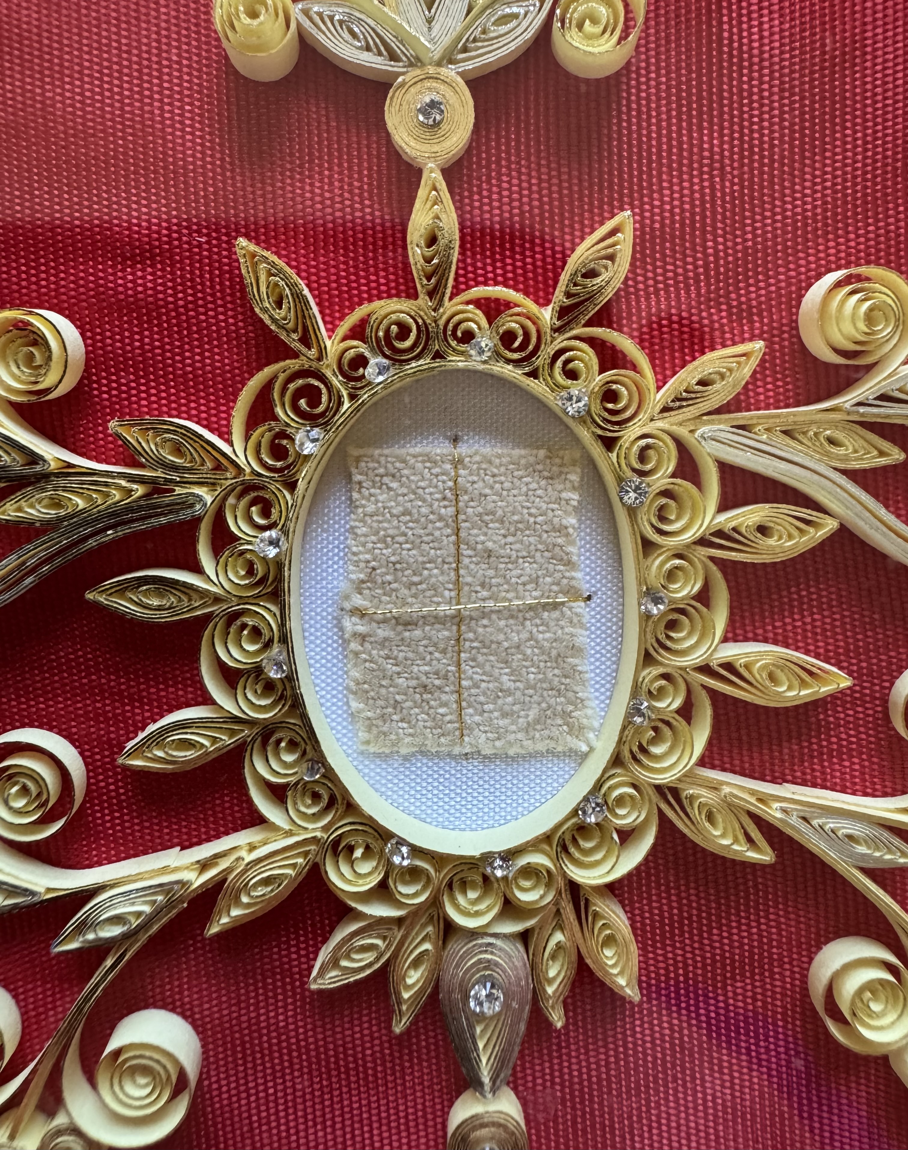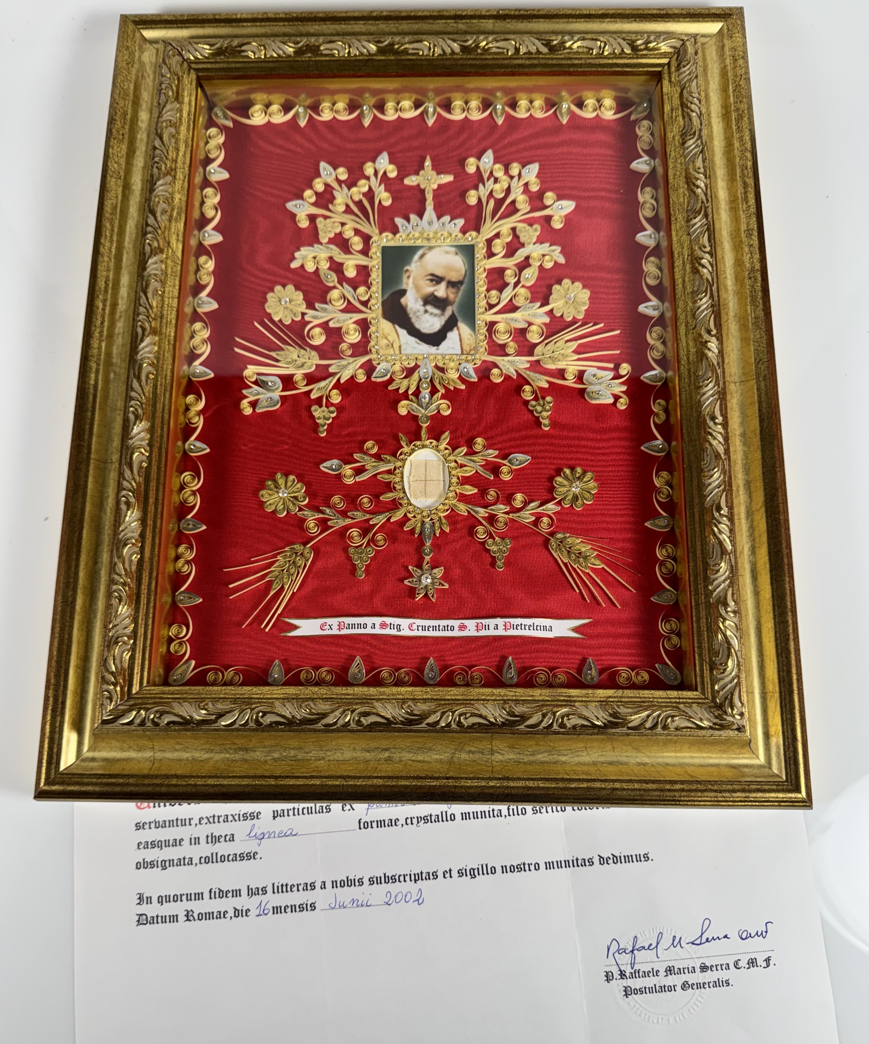 Large gilt wood glass-fronted reliquary frame housing the first-class ex panno a stigmatibus cruentato (from a cloth bloodied by the stigmata) relics of St. Padre Pio. A very large fragment of the cloth relic is affixed under a portrait of the Saint to a red silk ground profusely decorated with an elaborate gilt paperolle ornamentation and identified in Latin on a typeset cedula label as Ex Panno a Stig. Cruentato S. Pii a Pietrelcina (from a cloth bloodied by the stigmata of Saint Pio of Pietrelcina). On the back, the frame is secured with a crisscrossed red silk ribbon, held in place by four seals of red Spanish wax bearing an imprint of a coat of arms of the Congregation of Missionary Sons of the Immaculate Heart of the Blessed Virgin Mary (Known as the Claretian Missionaries). The relic is accompanied by the original matching authentics document issued by the Postulator General of the Order on June 16, 2002 - on the very day of his canonization.