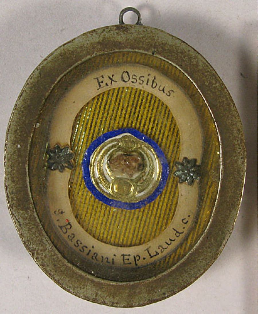 Glass-fronted silvered metal reliquary theca housing first class ex ossibus (of the bone) relic of Saint Bassianus. The relic is affixed to the backround of gold silk and identified on a paper cedula as Ex Ossibus / S. Bastiani Ep. Laud. c(onfessor). The theca is secured on the back with a seal of red Spanish wax with inprint of a coat of arms of a Catholic Abbot.