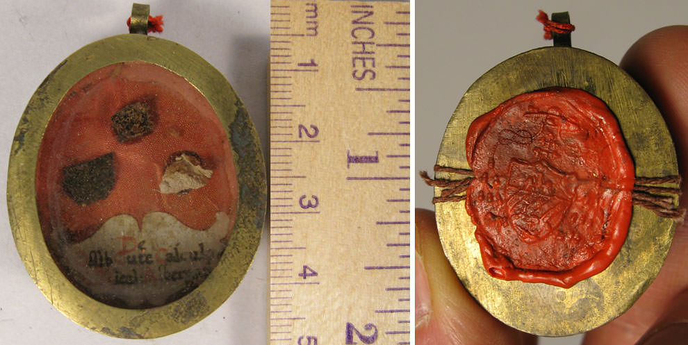 Crystal-fronted brass reliquary theca housing first class relics (of bone, blood, and skin) of the Blessed Niccolo Albergati. The relic is identified on a paper cedula and secured by perfectly preserved seal of red Spanish wax with coat of arms of Italian Archbishop.