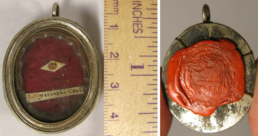 Italian oval glass-fronted silver reliquary theca housing ex ossibus relic of Saint Hyacintha Mariscotti. The relic is identified on a paper cedula as S. Hiacinti Conf, and secured by perfectly preserved seal of red Spanish wax with coat of arms of Luigi Fransoni († 1862) Archbishop of Turin (1832-1862).