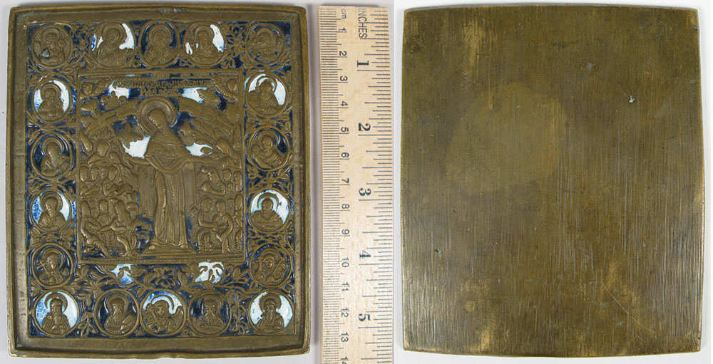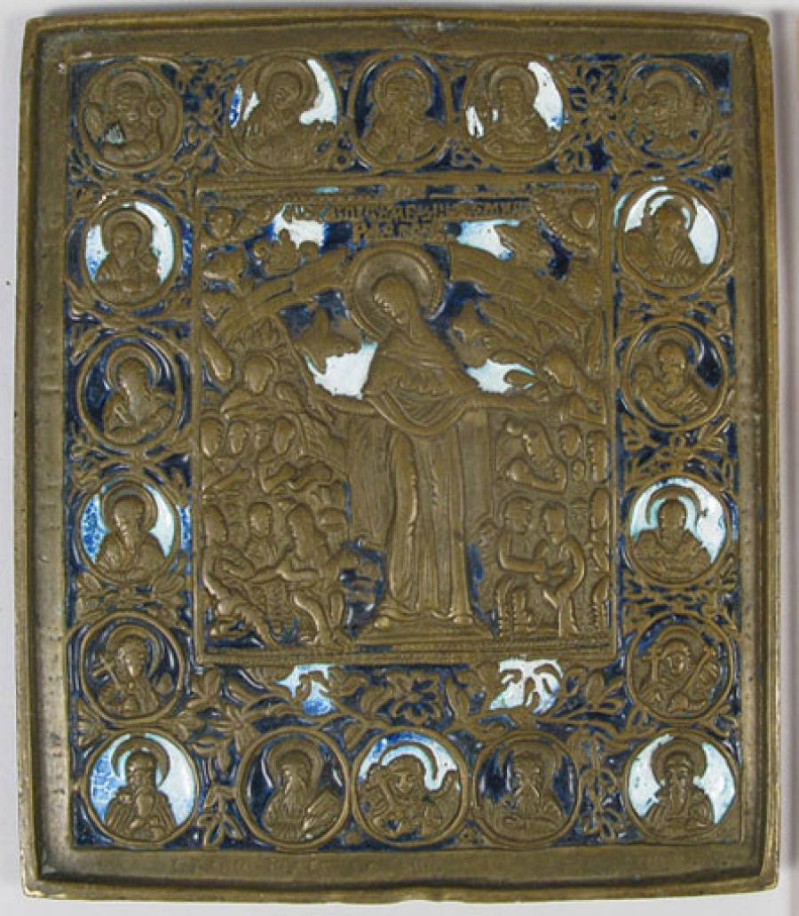 Mother of God, Joy of All Who Sorrow of Moscow is the name of a popular wonderworking Russian Orthodox icon dating to a miracle that occurred in 1688, when a woman named Euphymia received healing from sickness after obeying a voice telling her to find this icon and have the priest celebrate a prayer with blessing of water. The design of this icon depicts the Mother of God, standing among the flowers of paradise flanked suppliants asking for her intercession. Eighteen roundels on the borders depicting the Deisis, Archangels, and Prophets.