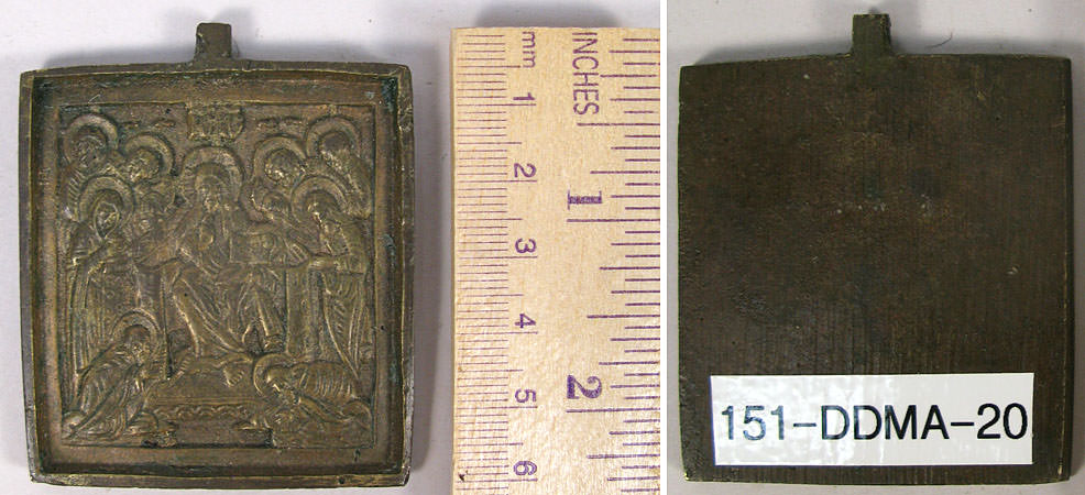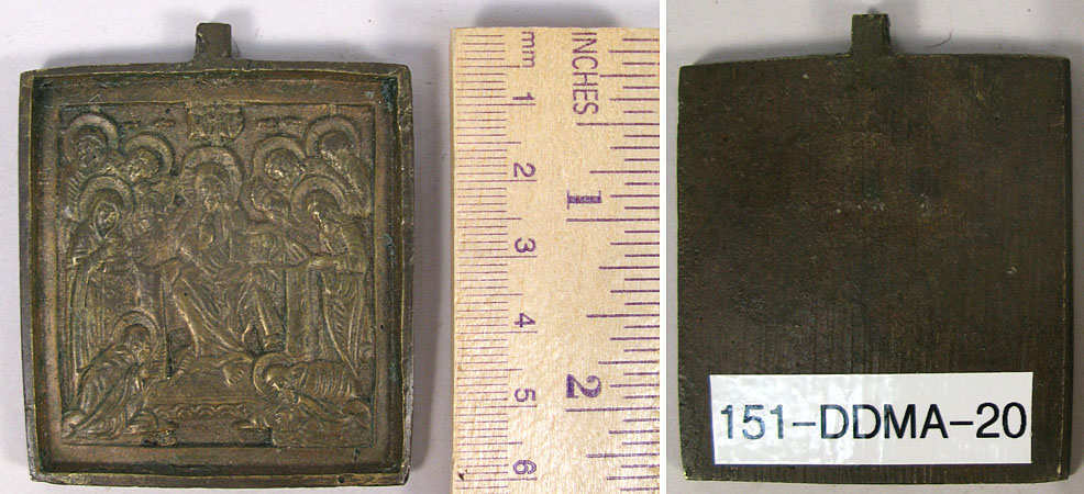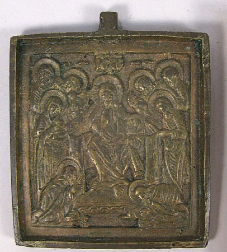 The Savior of Smolensk is the iconographic type of Jesus Christ represented as the enthroned Pantocrator – full figured with his right hand raised in a blessing gesture and his right hand holding a book of Gospels. He is flanked by the Virgin Mary and Saint John the Baptist and surrounded by the Apostles. To either side of Him, kneeling in prayer at His feet, are Saint Sergius of Radonezh and the Venerable Barlaam of Khutyn.