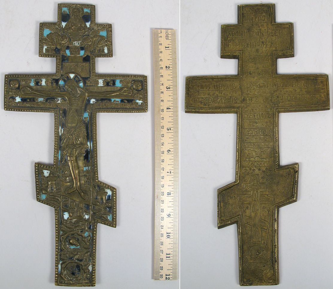 Russian Orthodox eight-ended cross with a scene of the Crucifixion surmounted by two angels and image of God the Father.