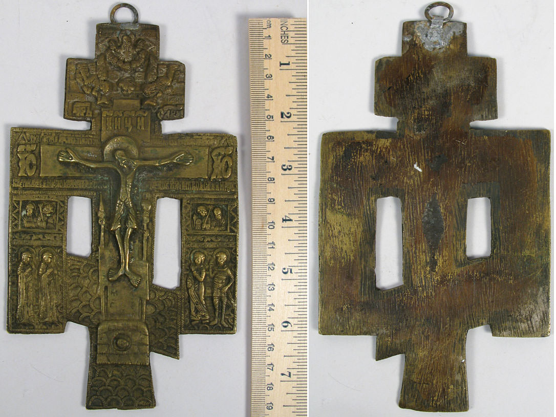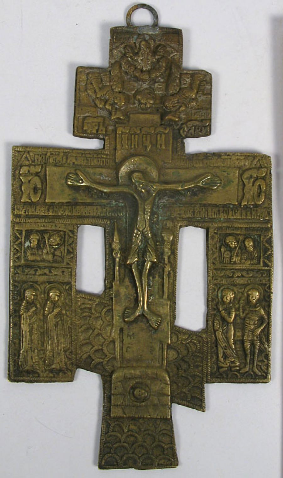 Russian Orthodox eight-sided cross surmounted by two Angels and God Father in Heaven with a scene of the Crucifixion with two rectangular panels (Crucifixion with the Mourners). On the left plate; mourning-Virgin Mary and St. Martha; on the right plate: St. John the Theologian and Saint Martyr Longinus the Centurion.