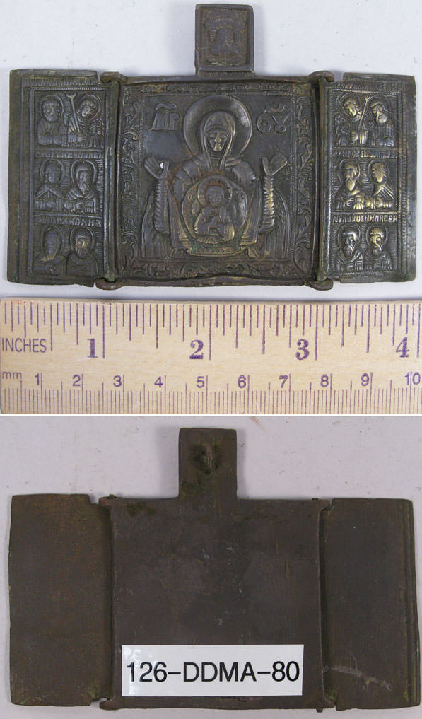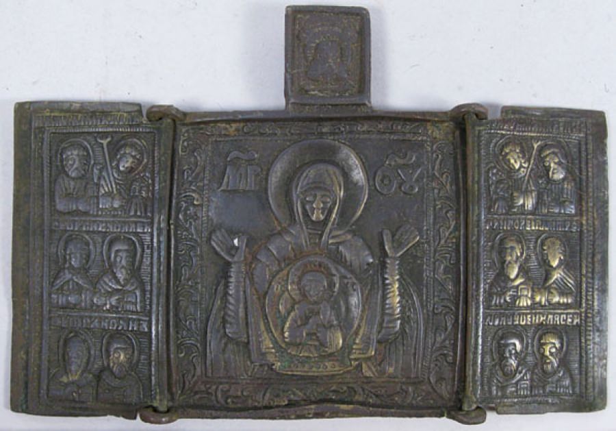 Our Lady of the Sign under Not-Made-By-Hands image of Christ on the central panel, with Archangels, Apostles Peter and Paul, and selected saints on side panels.