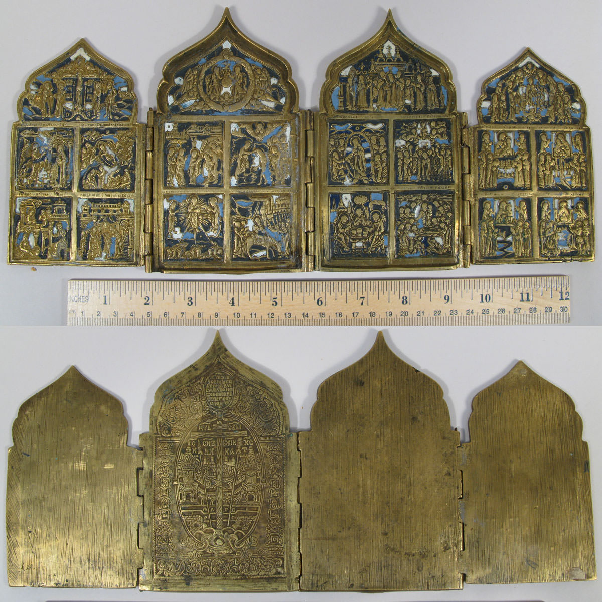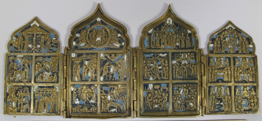 Metal icon of four-folding panels depicting “Twelve Principal Orthodox Feasts and Miracle-working Madonnas.”