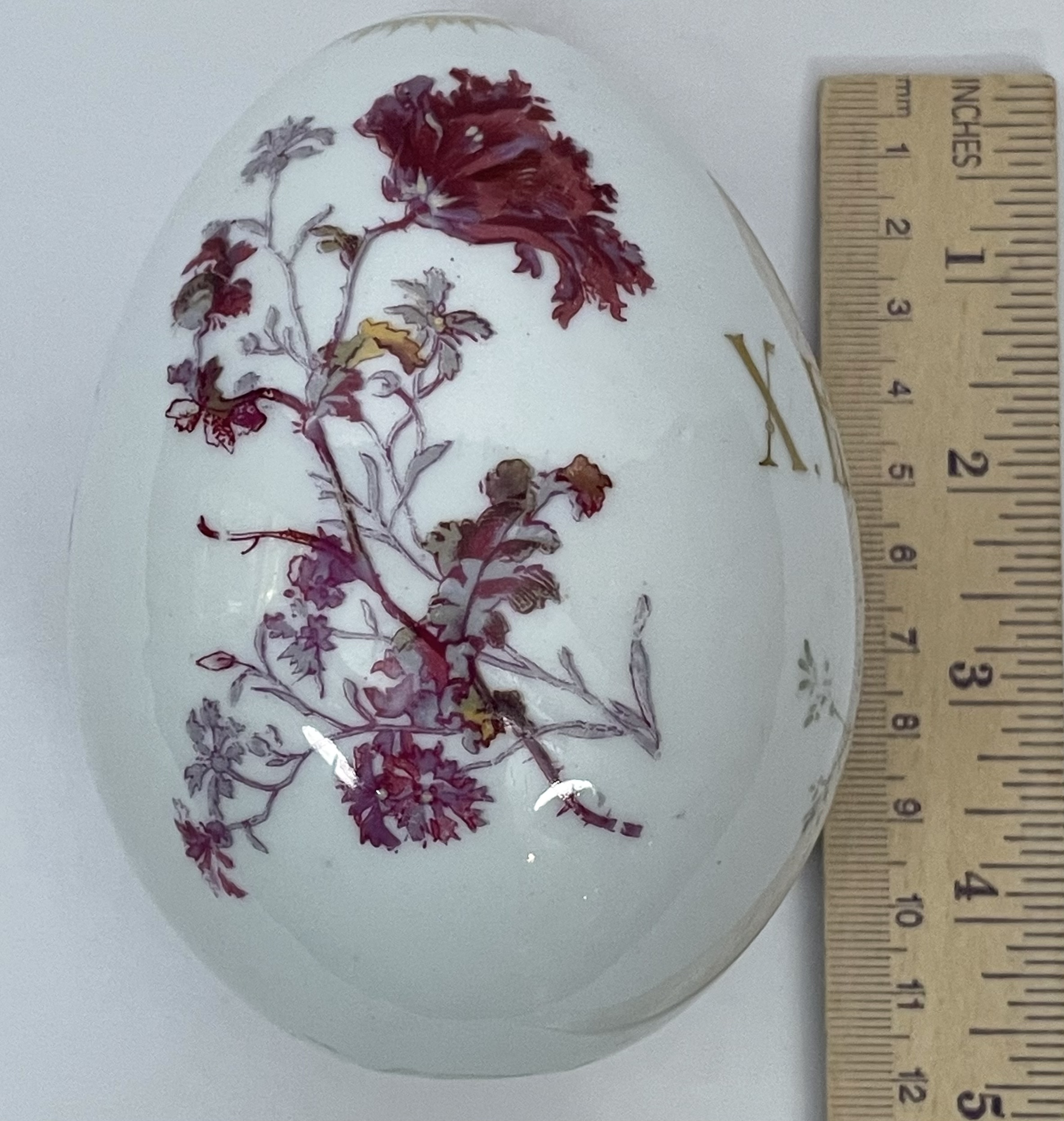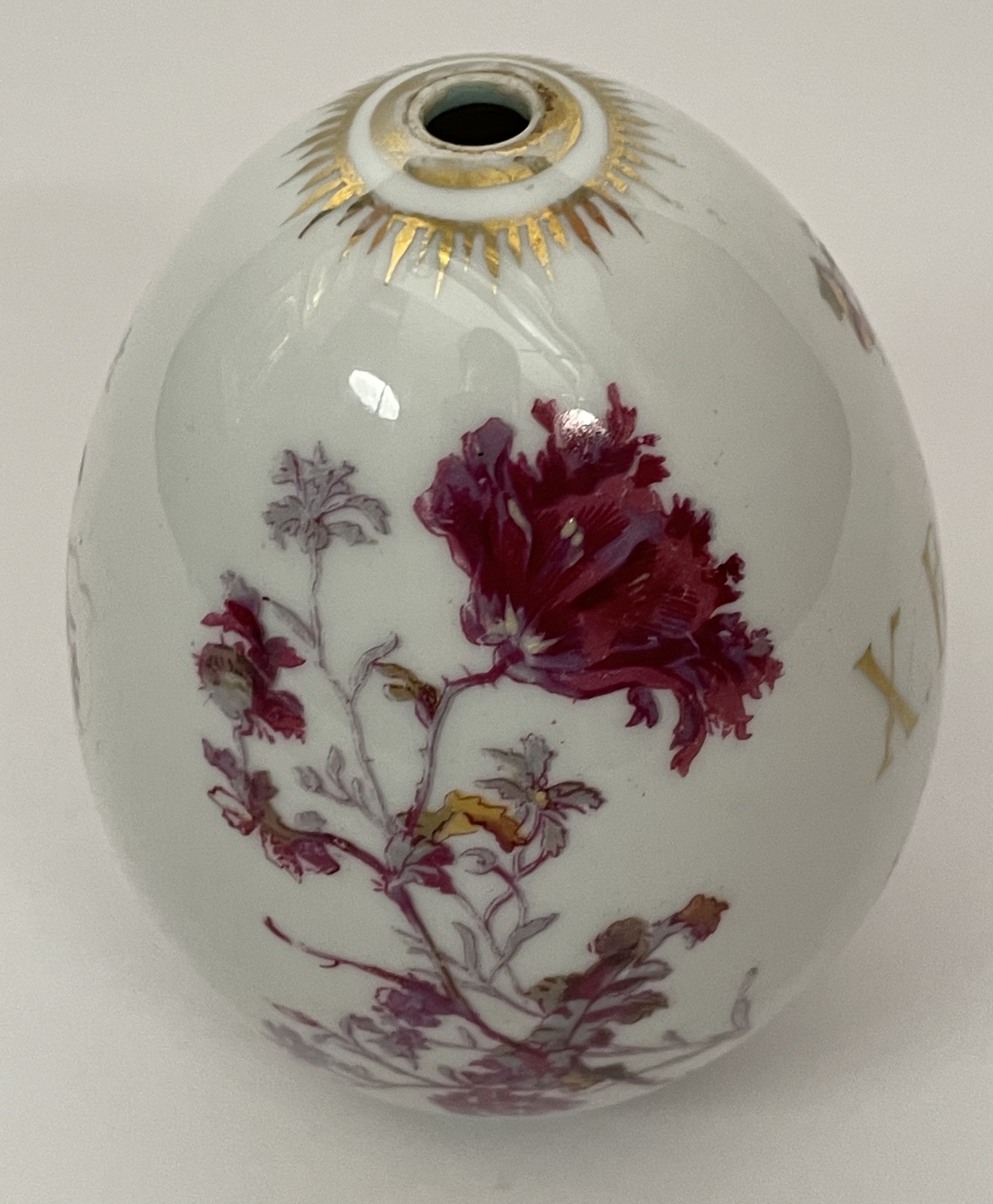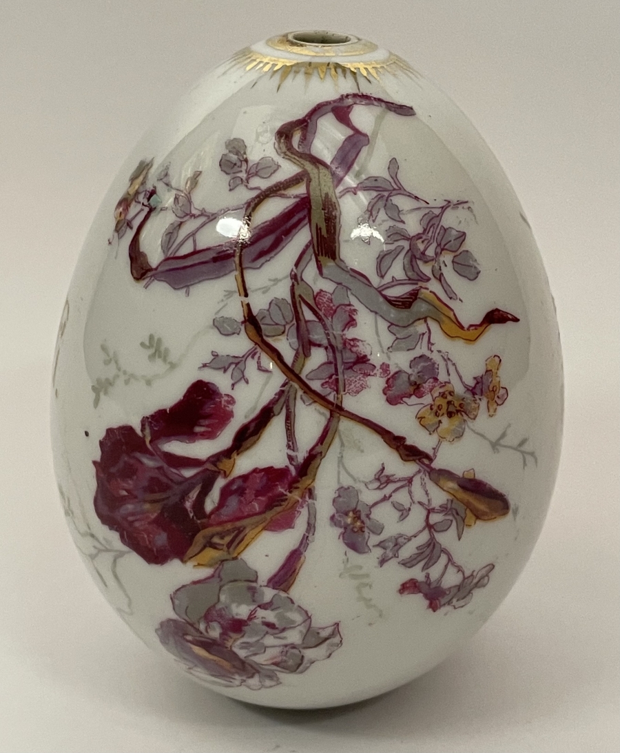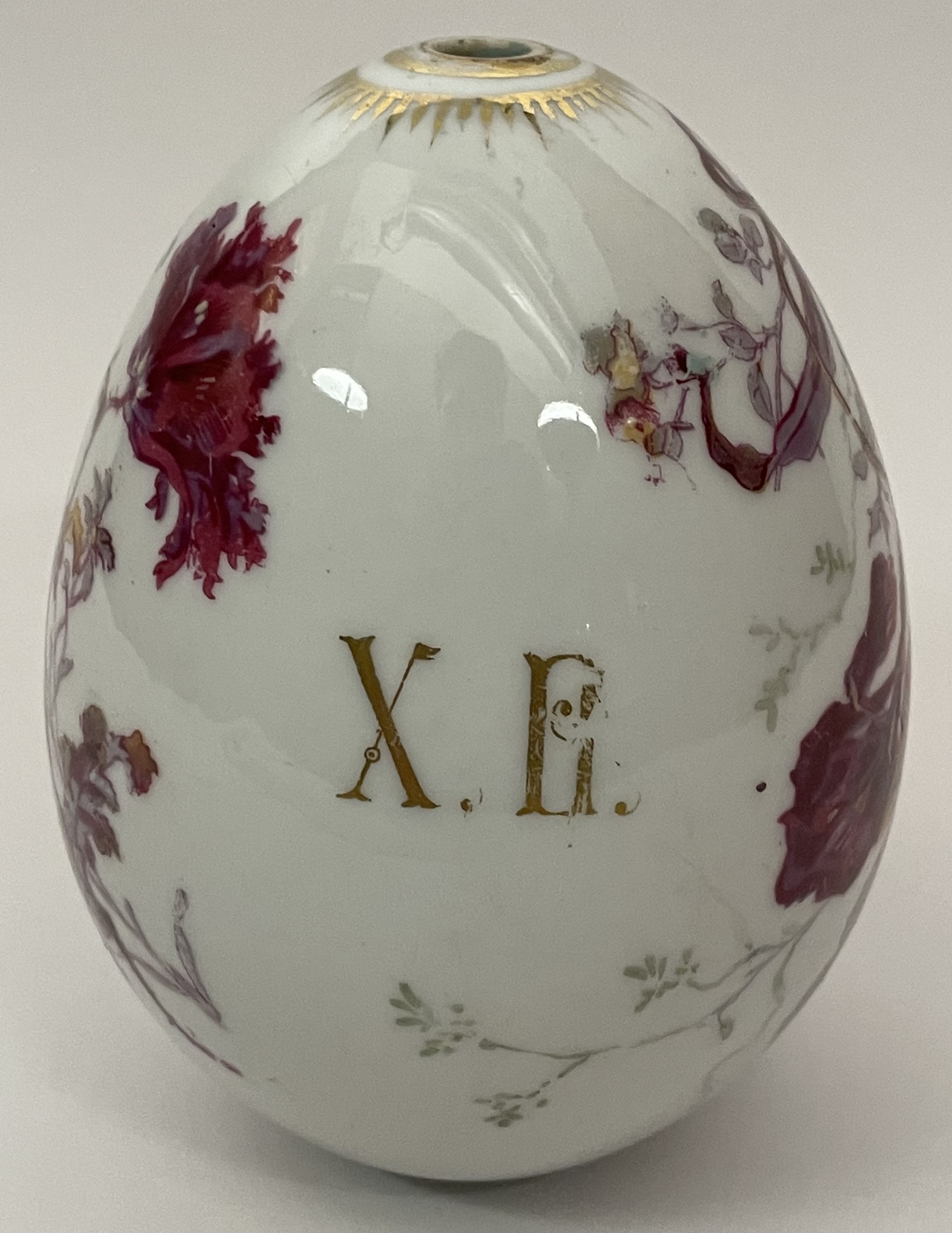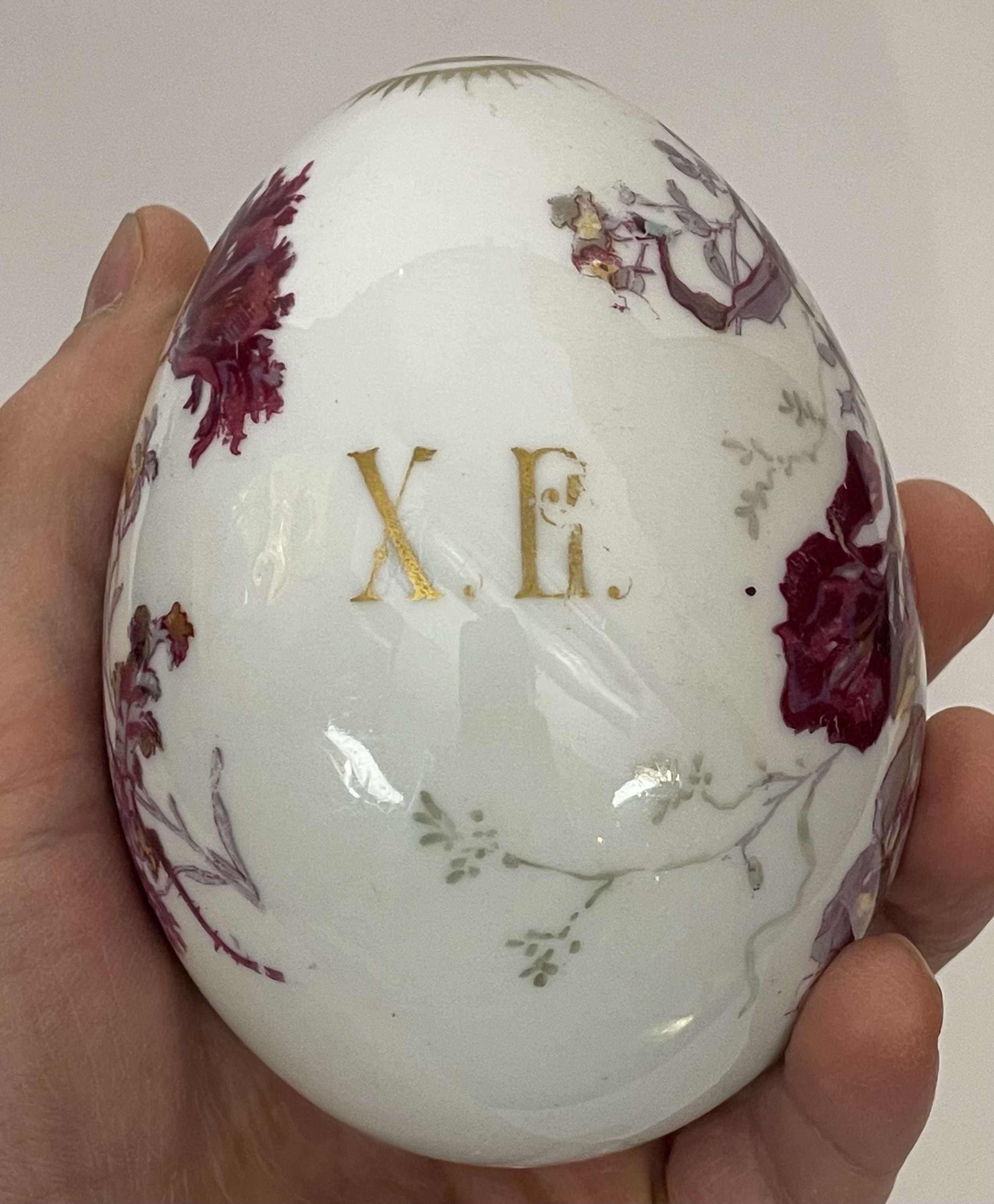 Large Russian Imperial porcelain Easter Egg with hand-painted wild irises and flowers and the abreviation XB for traditional Russian Easter greeting "Christ is Risen!". Very good original condition.