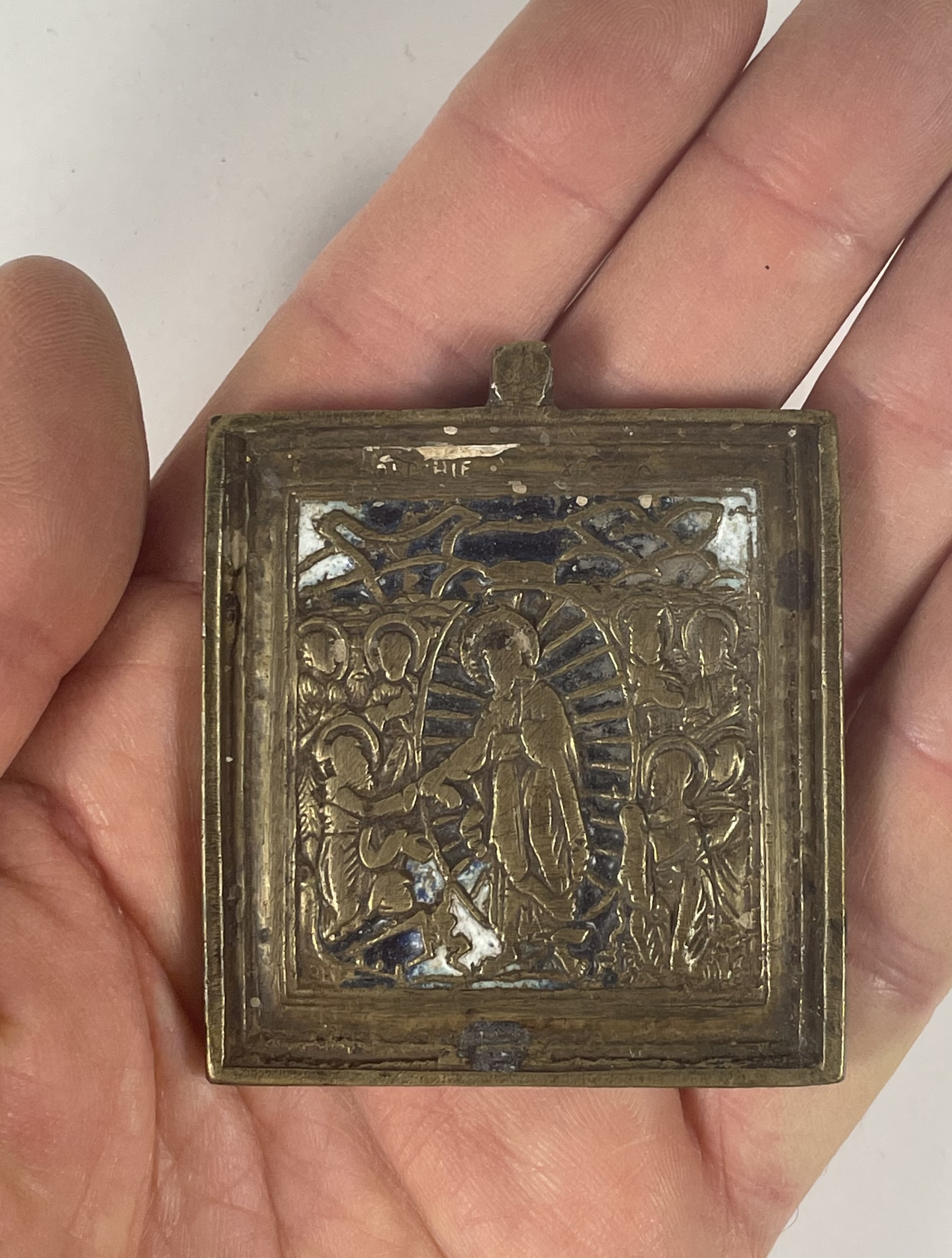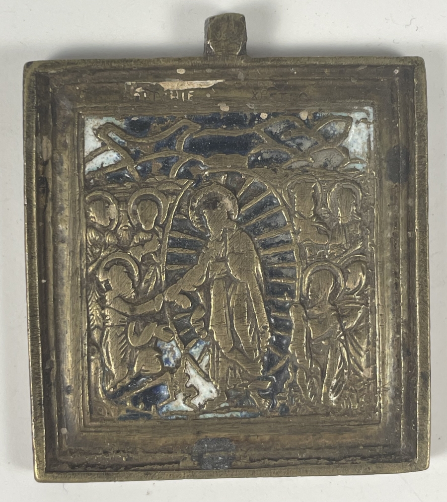 Small brass-cast travel icon depicting the Descent of Christ Into Hades. Christ is shown breaking down the doors of Hell rescuing Adam and Eve. Behind them follow the kings, the prophets, and the righteous of the Old Testament. Feast day: Easter Sunday. Decorated with 2-color enamel.