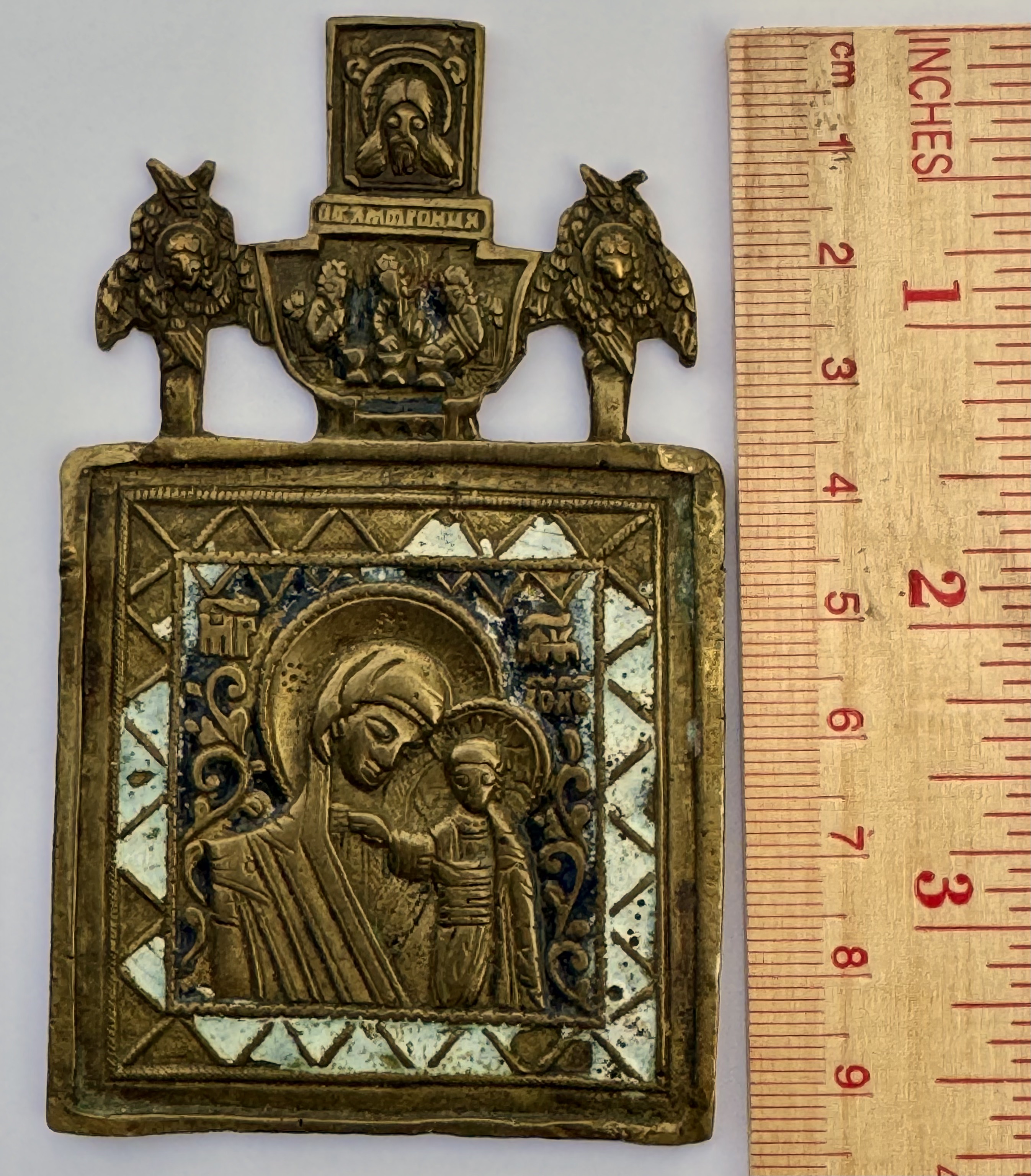 Small brass icon depicting Our Lady of Kazan surmounted by the Holy Mandylion, the Orthodox Trinity, and two cherubs.