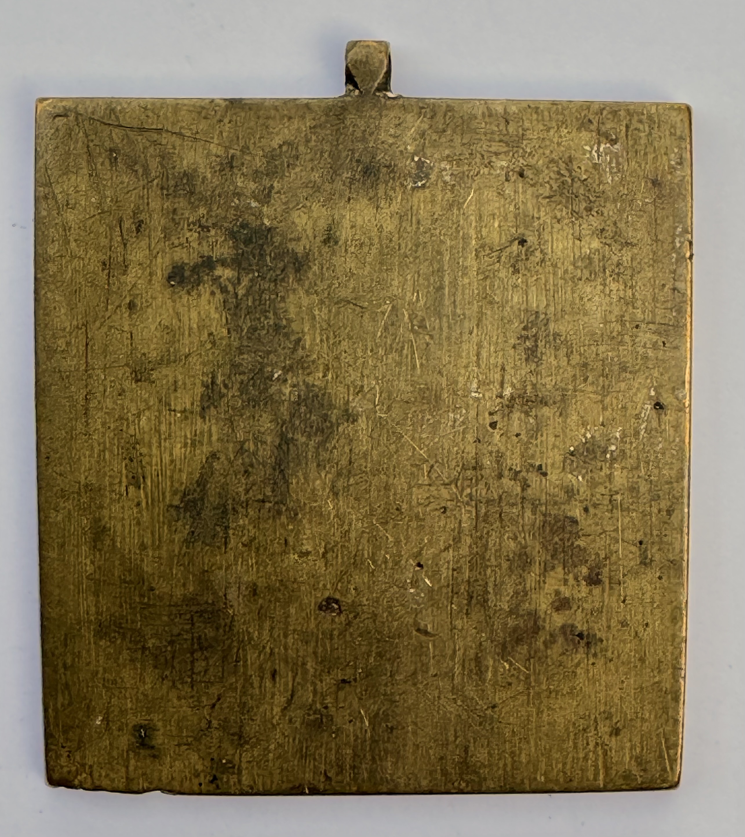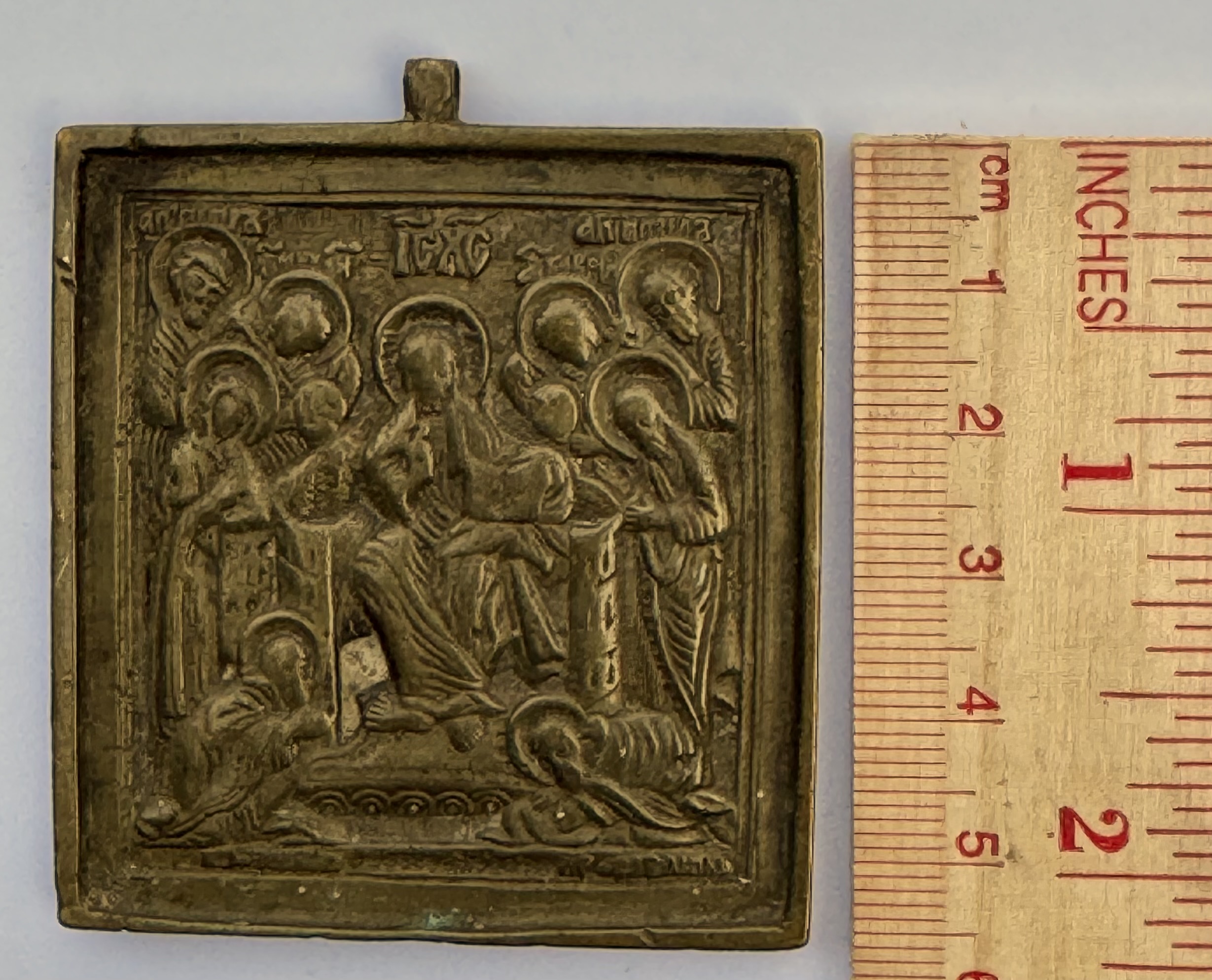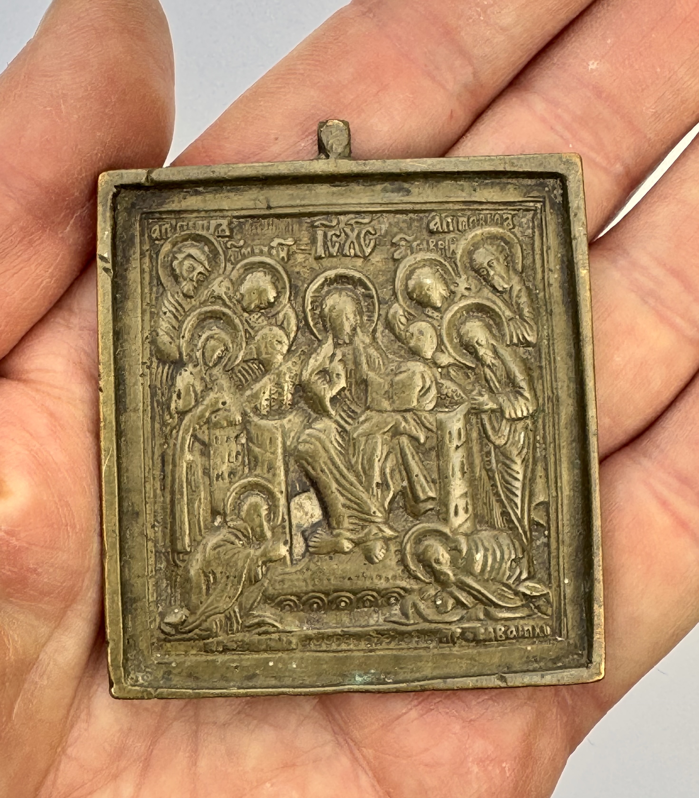 The icon depicts Our Savior of Smolensk, the iconographic type of Jesus Christ represented as the enthroned Pantocrator – full-figured with his right hand raised in a blessing gesture and his right hand holding an open book of Gospels. He is flanked by the Virgin Mary and Saint John the Baptist and surrounded by the Angels and Apostles. To either side of Him, kneeling in prayer at His feet, are Saint Sergius of Radonezh and the Venerable Barlaam of Khutyn. Above them is God the Father in Heaven depicted in a half-circle protruding from the upper center into the border area.