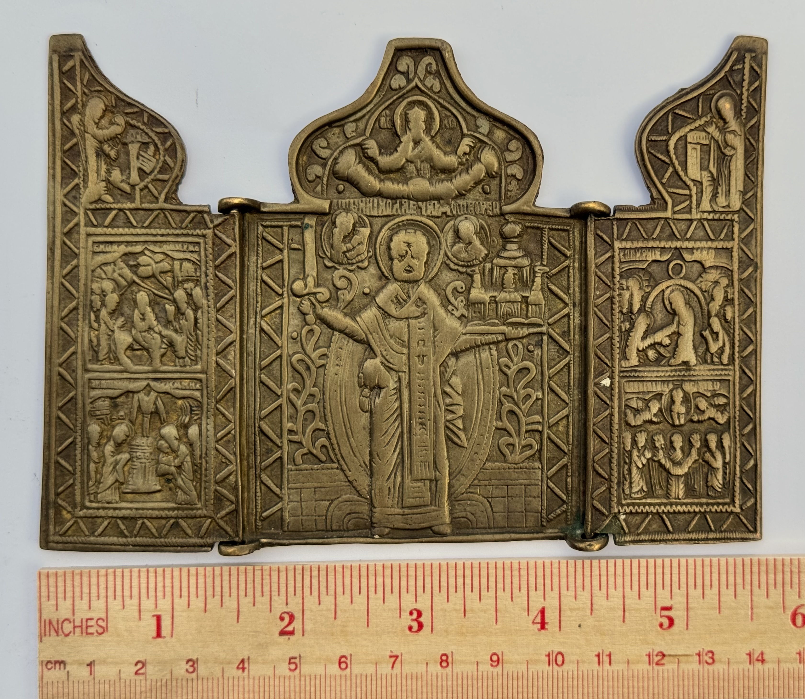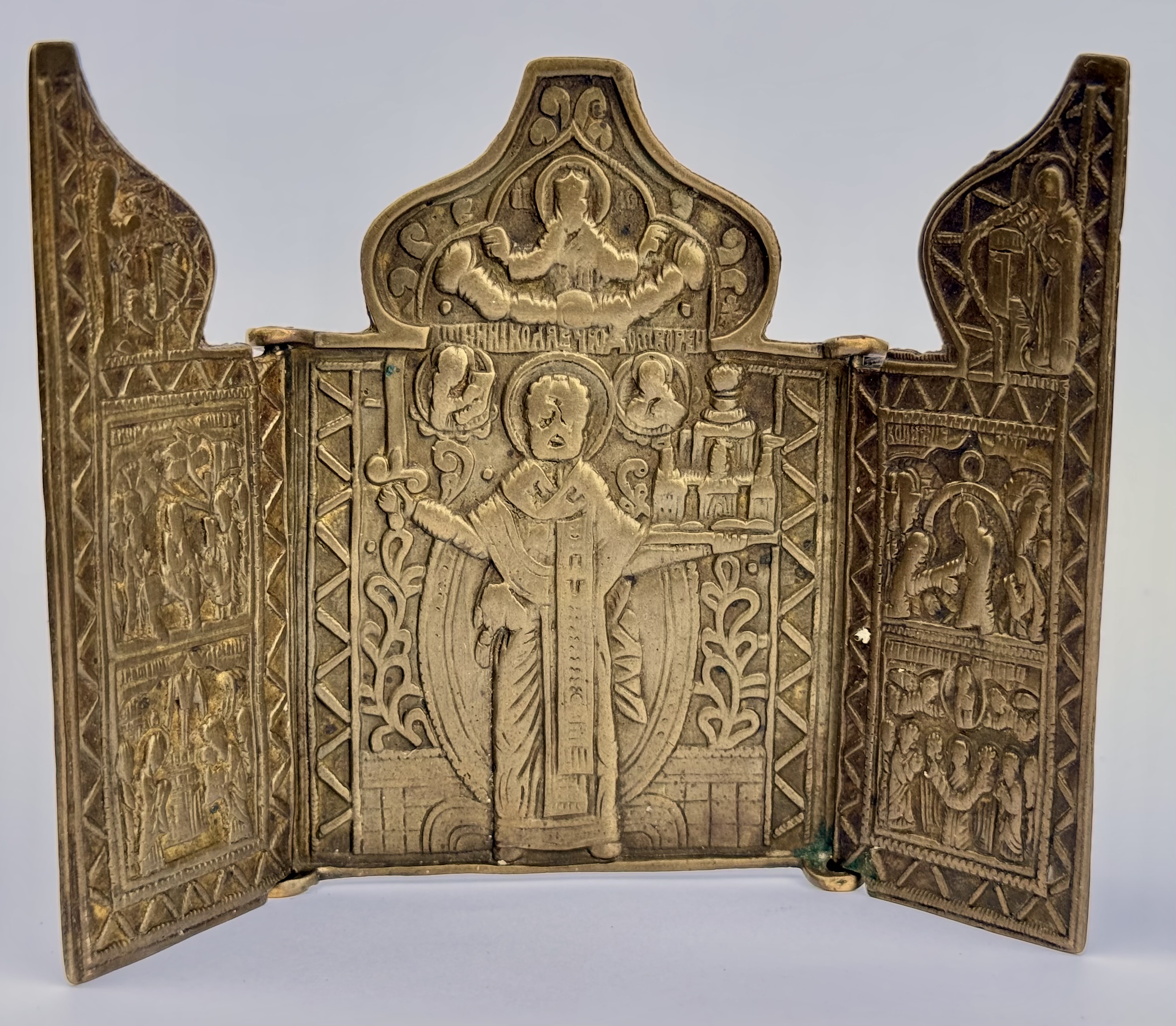 In Russia, Saint Nicholas the Wonderworker is often shown as Holy Hierarch Nicholas of Mozhaysk, depicting a full-length Nicholas with a sword in his right hand and a city in his left. According to the legend, during the 14th-century siege of Mozhaysk city by Mongols, the residents prayed to Saint Nicholas, who announced himself as a huge figure holding a sword in his right hand and the city of Mozhaisk in the palm of his left hand. After seeing such a frightful vision, the Mongols retreated. The grateful citizen erected a wooden monument to Saint Nicholas as he was seen during his announcement.