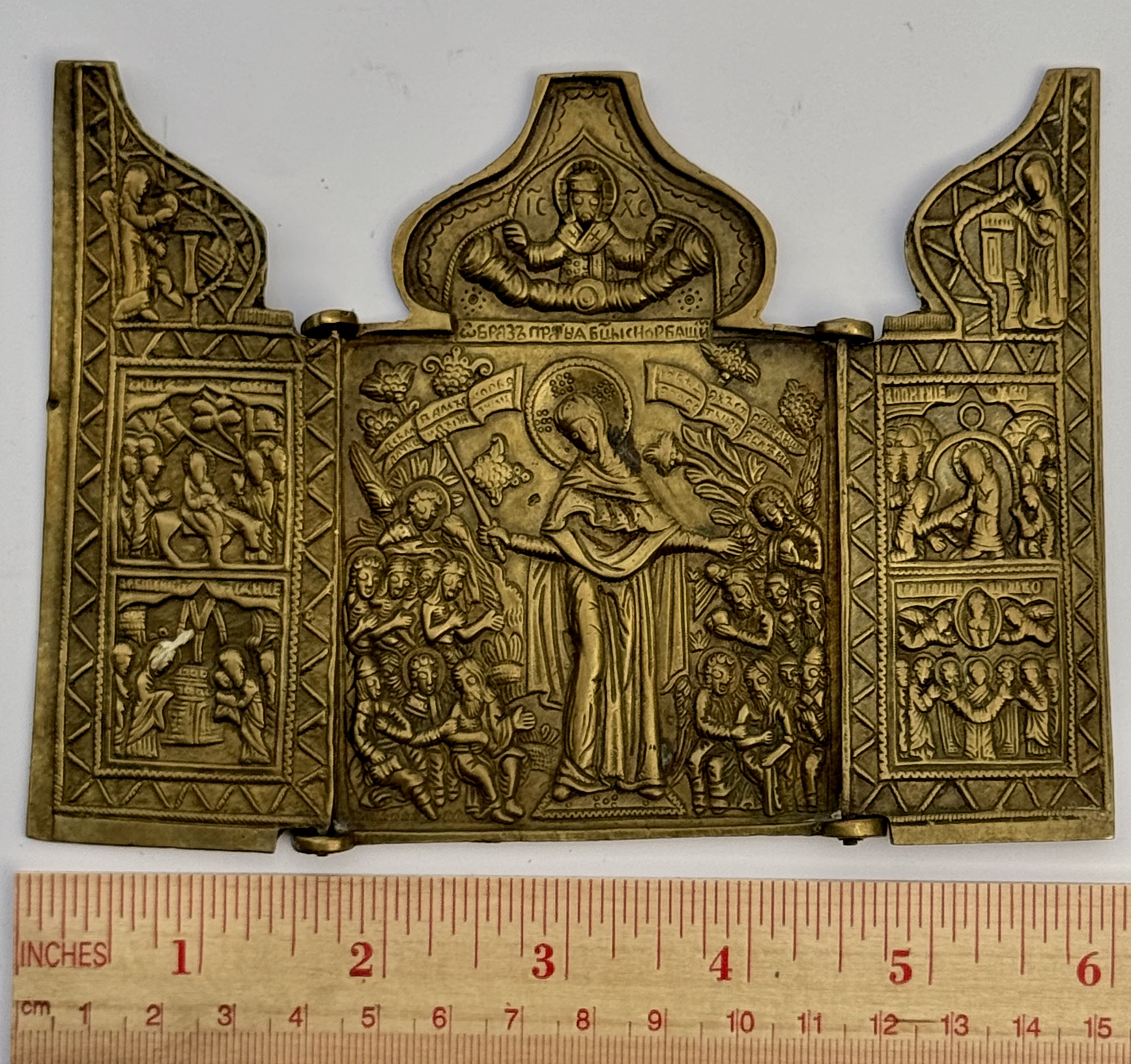 A three-panel folding cast-brass travel icon depicting Joy to All Who Sorrow Madonna under an image of God the Father in Heavens shown in the central panel, with four Orthodox Feasts on side panels: Entry into Jerusalem, Presentation at the Temple, Descent into Hades, and the Ascension, surrounded by the scene of the Annunciation.