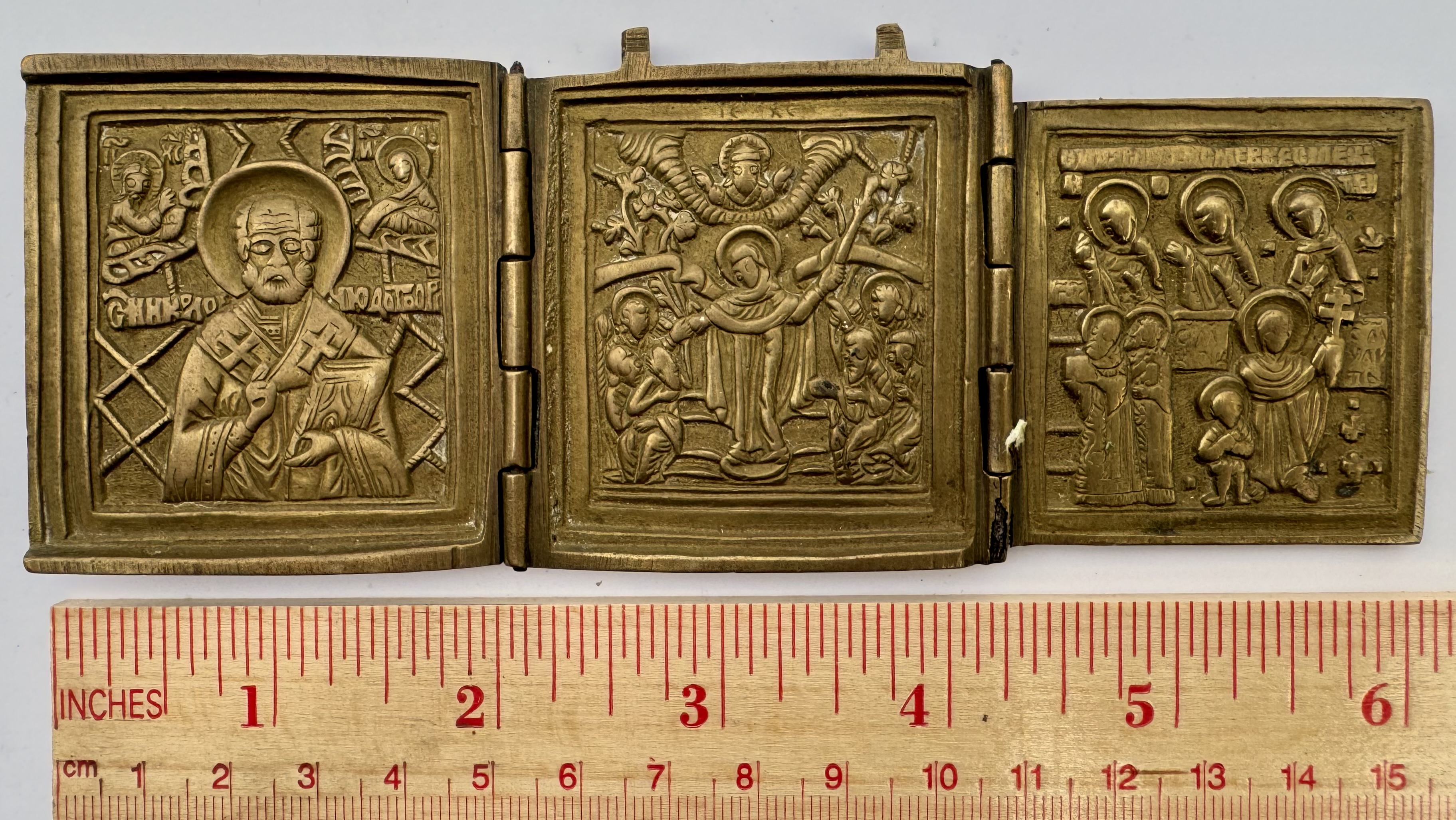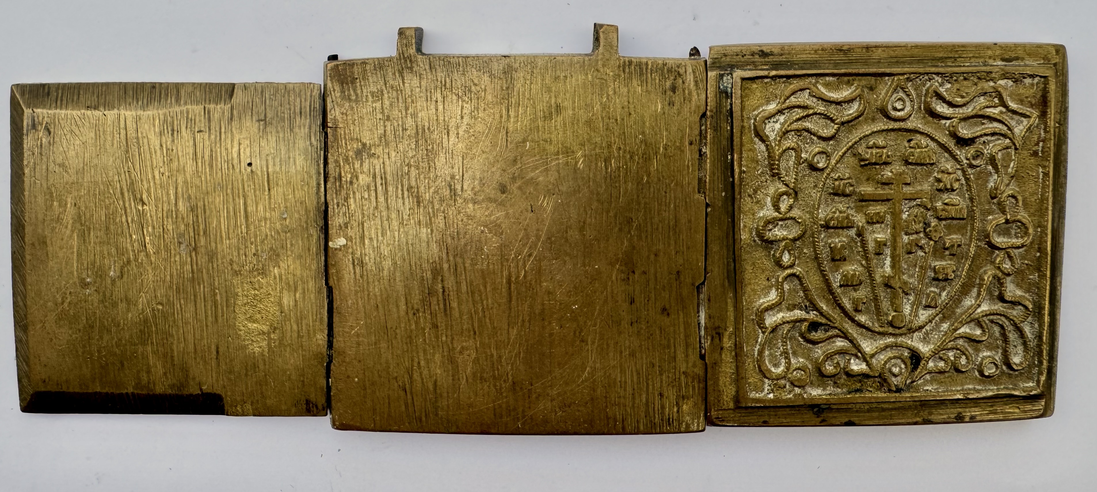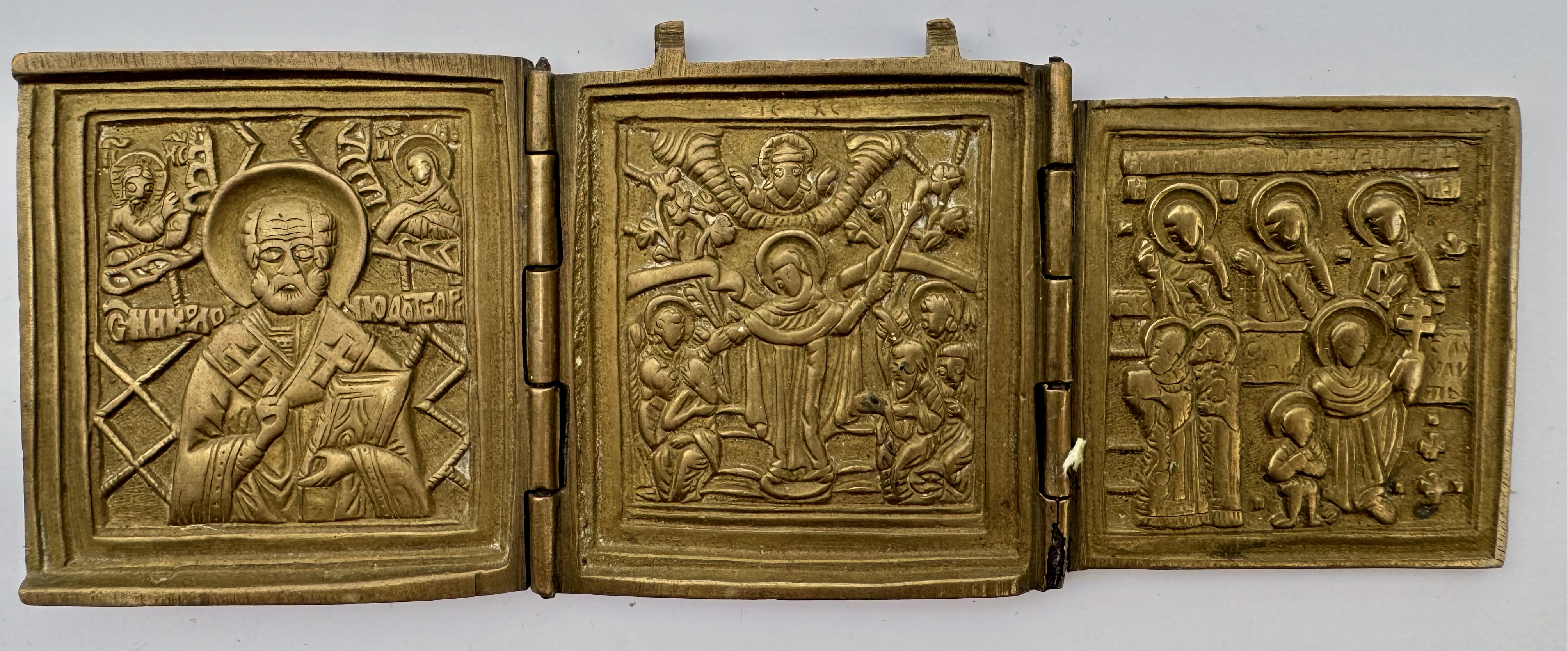 Three-panel cast-brass folding travel icon depicting (left to right): Saint Nicholas the Wonderworker of Myra, Our Lady of Joy to All who Sorrow, and Selected Saints. The backside depicts the Golgotha cross with the instruments of the Passion.