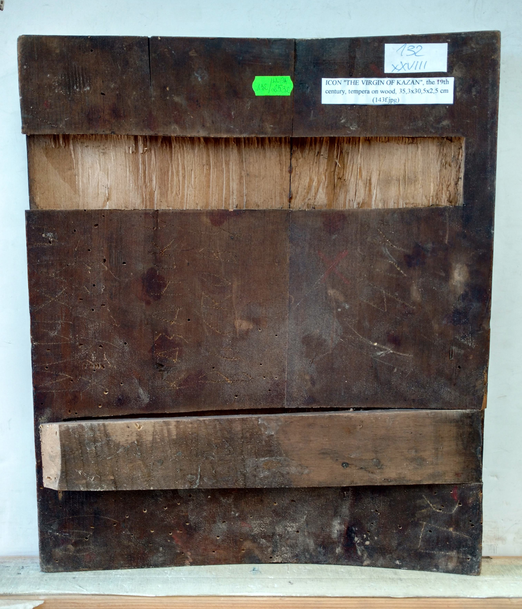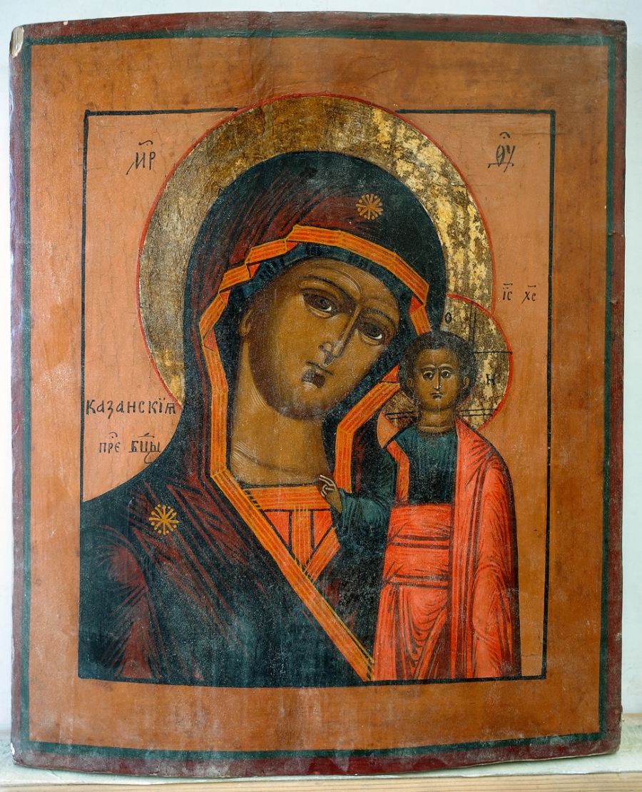 Our Lady of Kazan, is a holy icon of the highest stature within the Russian Orthodox Church and considered a palladium of Russia for centuries, until its theft and likely destruction in 1904. The icon represents the Virgin Mary as the protector and patroness of the city of Kazan. It is a close-up variant of the Hodegetria (Directress) style, it is noted mainly for the Child standing, with the Virgin chest-length. The Kazan icons are traditionally small, following the original. The Kazan icon was very popular in Russia, especially as a wedding gift, and many copies were made in the design of the original. Two major Kazan Cathedrals, in Moscow and St. Petersburg, are consecrated to Our Lady of Kazan, as are numerous churches throughout the land. Her feast days are July 21 and November 4.