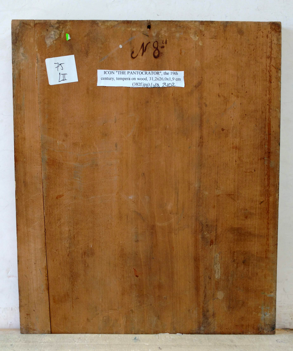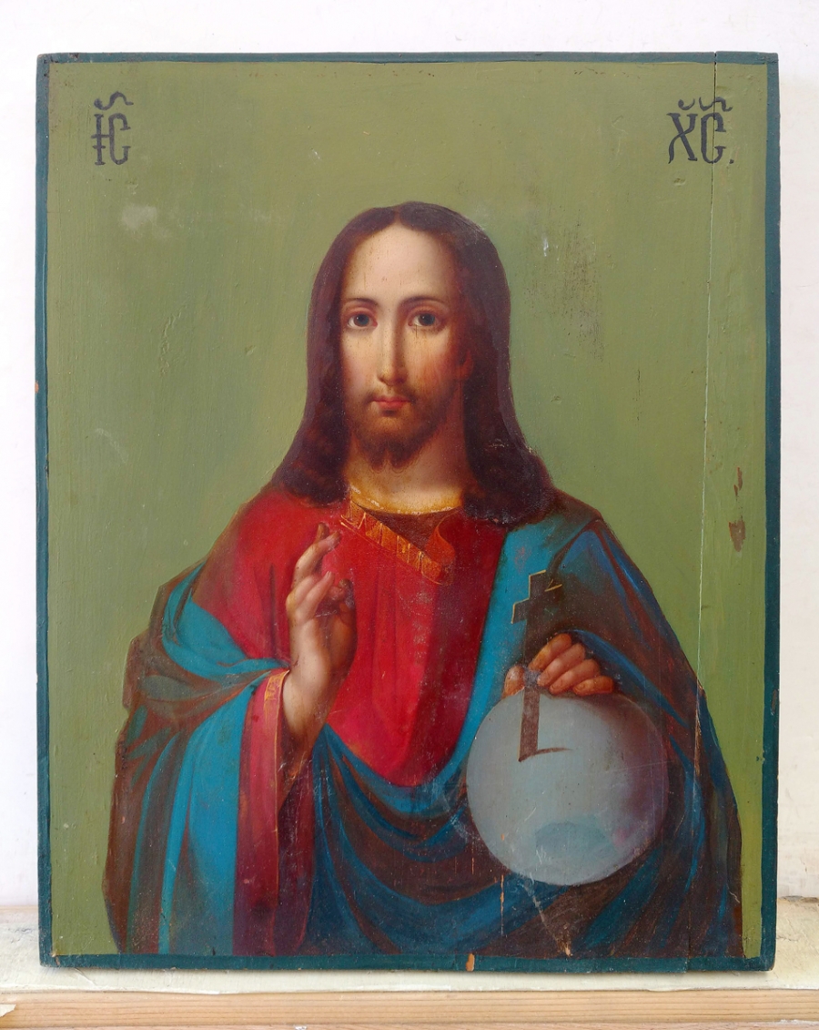 The icon depicts realistically rendered Christ as Pantocrator ( "Almighty" or "All-powerful") - pictured half-figured blessing with his right hand while holding an Orb and a Cross in his left hand