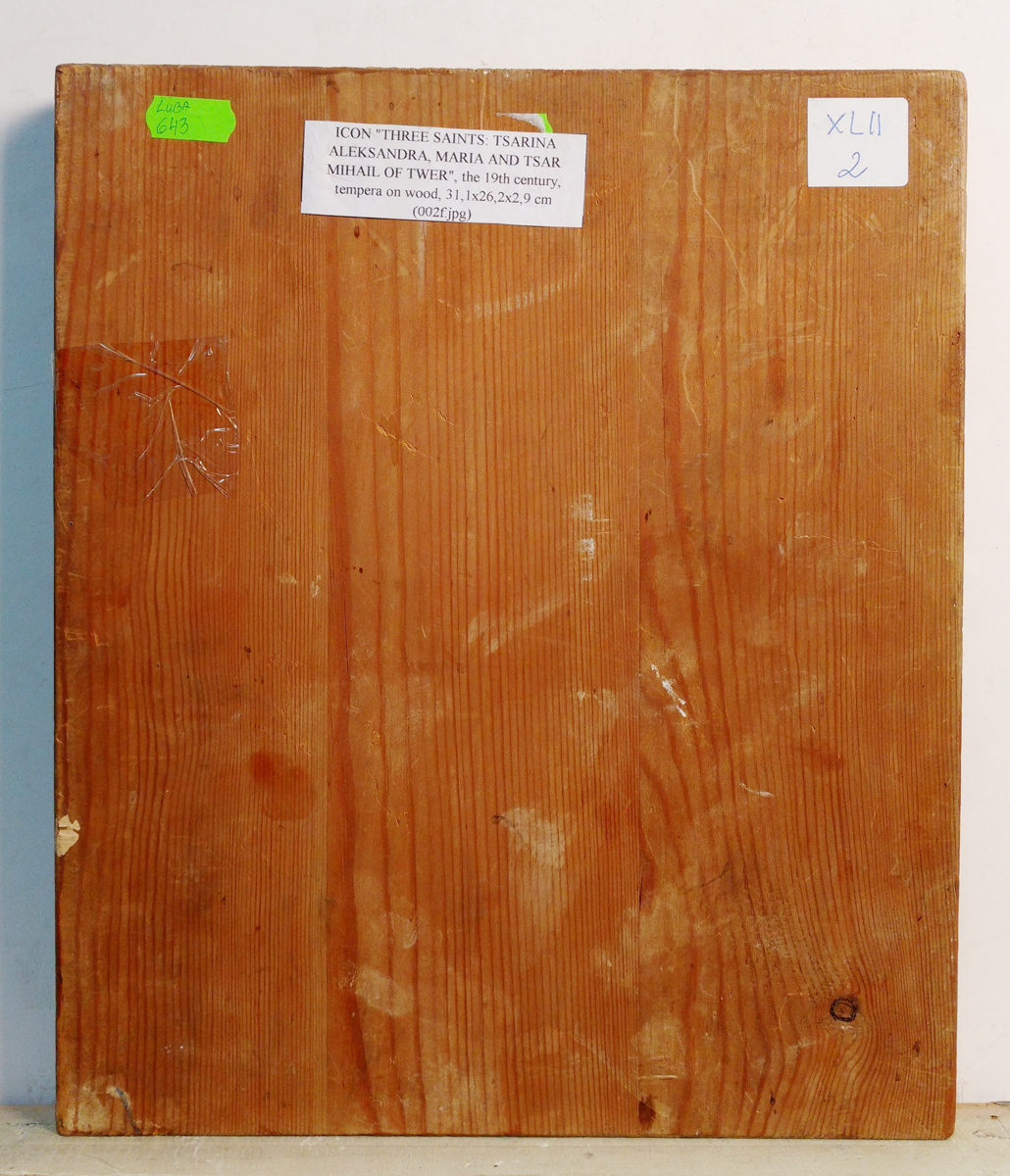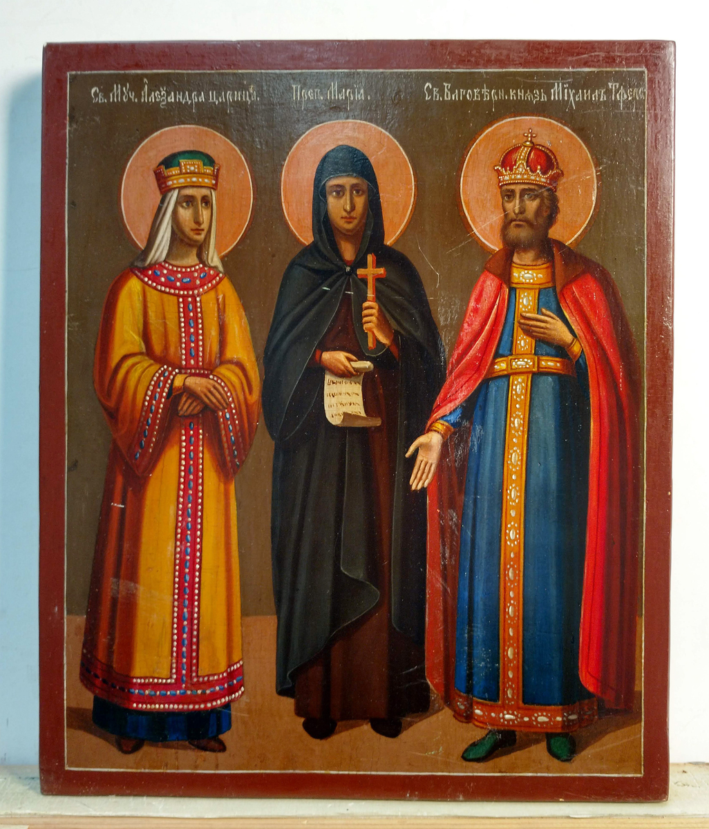 Icon depicts three Orthodox saints painted full figured - Saint Empress Martyr Alexandra of Rome , Blessed Maria, and Russian Prince Mikhail of Tver.