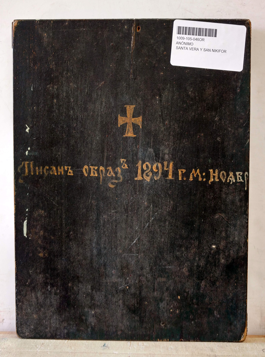 Russian icon depicting two Orthodox Saints: Holy Martyress Vera & SaintNicephorus, Patriarch of Constantinople depicted full-figured in Provincial style and inscribed on the back in Slavonic "This icon is painted in the year of 1894".