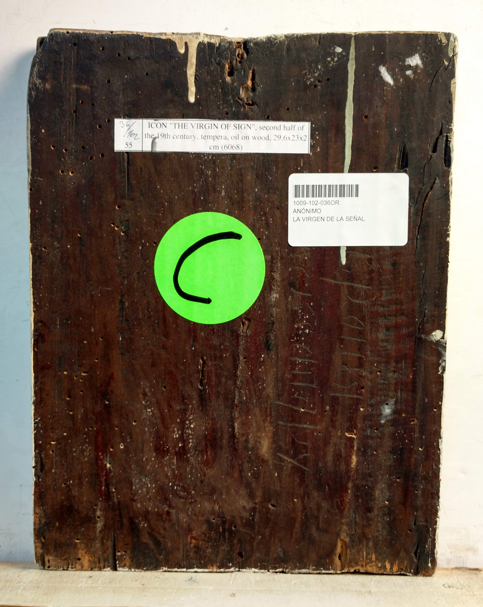 Our Lady of the Sign is one of the most beloved Russian miracleworking icons of Theotokos. The icon depicts the her during the Annunciation at the moment of saying, "May it be done to me according to your word." (Luke 1:38). The Virgin Mary is depicted frontally  half-length, with her hands raised in praying position and the Child Jesus within a round aureole upon her breast representing him at the moment of his conception.  The term Virgin of the Sign is a reference to the prophecy of Isaiah 7:14: "Therefore the Lord himself shall give you a sign; Behold, a virgin shall conceive, and bear a son, and shall call his name Immanuel."