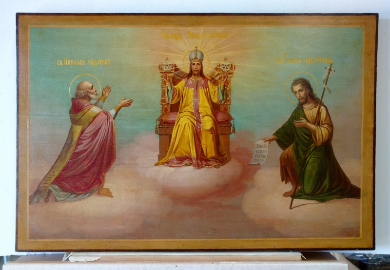This large icon depicts the Savior Enthroned flanked by St Nicholas of Myra and St John the Baptist.