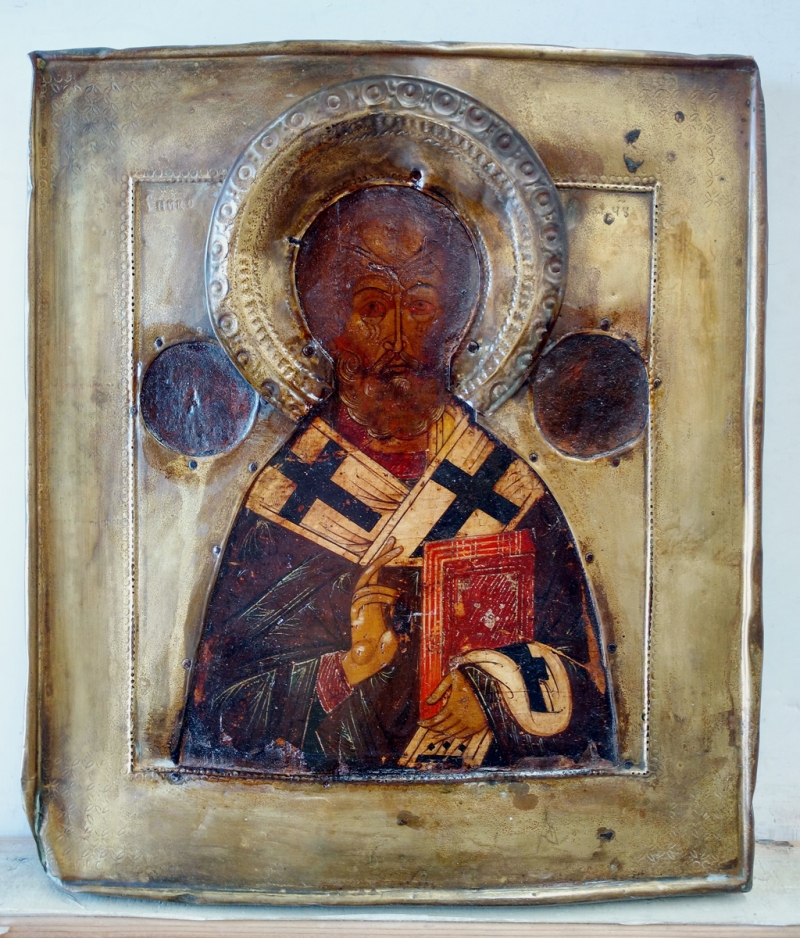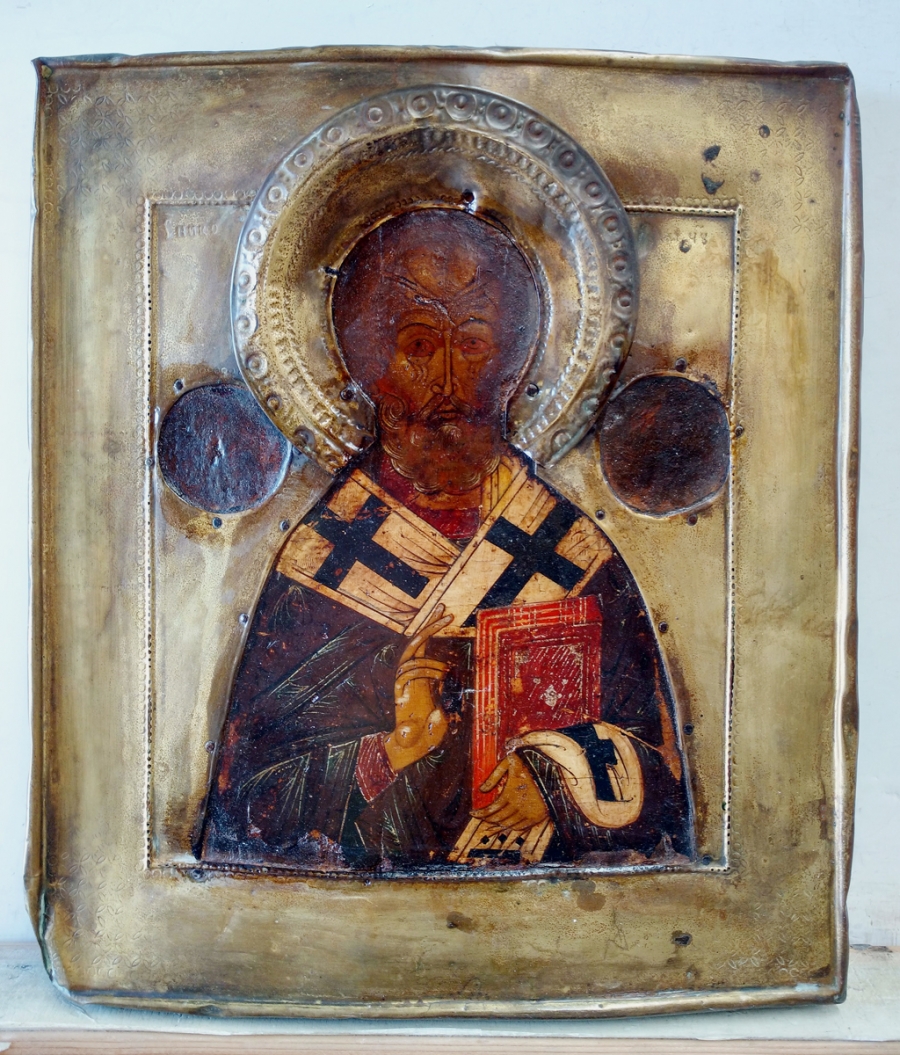 Russian icon - St. Nicholas of Myra in brass oklad cover
