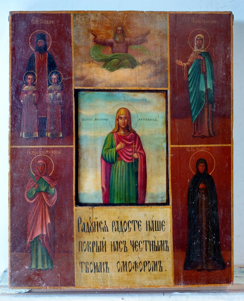 Small icon depicting St. Martyr Antonina of Constantinople inserted into a larger board depicting selected Saints surmounted by an image of God the Father: St. Theodore Prince of Smolensk with his sons, St. Greatmartyr Catherine, St. Pelagia, and St. Glyceria.