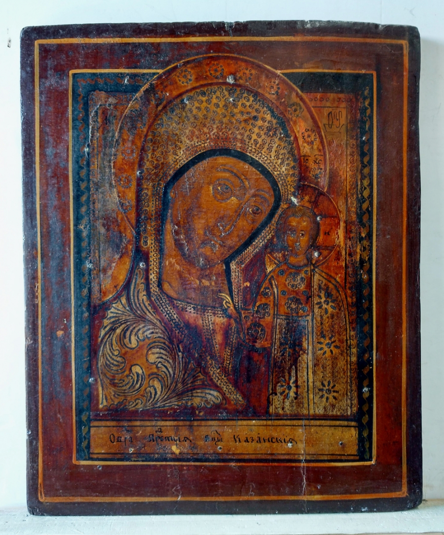 Our Lady of Kazan, is a holy icon of the highest stature within the Russian Orthodox Church and considered a palladium of Russia for centuries, until its theft and likely destruction in 1904. The icon represents the Virgin Mary as the protector and patroness of the city of Kazan. It is a close-up variant of the Hodegetria (Directress) style, it is noted mainly for the Child standing, with the Virgin chest-length. The Kazan icons are traditionally small, following the original. The Kazan icon was very popular in Russia, especially as a wedding gift, and many copies were made in the design of the original. Two major Kazan Cathedrals, in Moscow and St. Petersburg, are consecrated to Our Lady of Kazan, as are numerous churches throughout the land. Her feast days are July 21 and November 4.