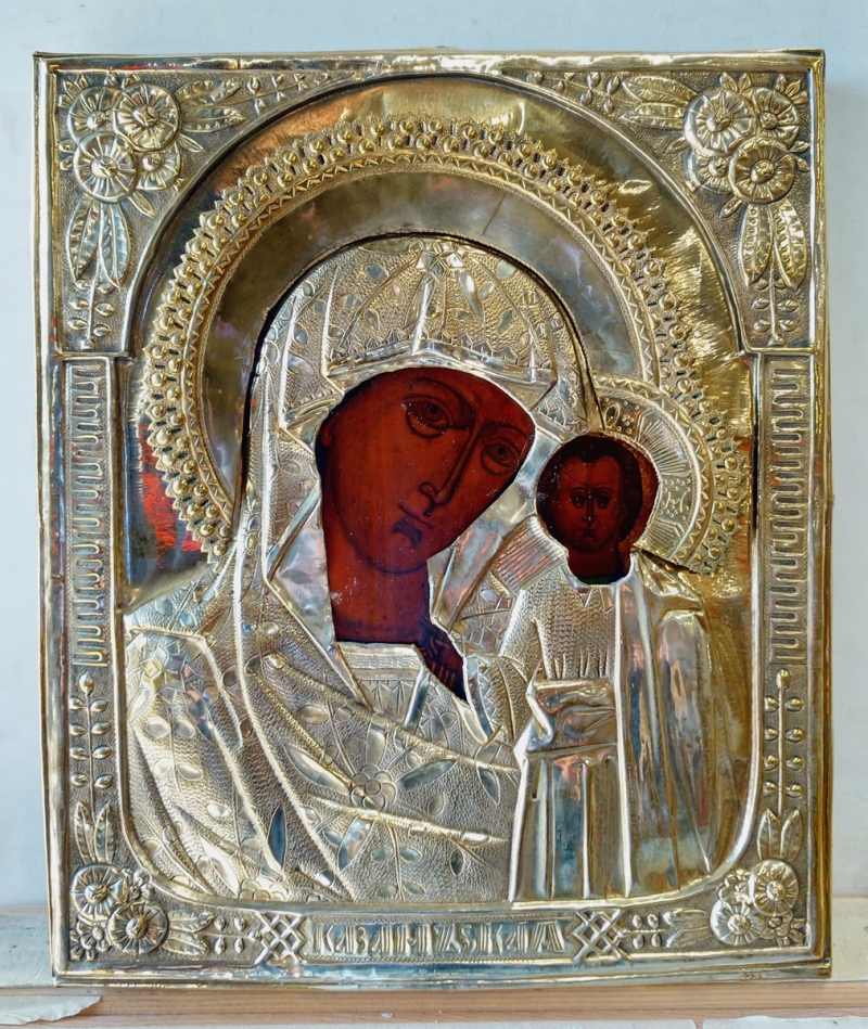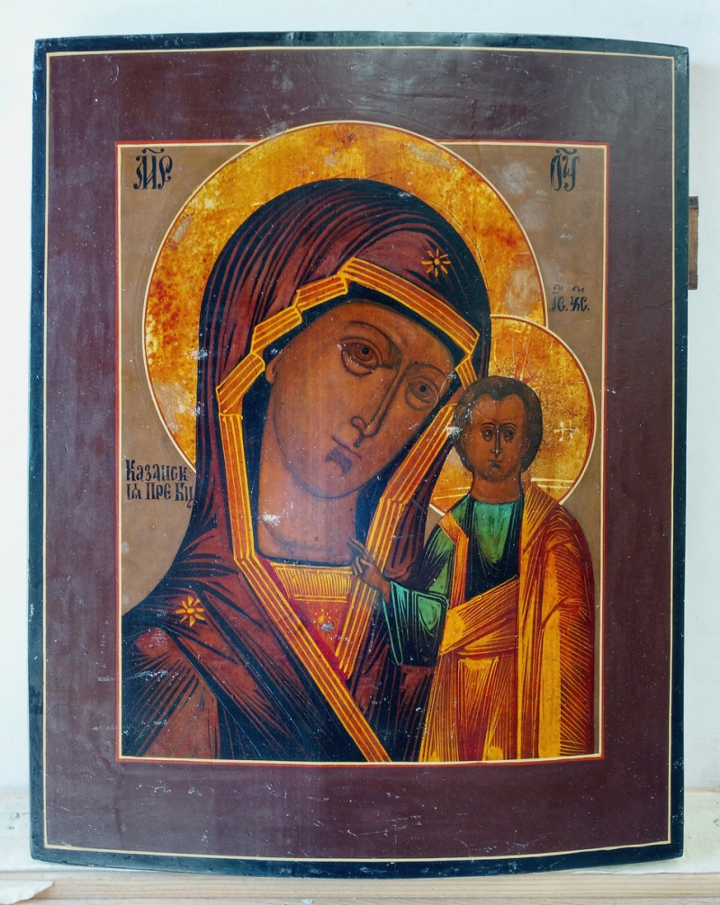 Our Lady of Kazan is a holy icon of the highest stature within the Russian Orthodox Church and considered a palladium of Russia for centuries, until its theft and likely destruction in 1904. The icon represents the Virgin Mary as the protector and patroness of the city of Kazan. It is a close-up variant of the Hodegetria (Directress) style, it is noted mainly for the Child standing, with the Virgin chest-length. The Kazan icons are traditionally small, following the original. The Kazan icon was very popular in Russia, especially as a wedding gift, and many copies were made in the design of the original. Two major Kazan Cathedrals, in Moscow and St. Petersburg, are consecrated to Our Lady of Kazan, as are numerous churches throughout the land. Her feast days are July 21 and November 4.