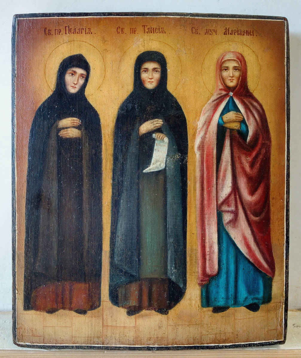 The icon is depicting three full-figured female saints: St. Pelagia of Antioch & St. Tais of Egypt (two repentant saints sharing the same feast day of October 8), and St. Martyress Mariana.